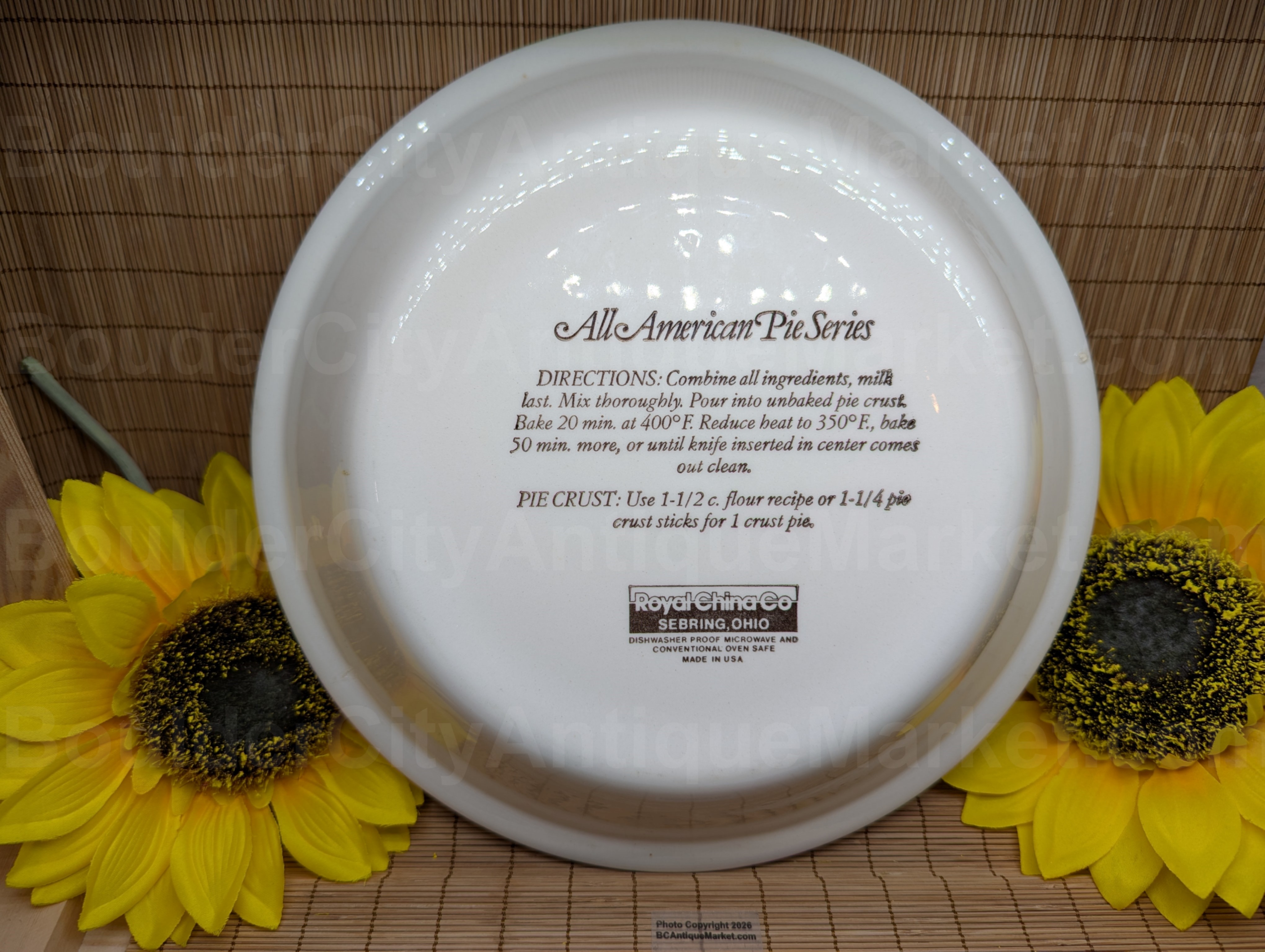 All American Pumpkin Pie dish was manufactured by Royal China between 1980 and 1989. It was part of the Country Harvest or All American Pie series manufactured by the company in Sebring, Ohio. It is 10.75-inches in diameter and is 2-inches deep. This piece does have a small piece of extra ceramic in the glaze under the rim that is not noticeable on display-please see pictures for details.