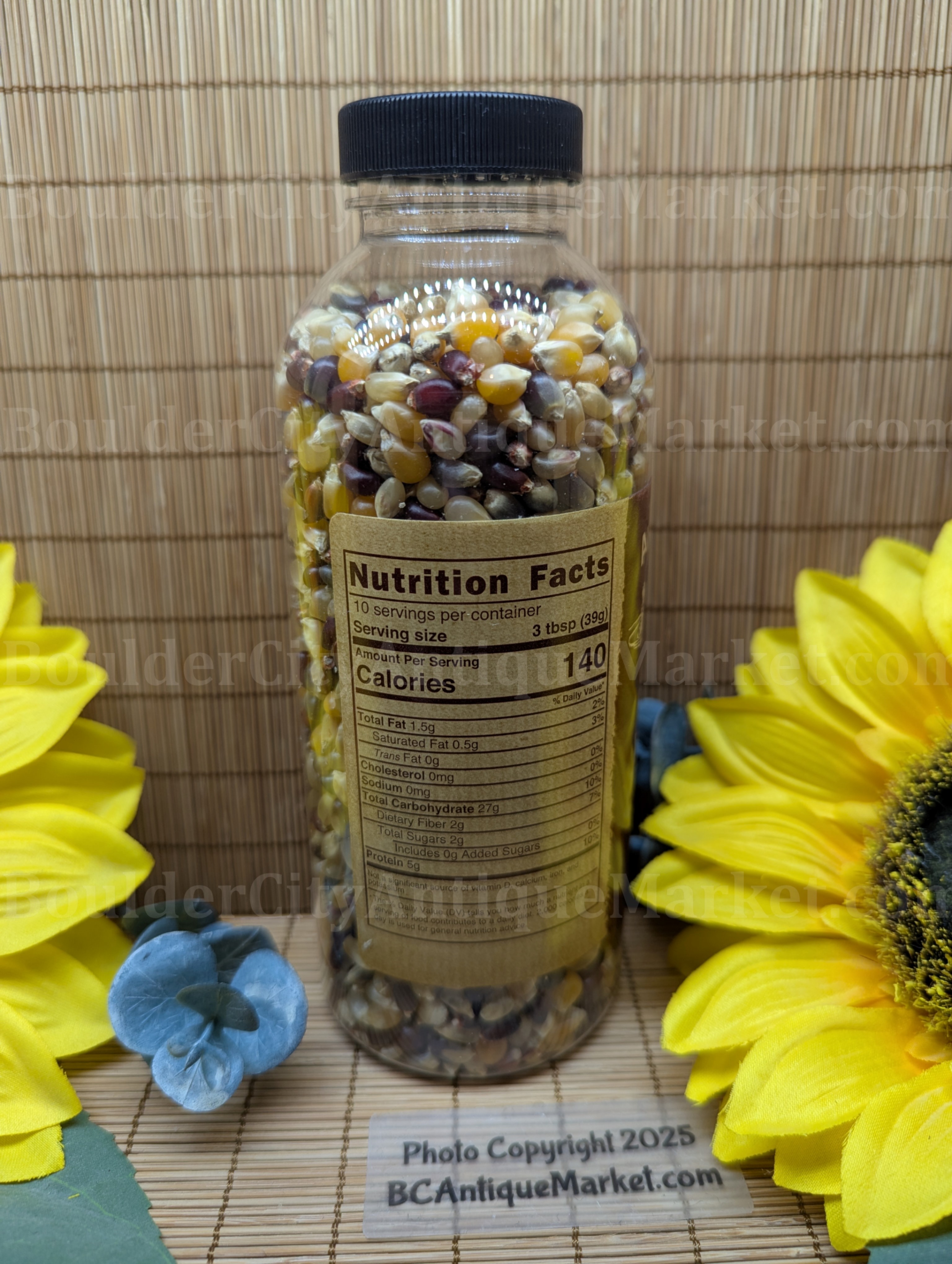 Shake it up! Our Rainbow variety is a fun unique blend of our most popular varieties, finished popcorn is snowy white and has fewer hulls overall, with a variety of yellow, blue and red hulls. 14 oz bottle makes 10 servings at 140 calories per serving.