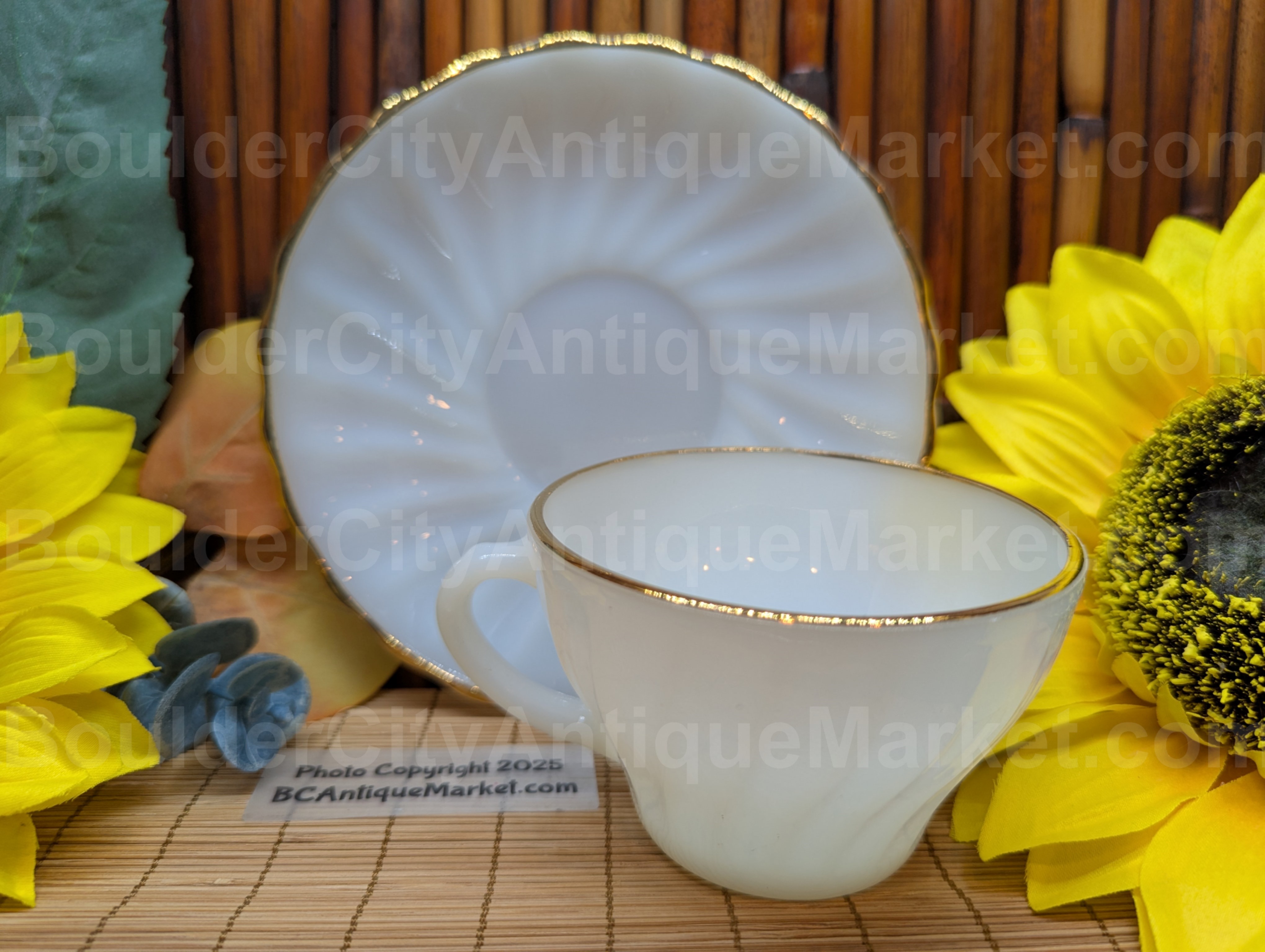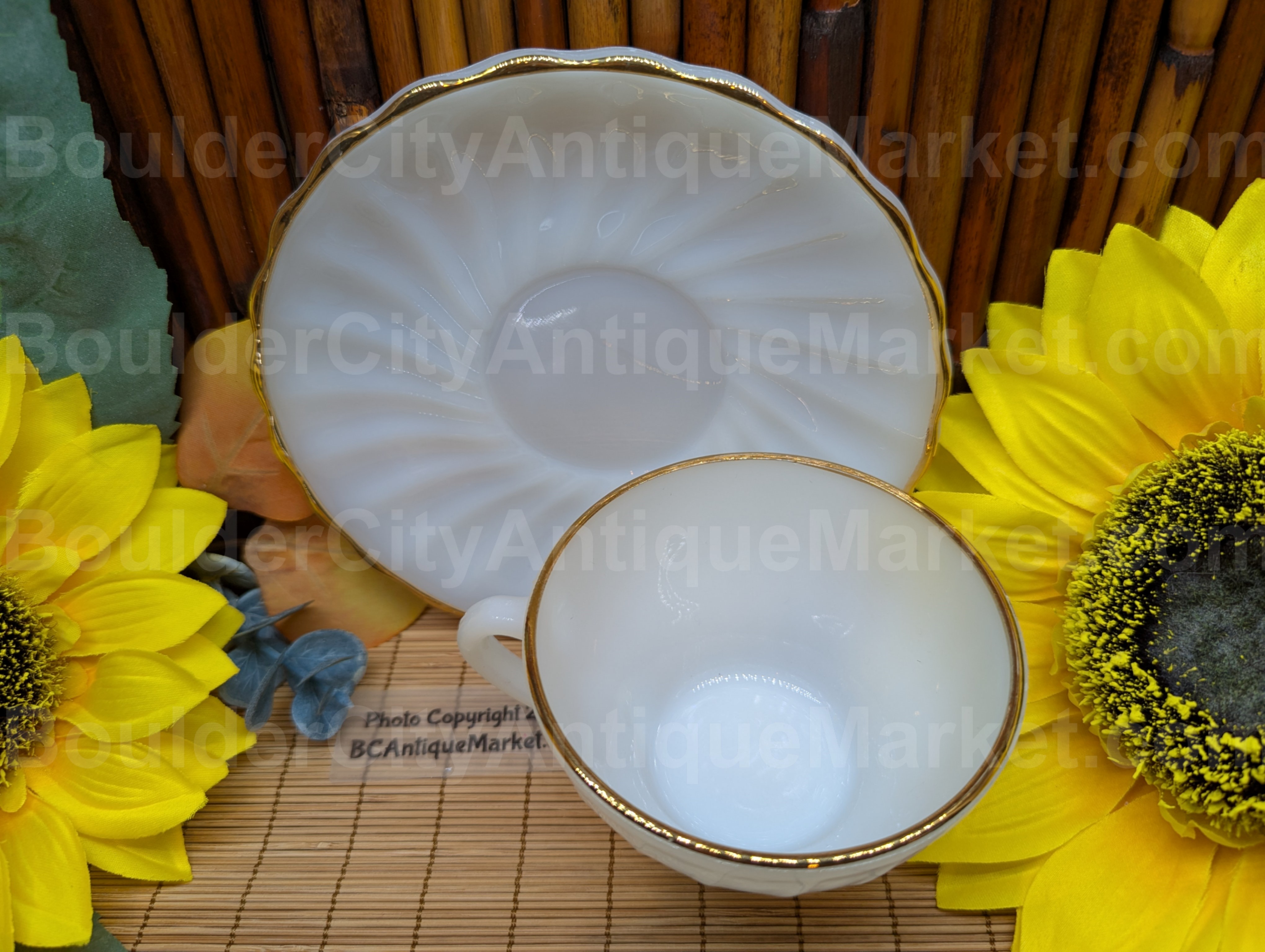 Anchor Hocking Fire King Golden Shell cup and saucer set from the 1950s to 1960s. Milk glass combined with thick gold detailing on the rims of the 3.75-inch cup and 6-inch diameter saucer. On this set the shell pattern goes seamlessly to the rim of the cup.