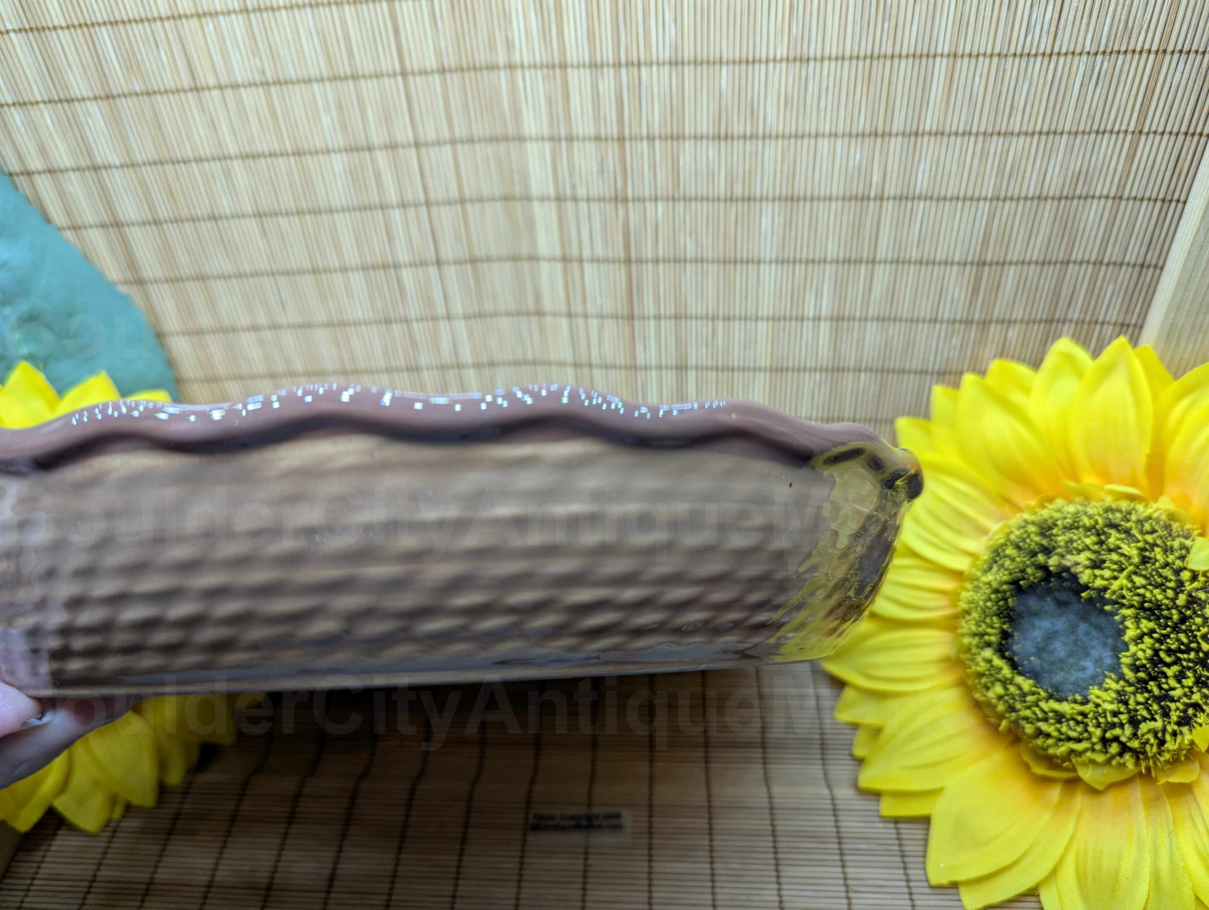 Apple Pie Recipe Plate with basket weave side and brown rim around the dish. Dish measures 9.75-inches in diameter and 1.75-inches deep. No marks on plate so we don’t know the age. Some crazing has been noted.