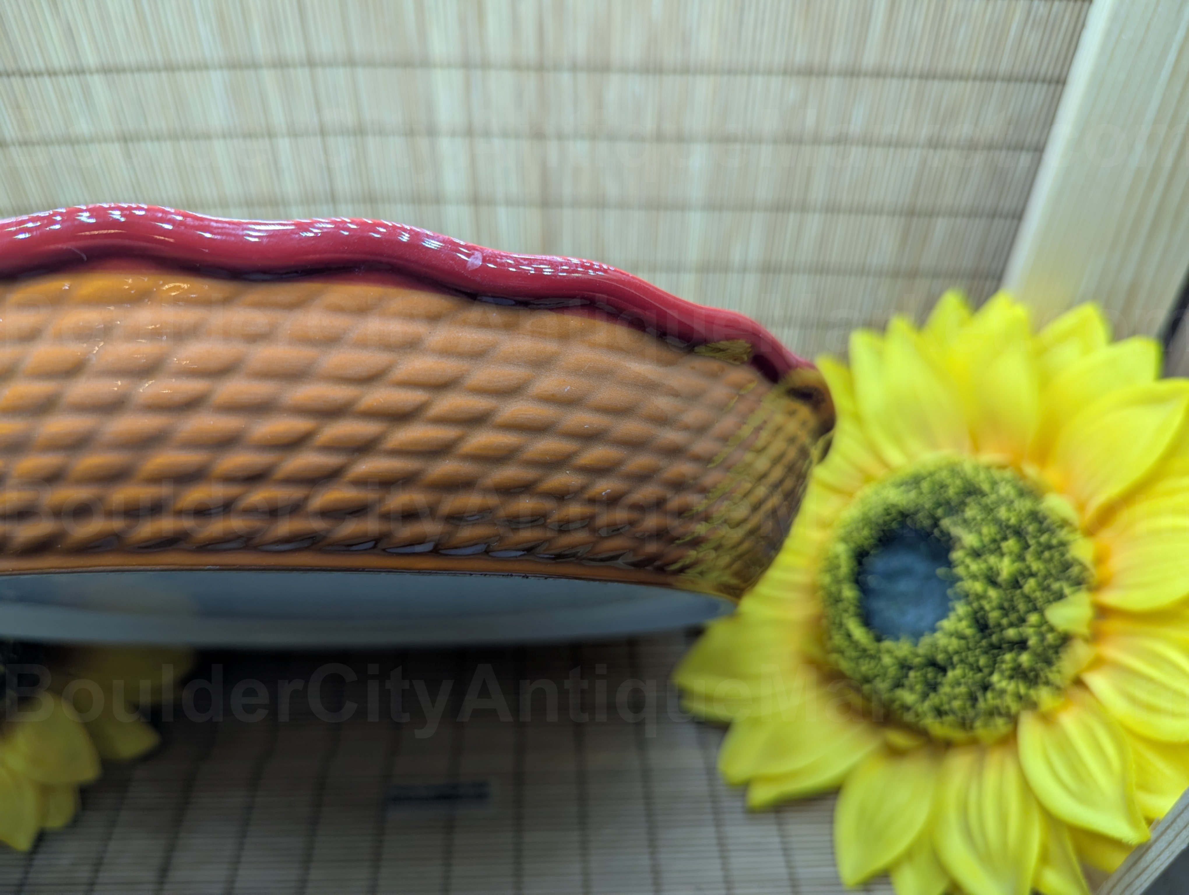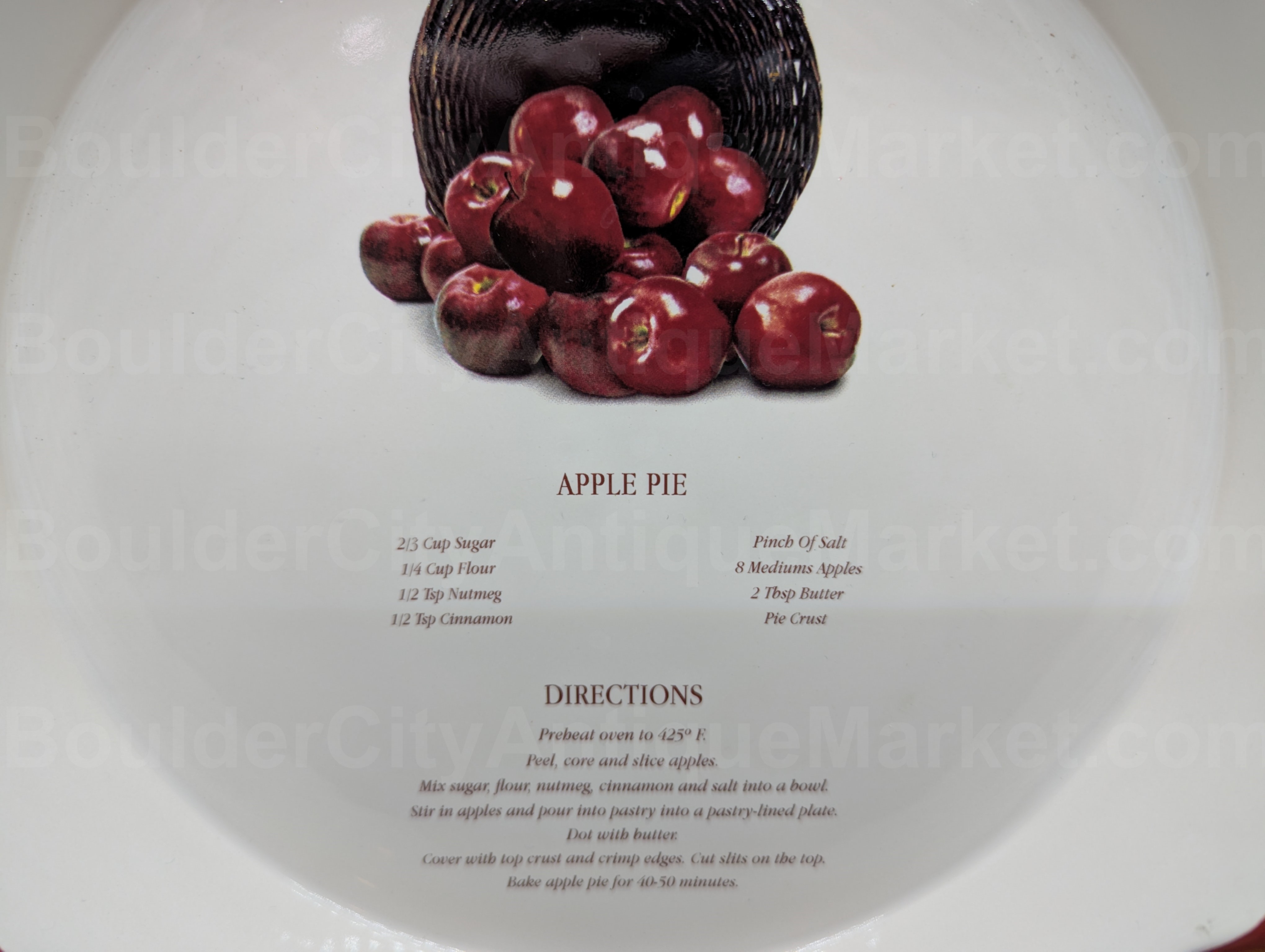 Apple Pie Recipe Plate with basket weave side and red lip around the dish.  Dish measures 9.75-inches in diameter and 1.75-inches deep. No marks on plate so we don’t know the age.