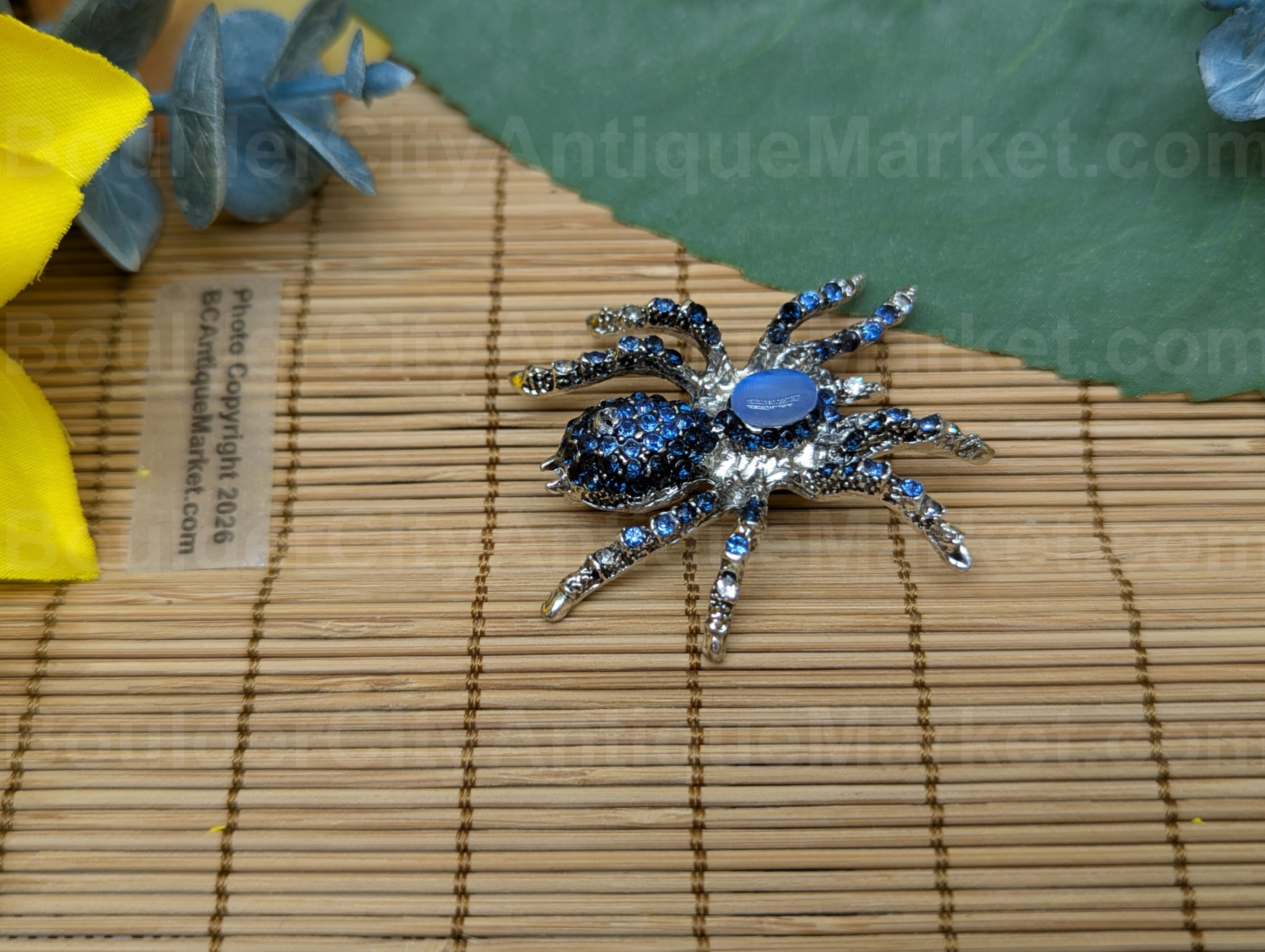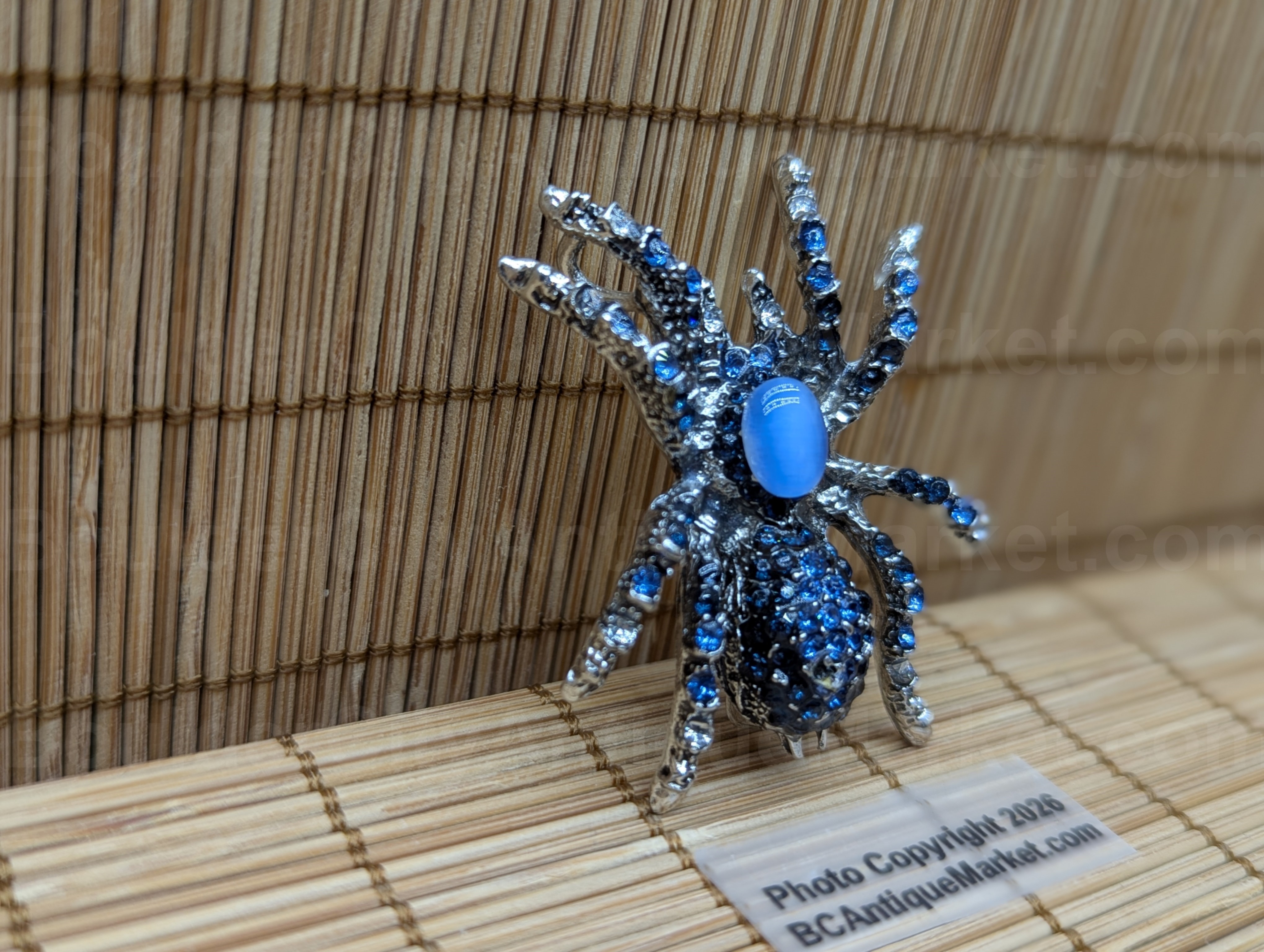 An artificial light blue cat’s eye gem forms the carapace of this blue rhinestone spider. The body and spinnerets are silver, the rhinestones on the abdomen, legs and pedipalps are blue. She is a little over 1.75-inches in length.