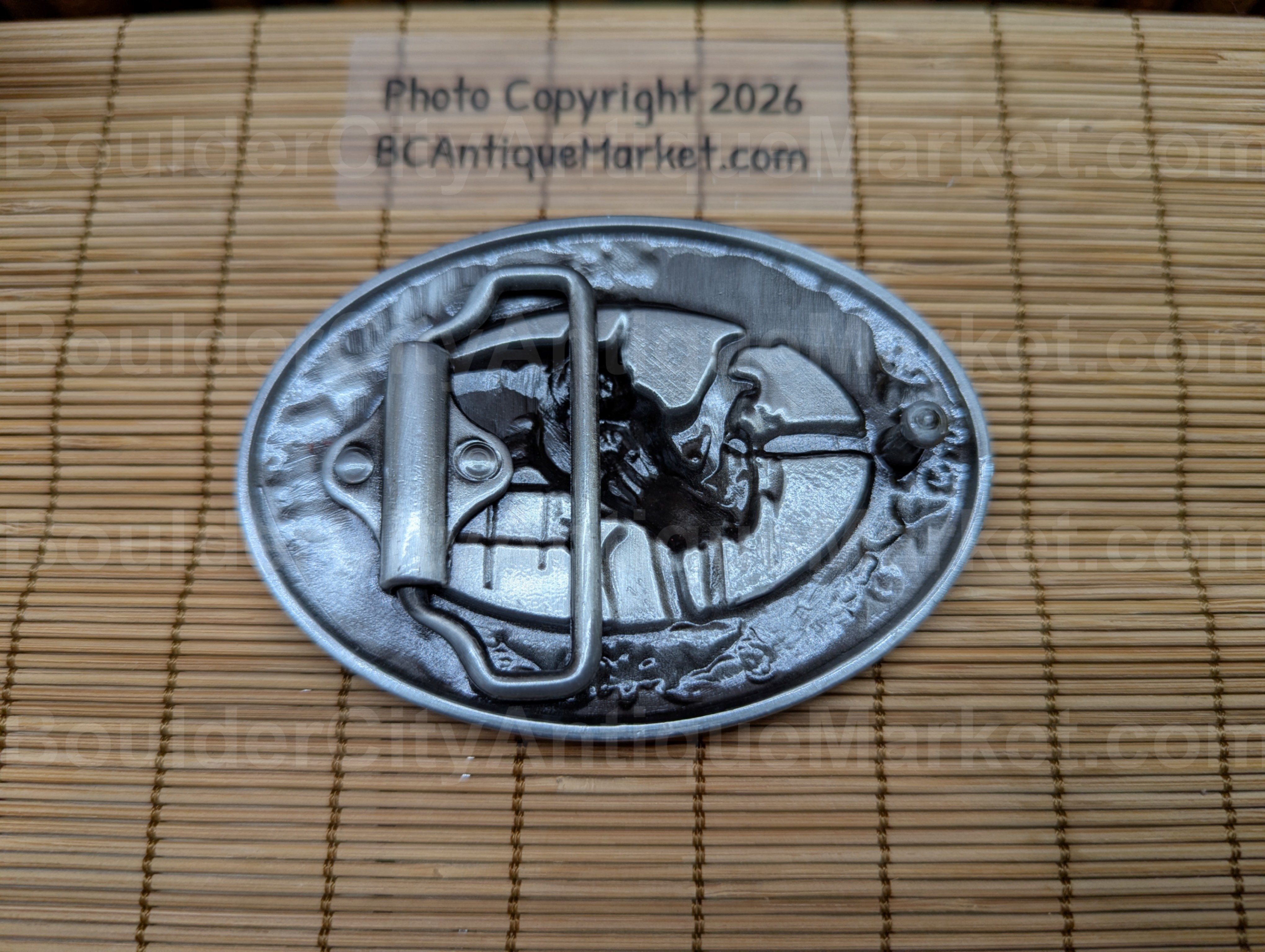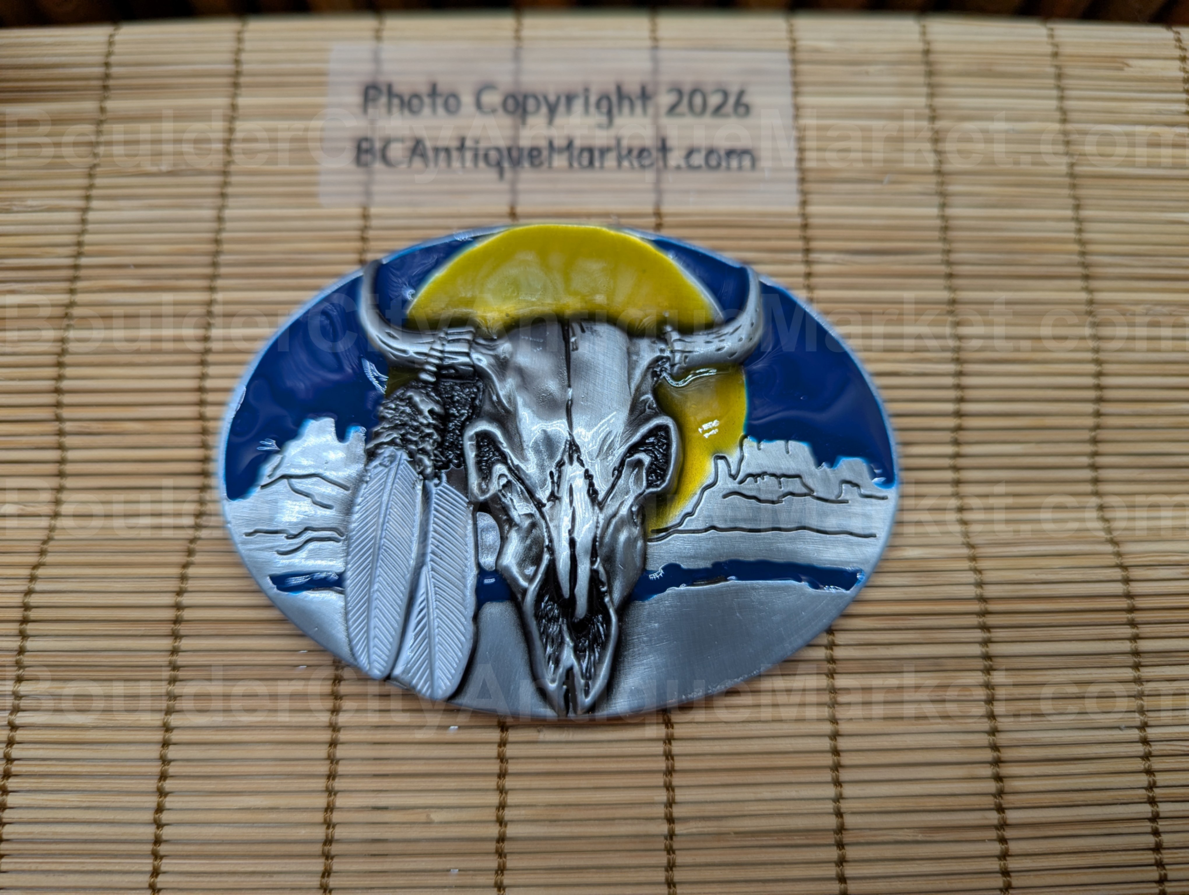 This 2.5-inch high and 3.25-inch long oval belt buckle features a buffalo skull front center, mesas in the background, blue sky and river enamel detail, and a large yellow sun (or moon) behind the skull.