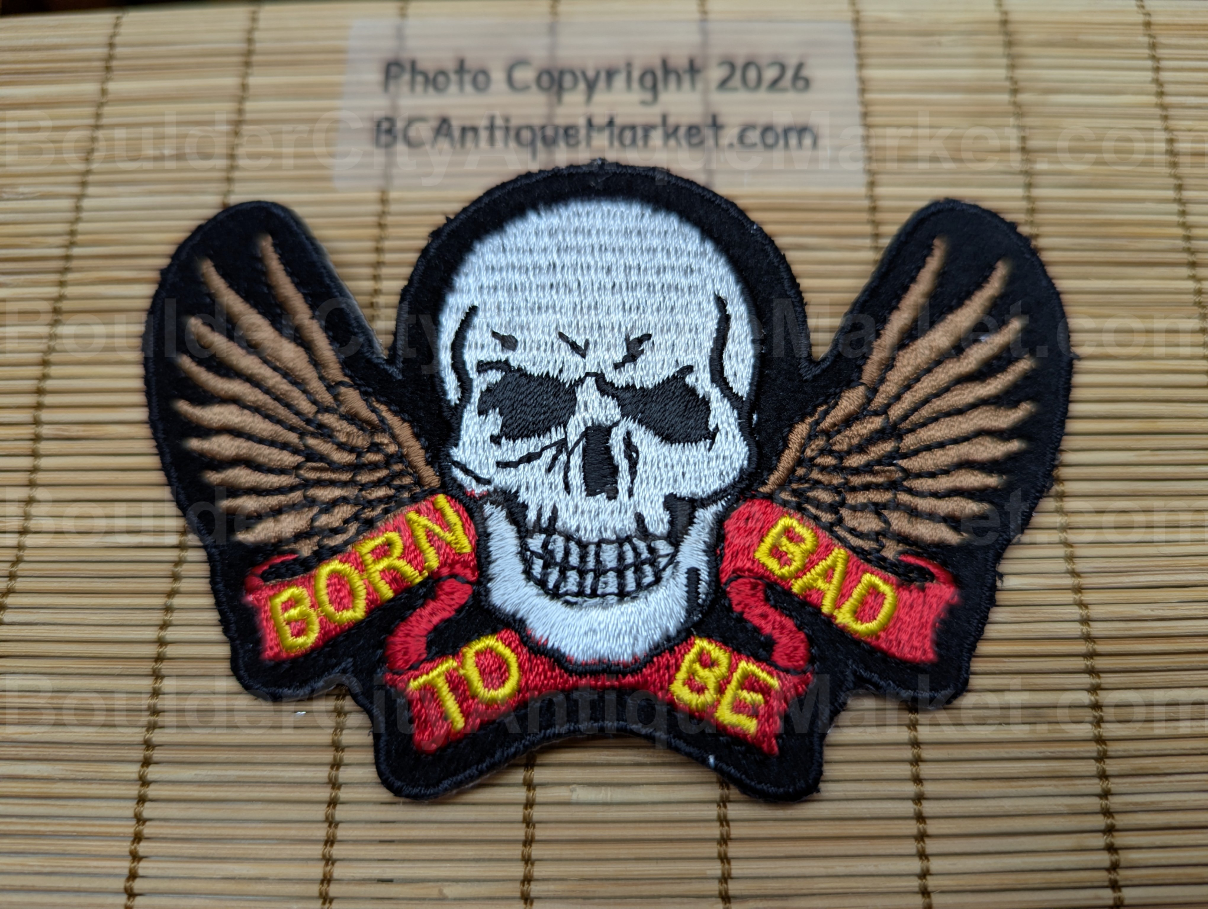 Born To Be Bad Iron On patch measures approximately 2.75-inches tall and 4.25-inches wide.