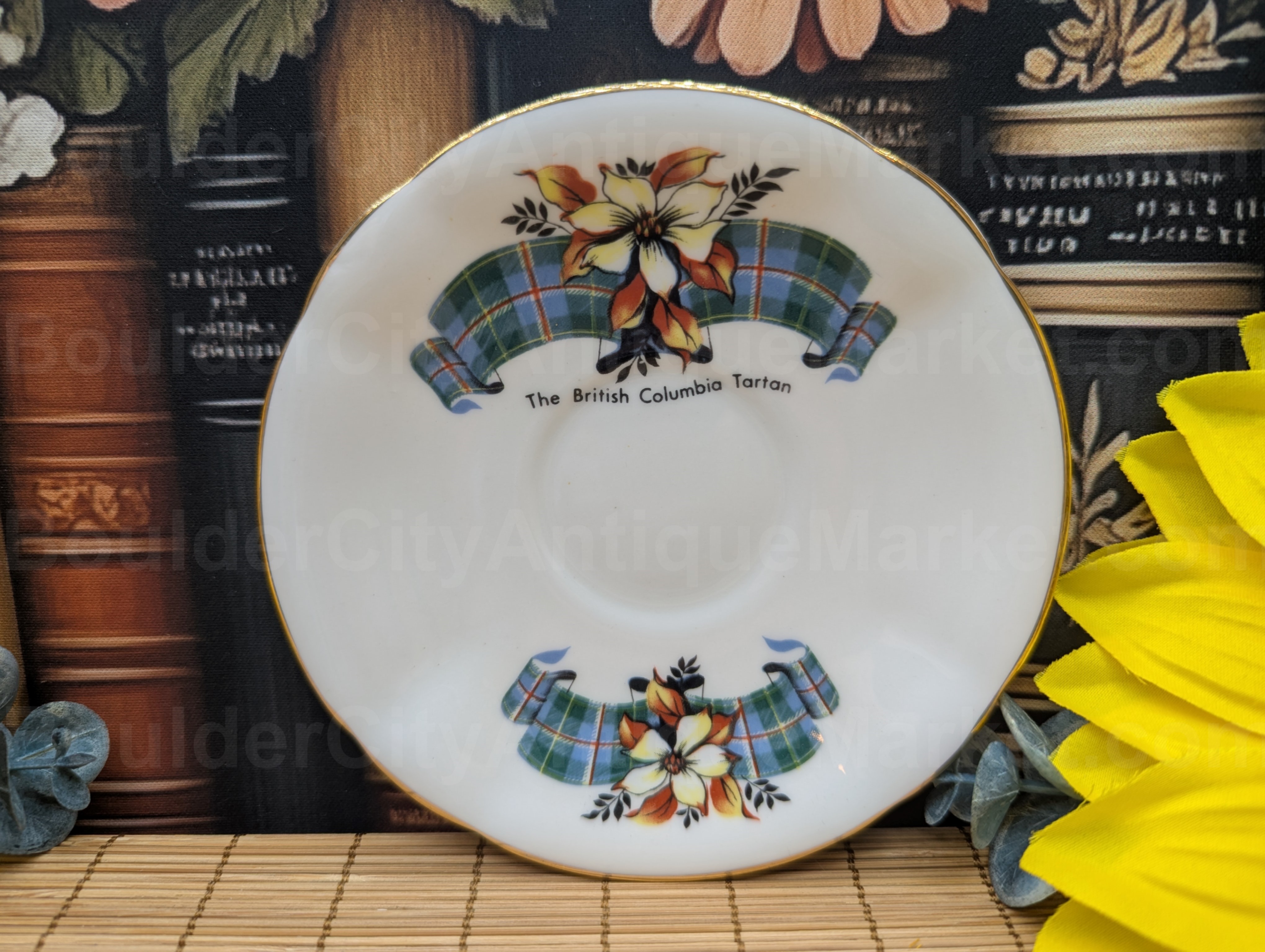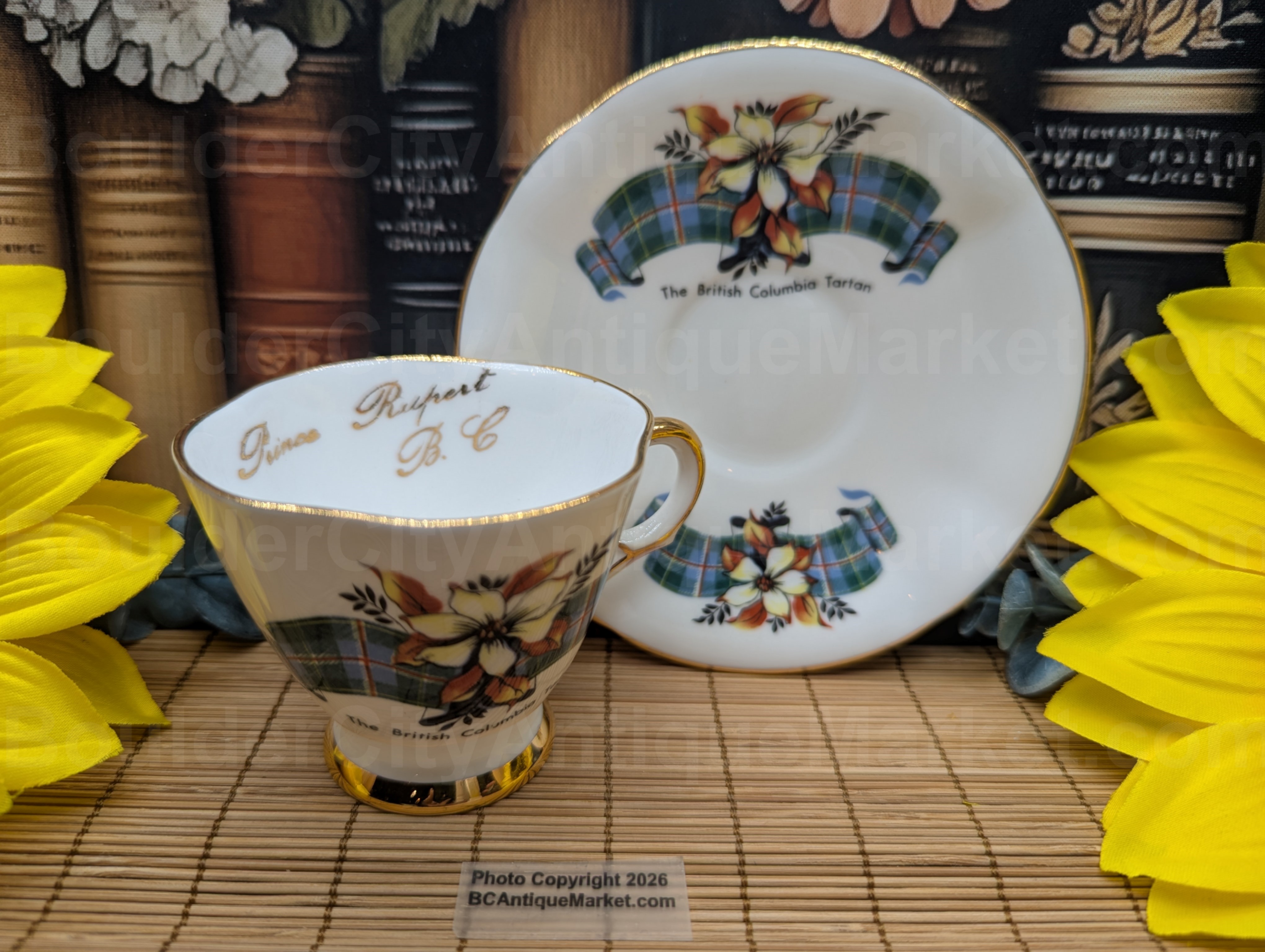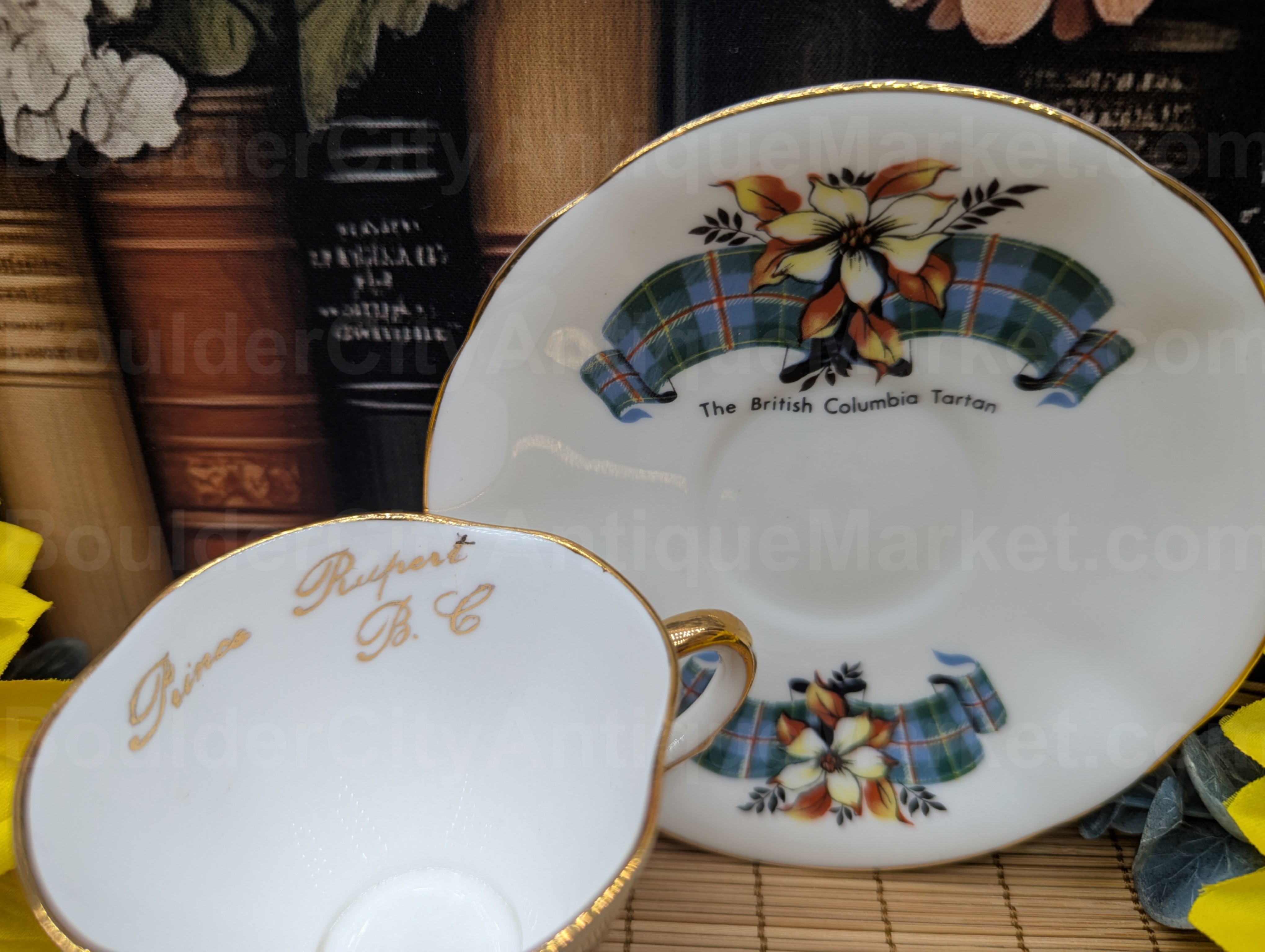 Demitasse cup showcasing the British Columbia Tartan pattern. Marked inside with Prince Rupert B.C. Gold edged on the 4.5-inch diameter scalloped saucer, the 2.75-inch scalloped diameter cup has gold on the rim, handle, inside and foot. Slight wear on the U in Columbia on the teacup, please check pictures.