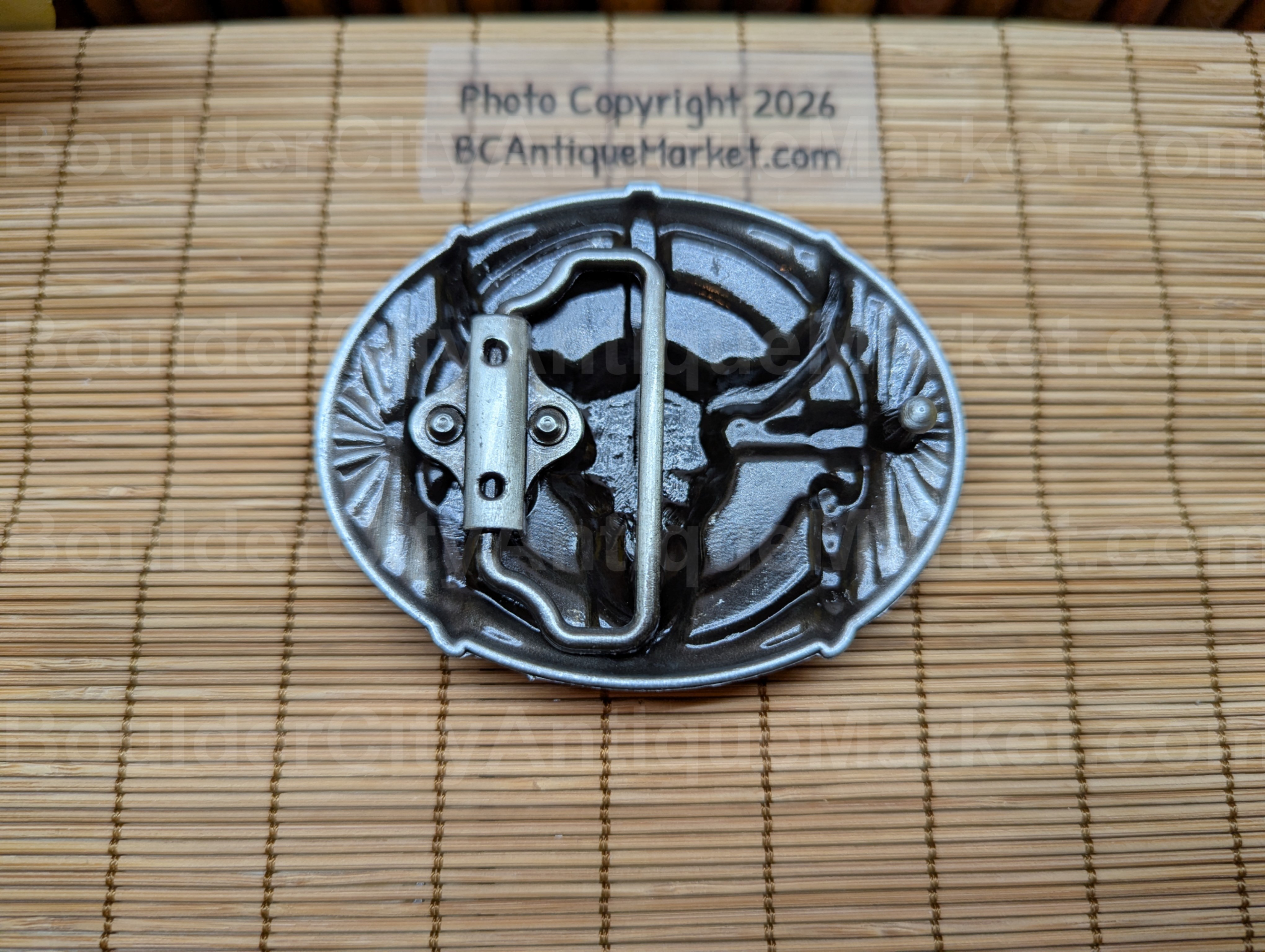 Raised buffalo skull centers this oval belt buckle that is 2.5-inches tall and 3.25-inches long.