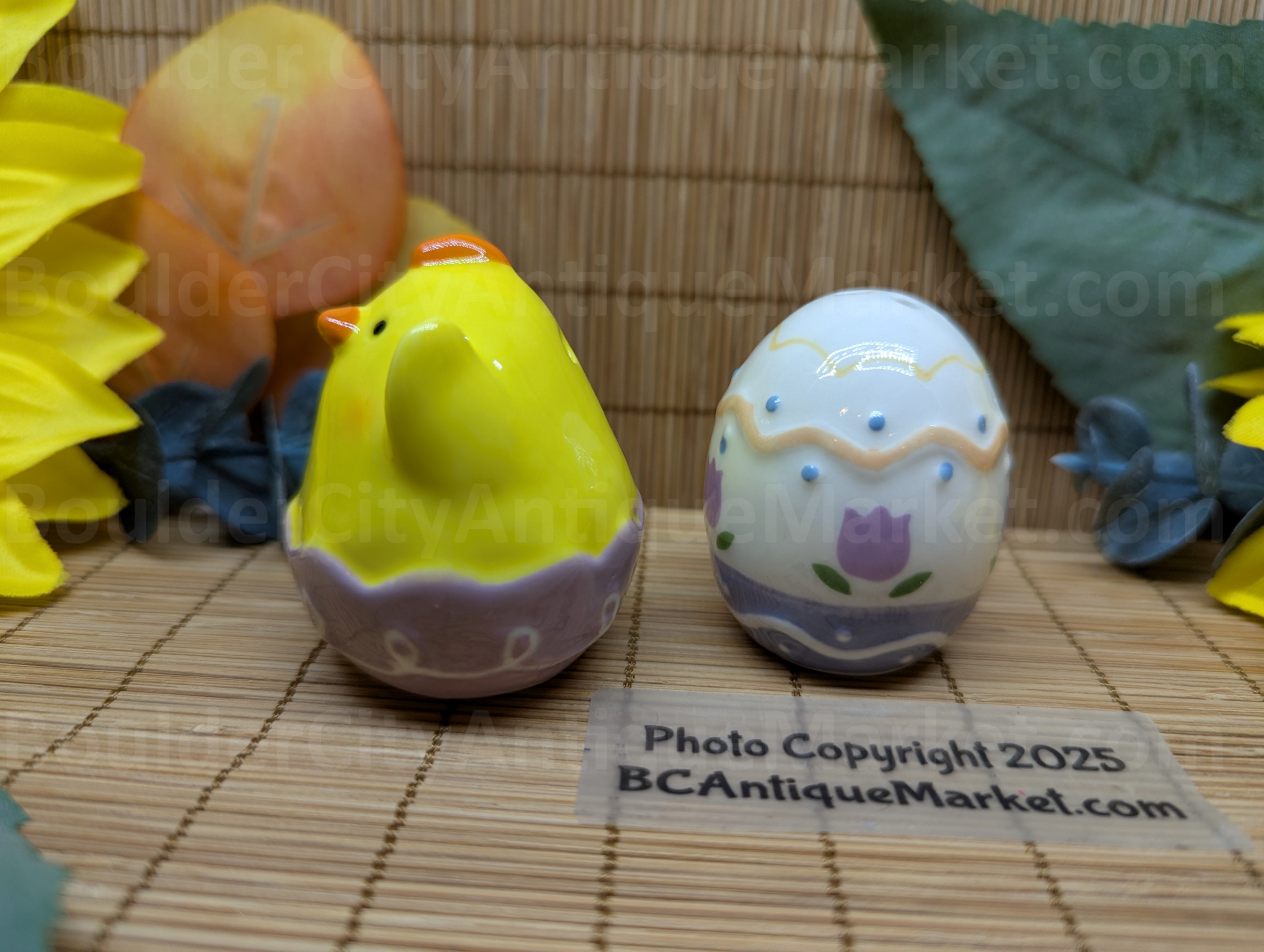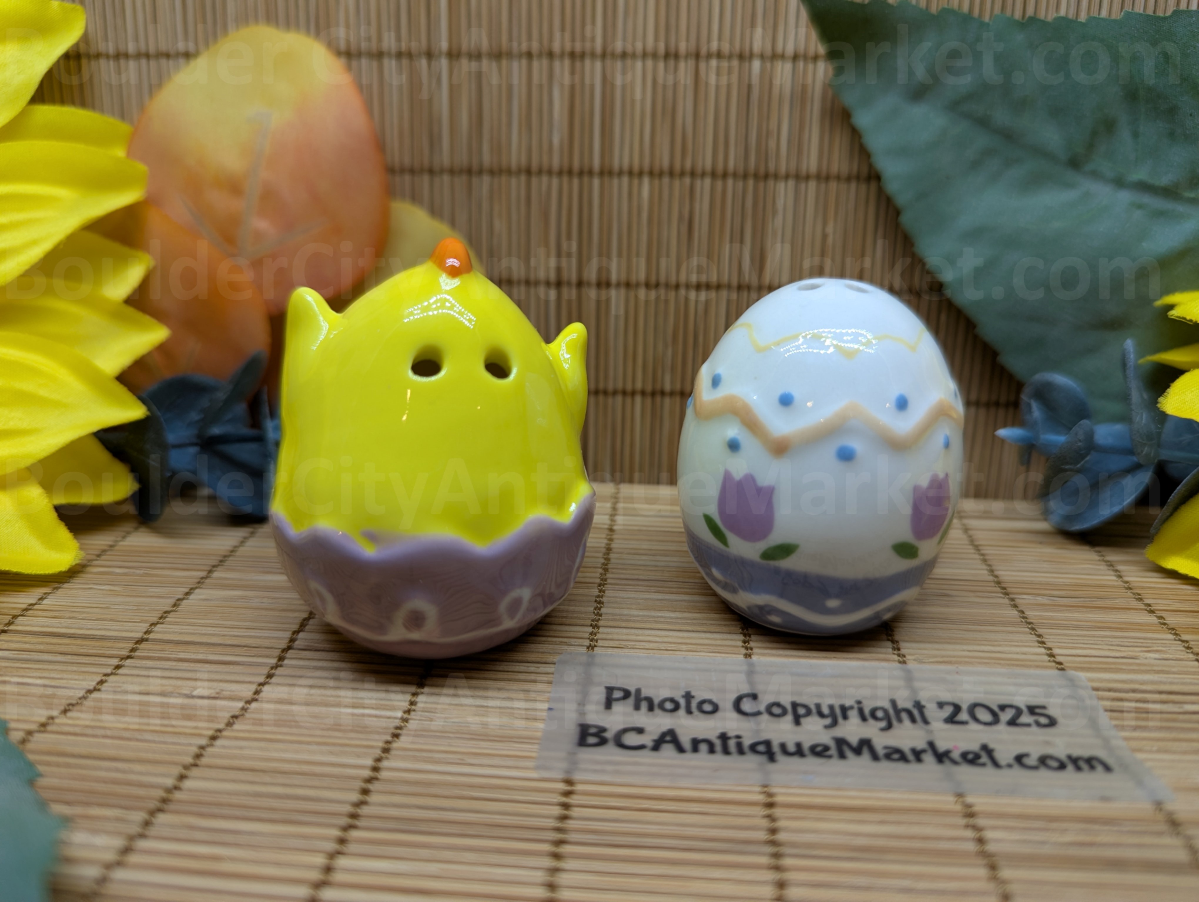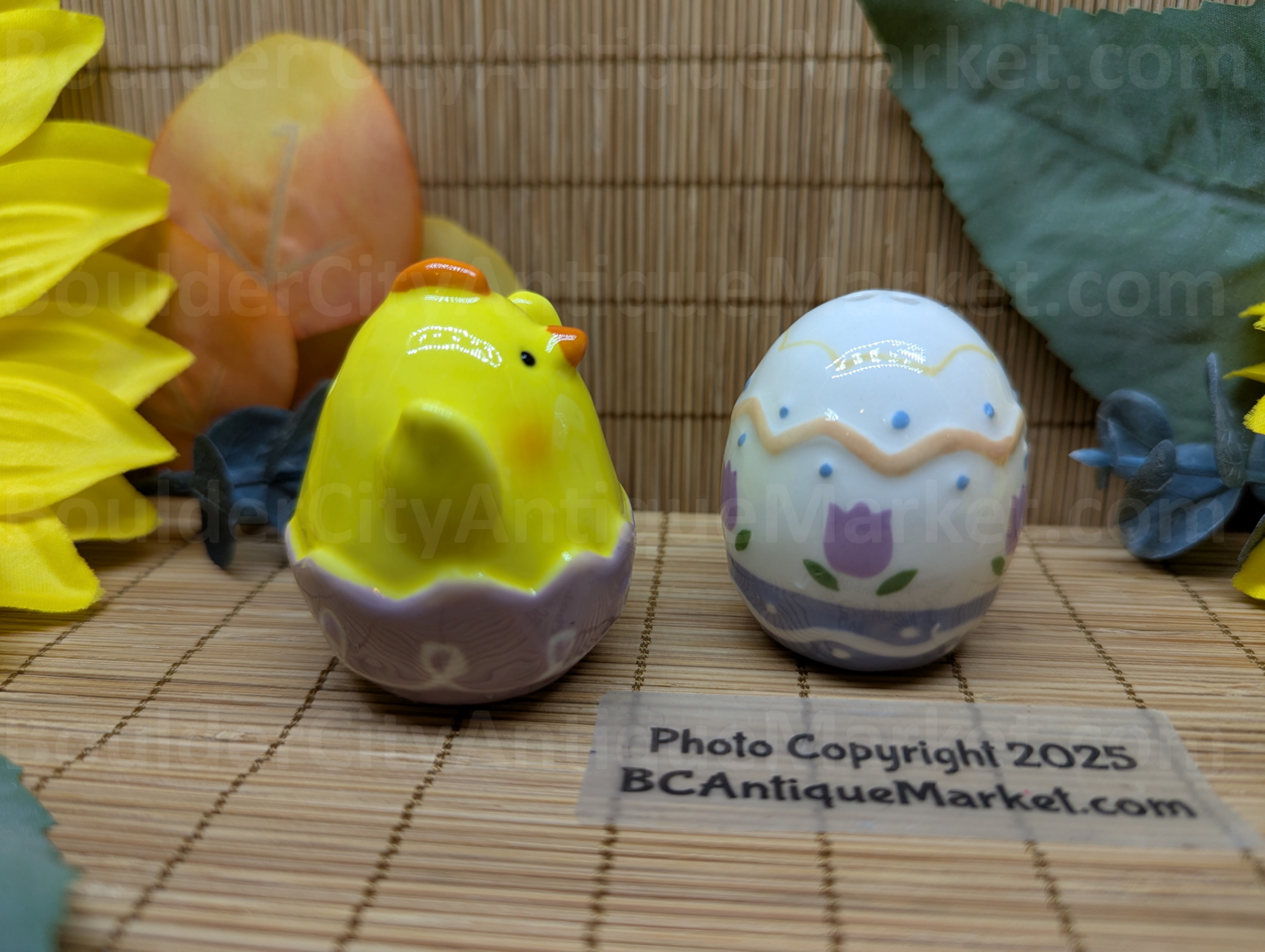 Yellow chick in purple egg is two inches tall. White egg with purple tulip and decorations is slightly smaller.