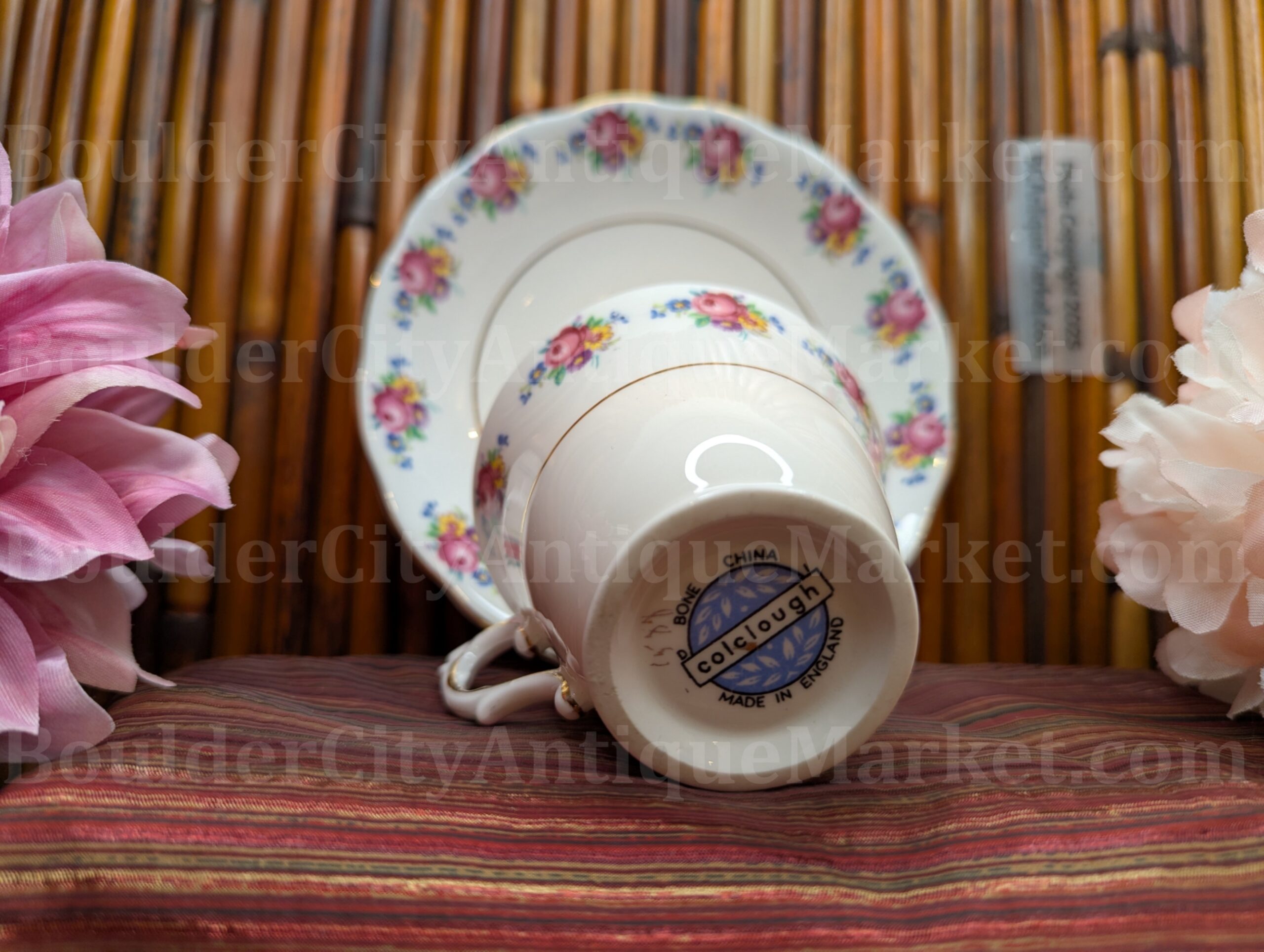 Made in England, this Colclough teacup and saucer feature a repeated rose and floral pattern, with gold details and scalloped edges. The teacup is 3.5 inches diameter and is 5.5 inches diameter. This set dates from before 1960.