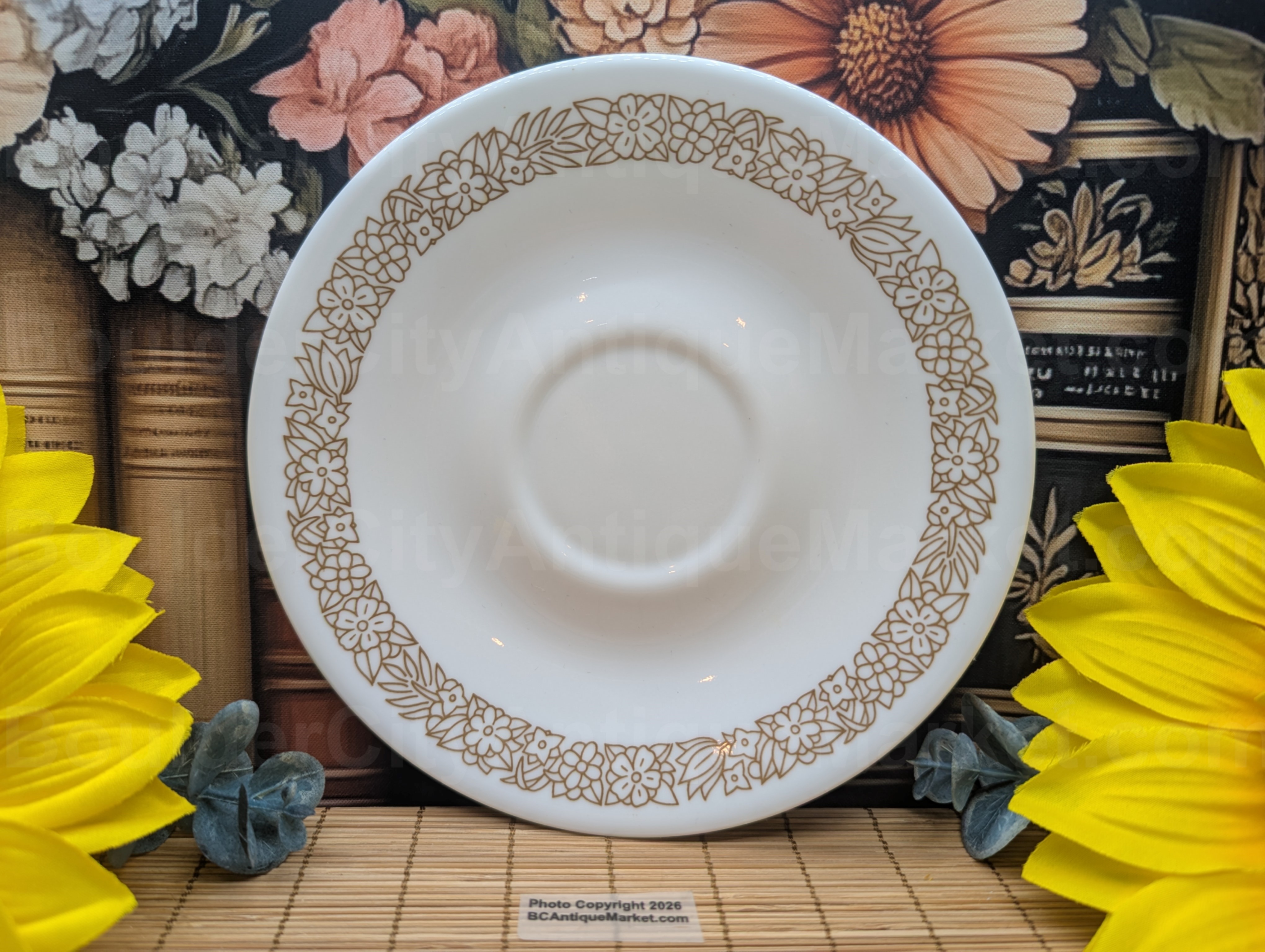 6.25-inch diameter saucer in the Woodland Brown pattern produced from 1978 to 1986.