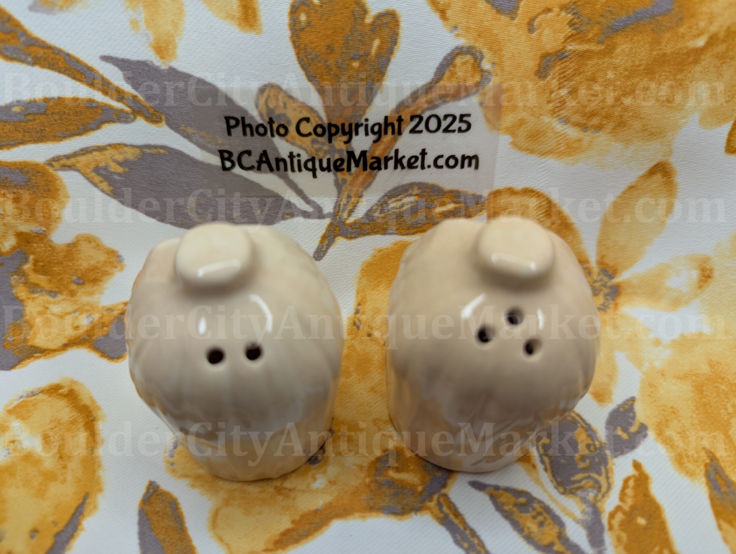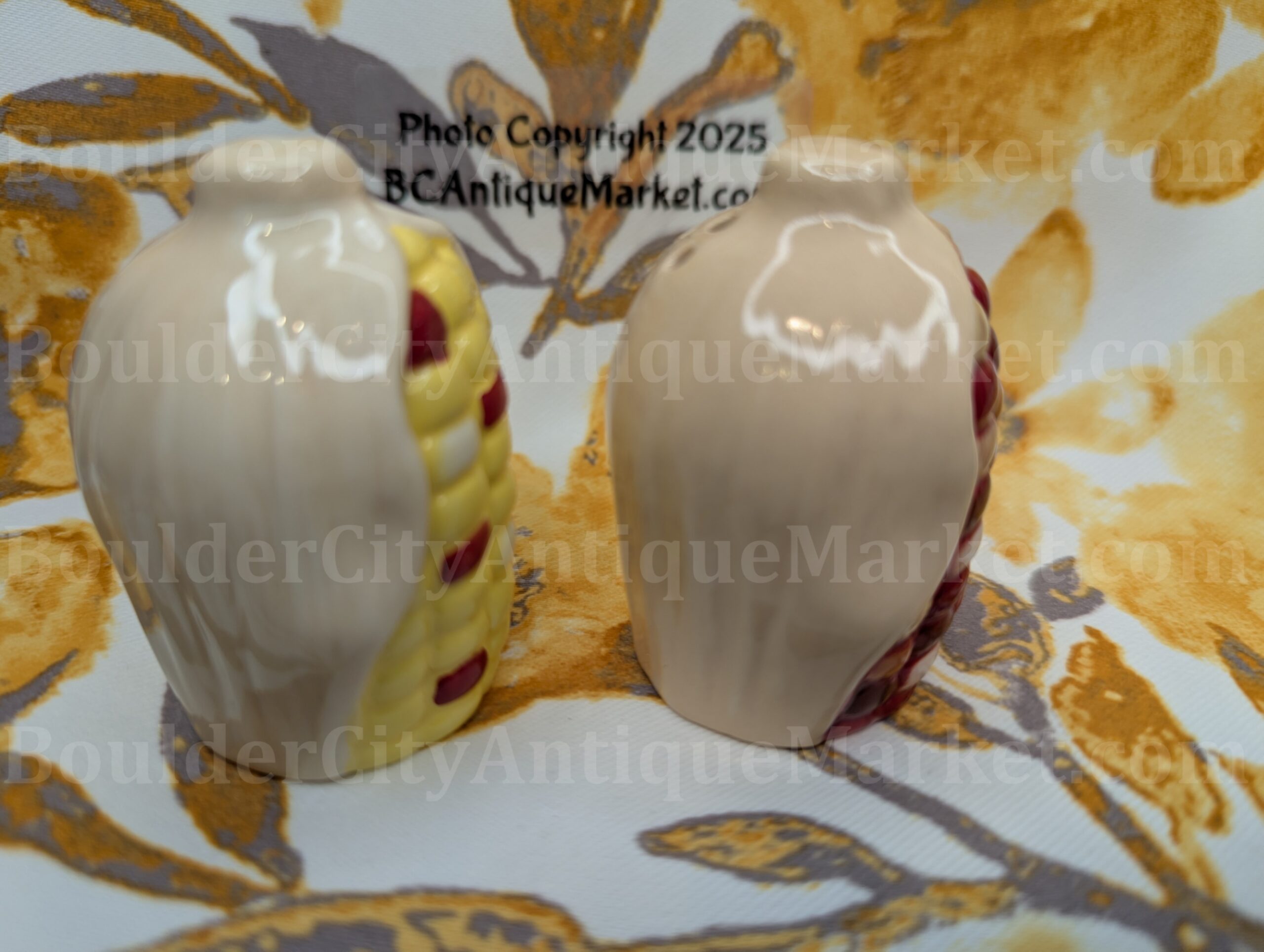Red and yellow corn ears, this new set of small salt and pepper shakers is from fall of 2025. Approx. 2.25″ tall. Made of ceramic.