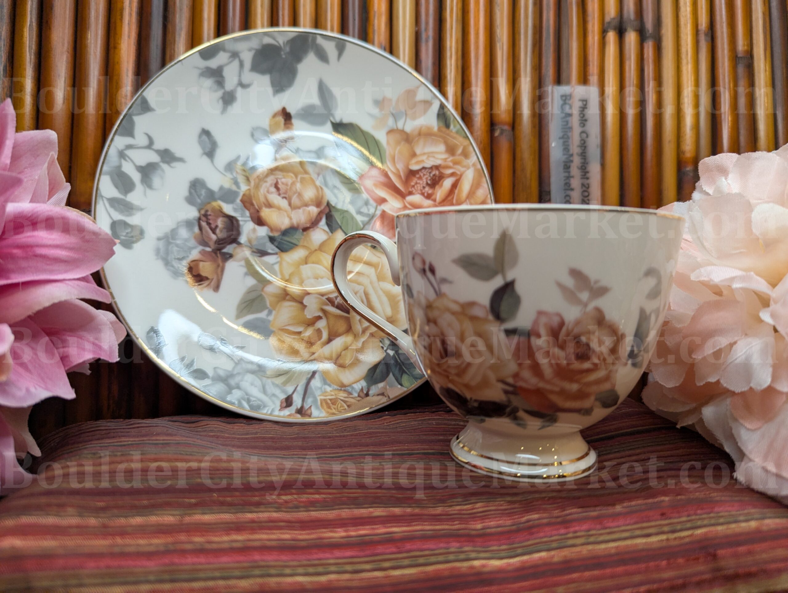 This modern Grace Pink and Yellow Rose pattern teacup and saucer is brand new. Made of heavier modern porcelain, not microwave safe. Teacup is a generous 3.5″ diameter and saucer is 6″. Gold detailing on cup and saucer.