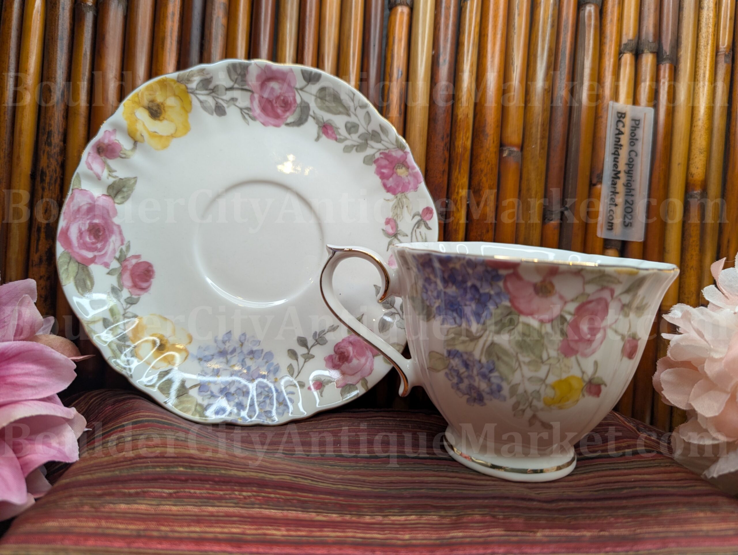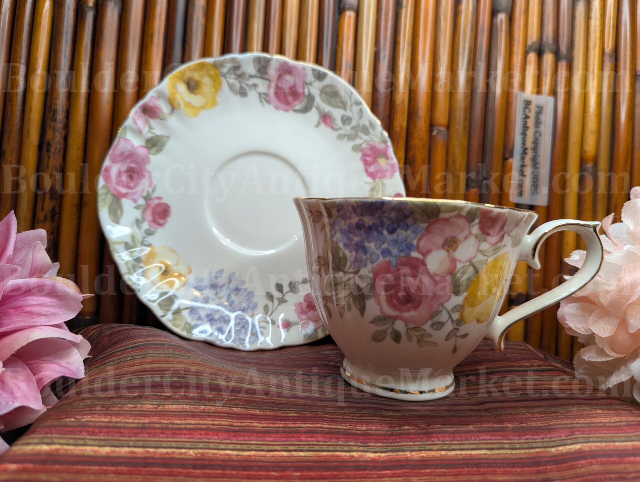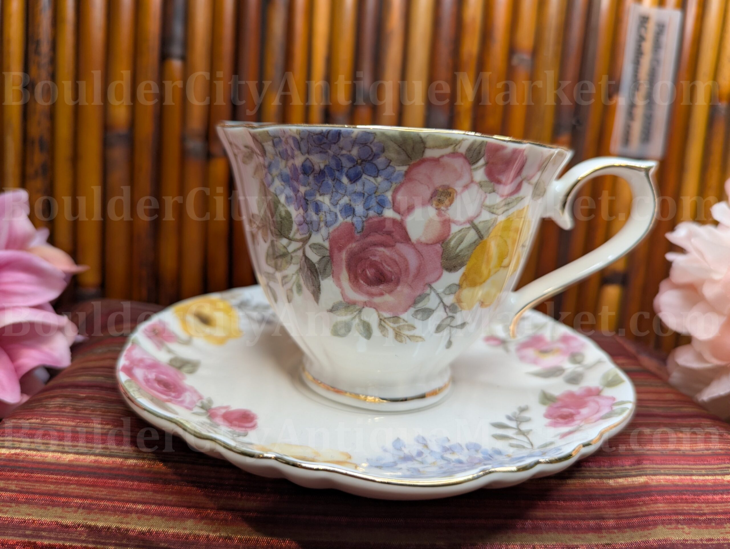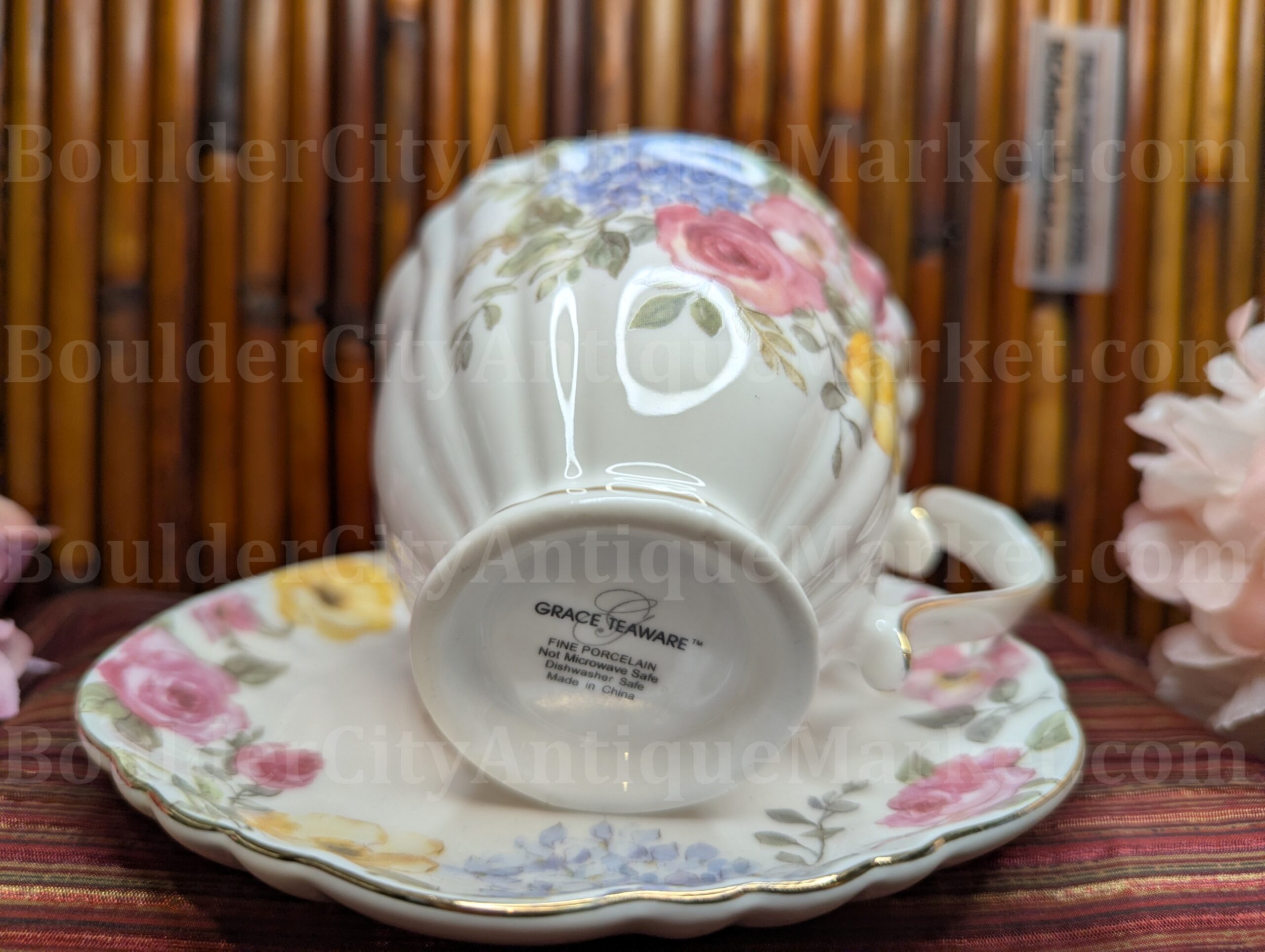 This modern Grace Wild Flowers pattern teacup and saucer is brand new. Made of heavier modern porcelain, not microwave safe and hand wash only. Scalloped eacup is a generous 3.75″ diameter and scalloped saucer is 6.”. Gold detailing on cup and saucer.