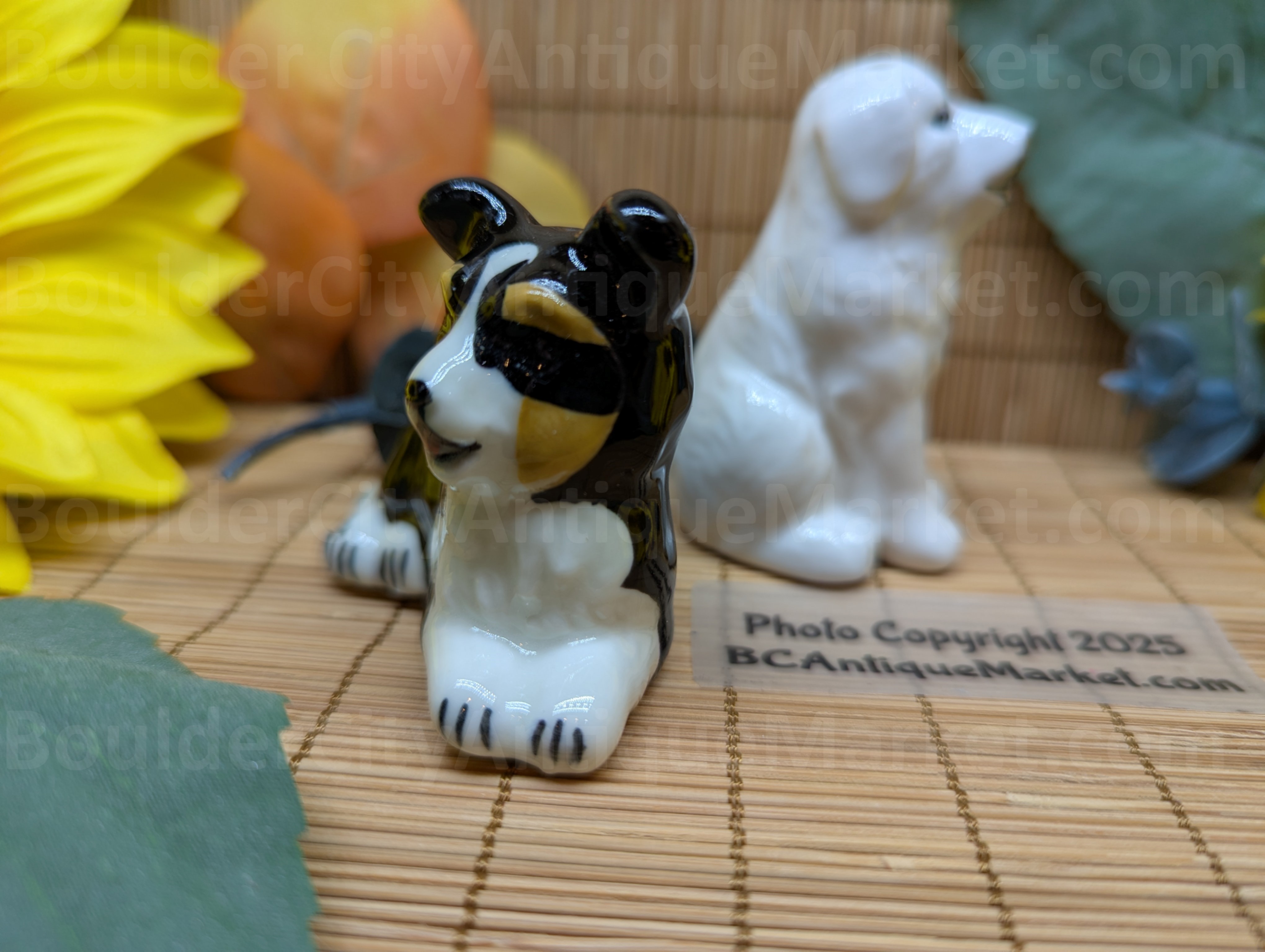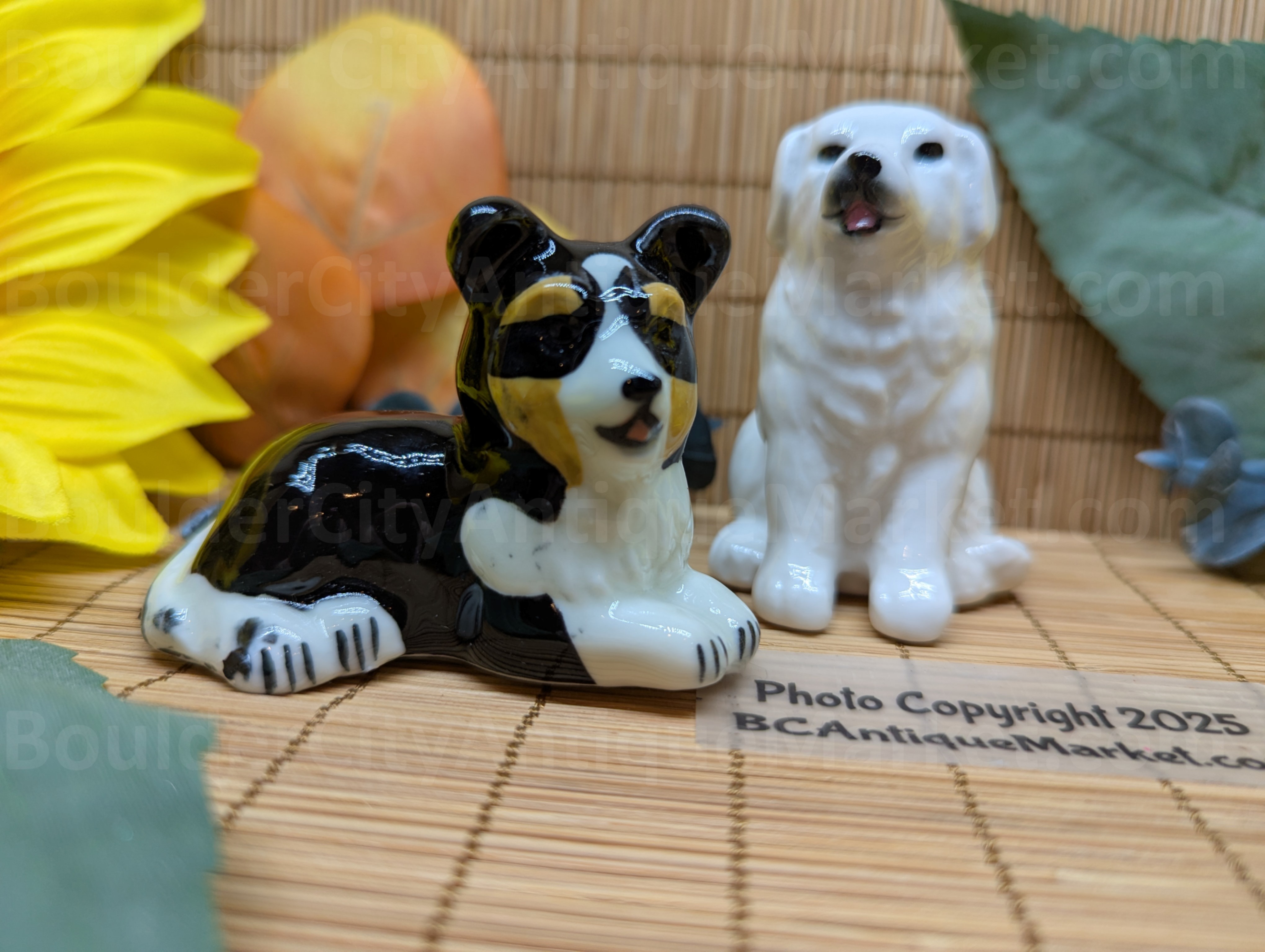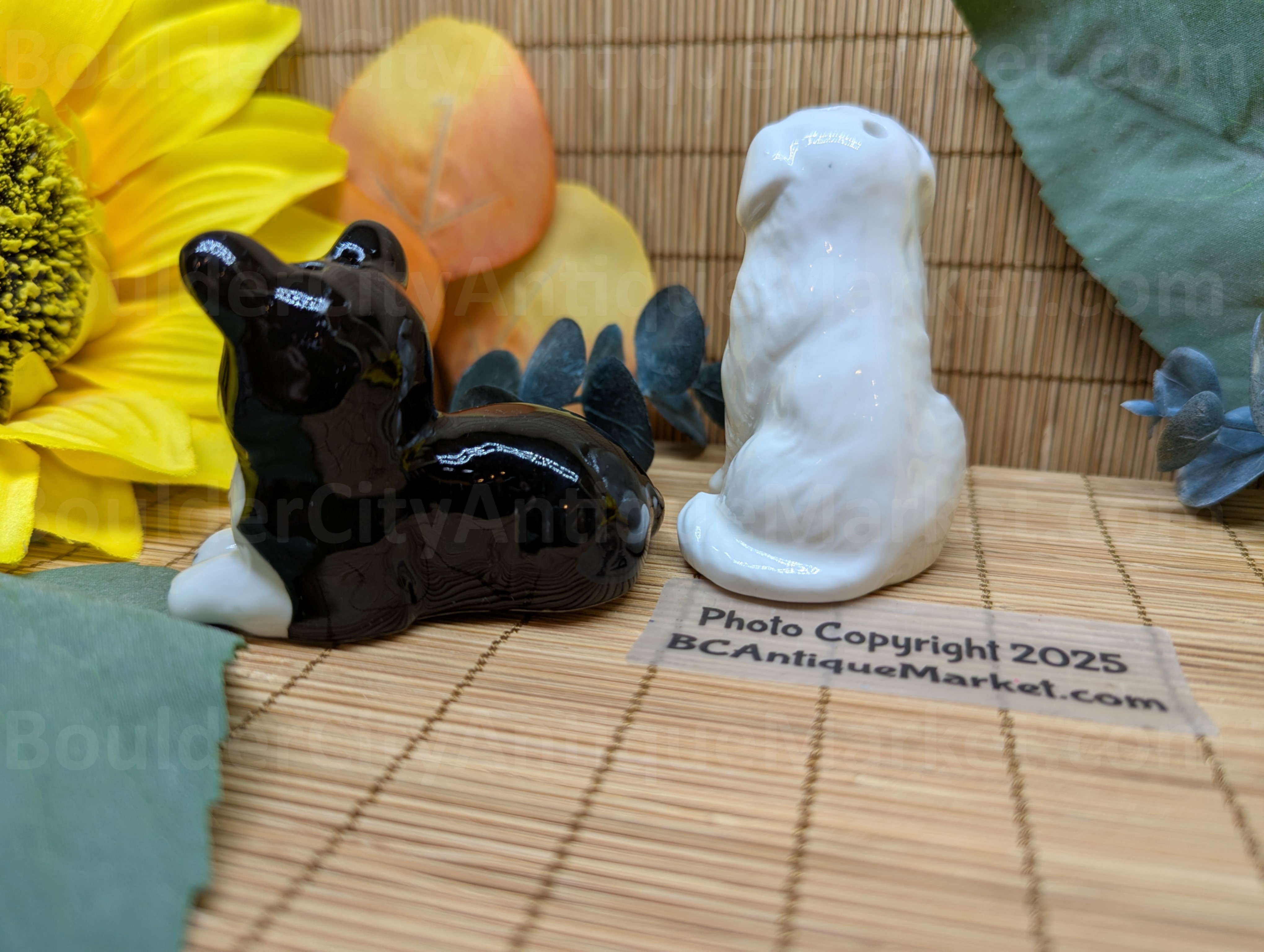 Great Pyrenees and a tri-colored herding dog in salt and pepper shakers. Pyrenees is two inches tall and herding dog is about two inches long.