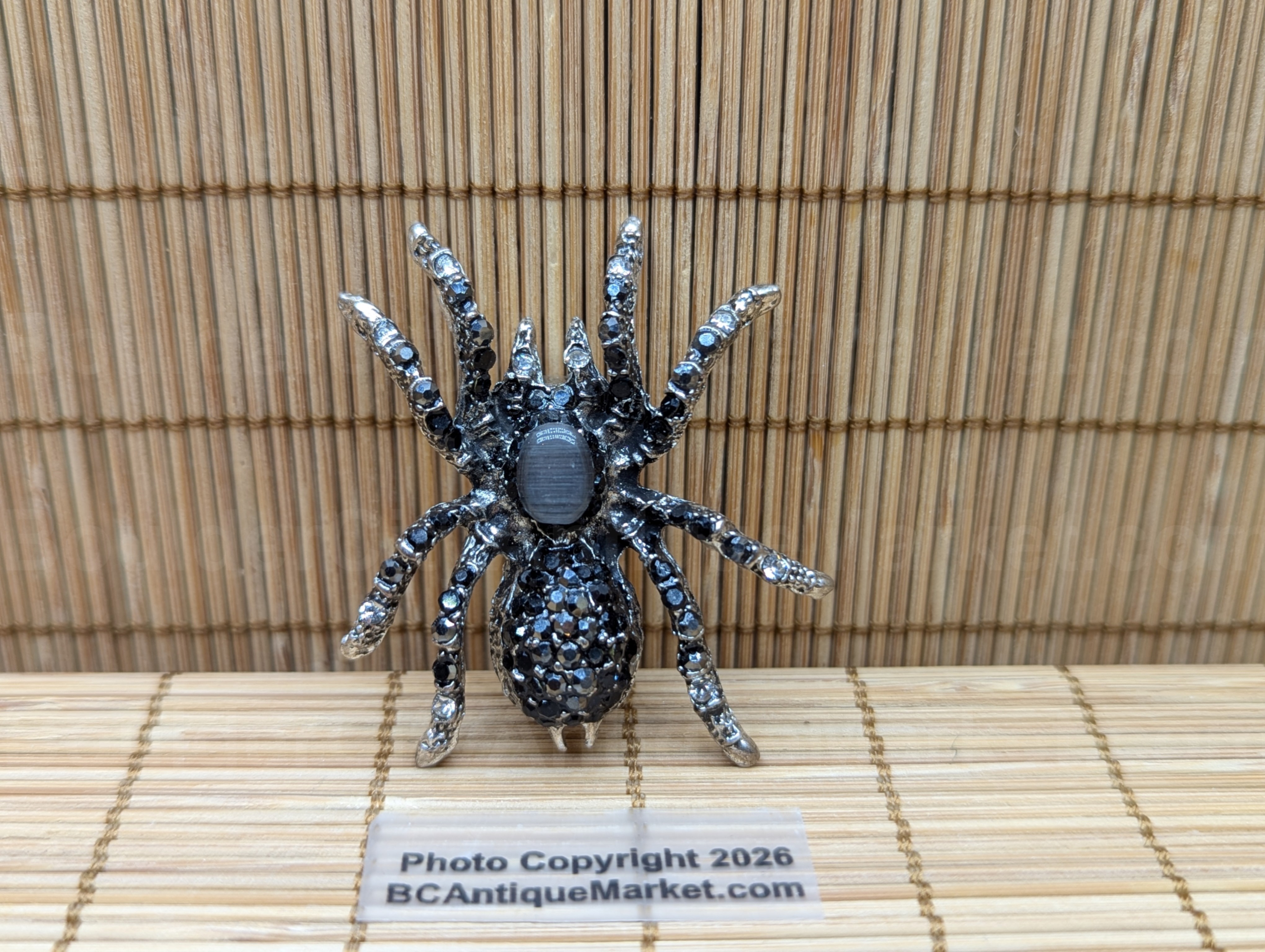 An artificial grey cat’s eye gem forms the carapace of this black rhinestone spider. The body and spinnerets are silver, the rhinestones on the abdomen, legs and pedipalps are black. She is a little over 1.75-inches in length.