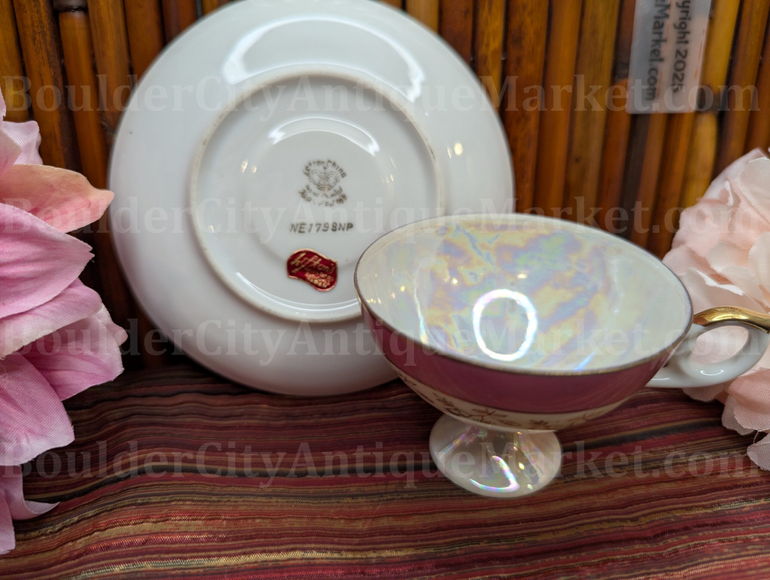 Lefton China, hand painted, stunning mother of pearl luster. This piece belonged to a long time collector and was safely stored it’s entire existence with her. It’s believed she acquired this piece before 1950. Pictures do not do justice for the luster on this piece! Gold detail all around. Pedestal cup is three inches in diameter and saucer is 4.75″ in diameter.