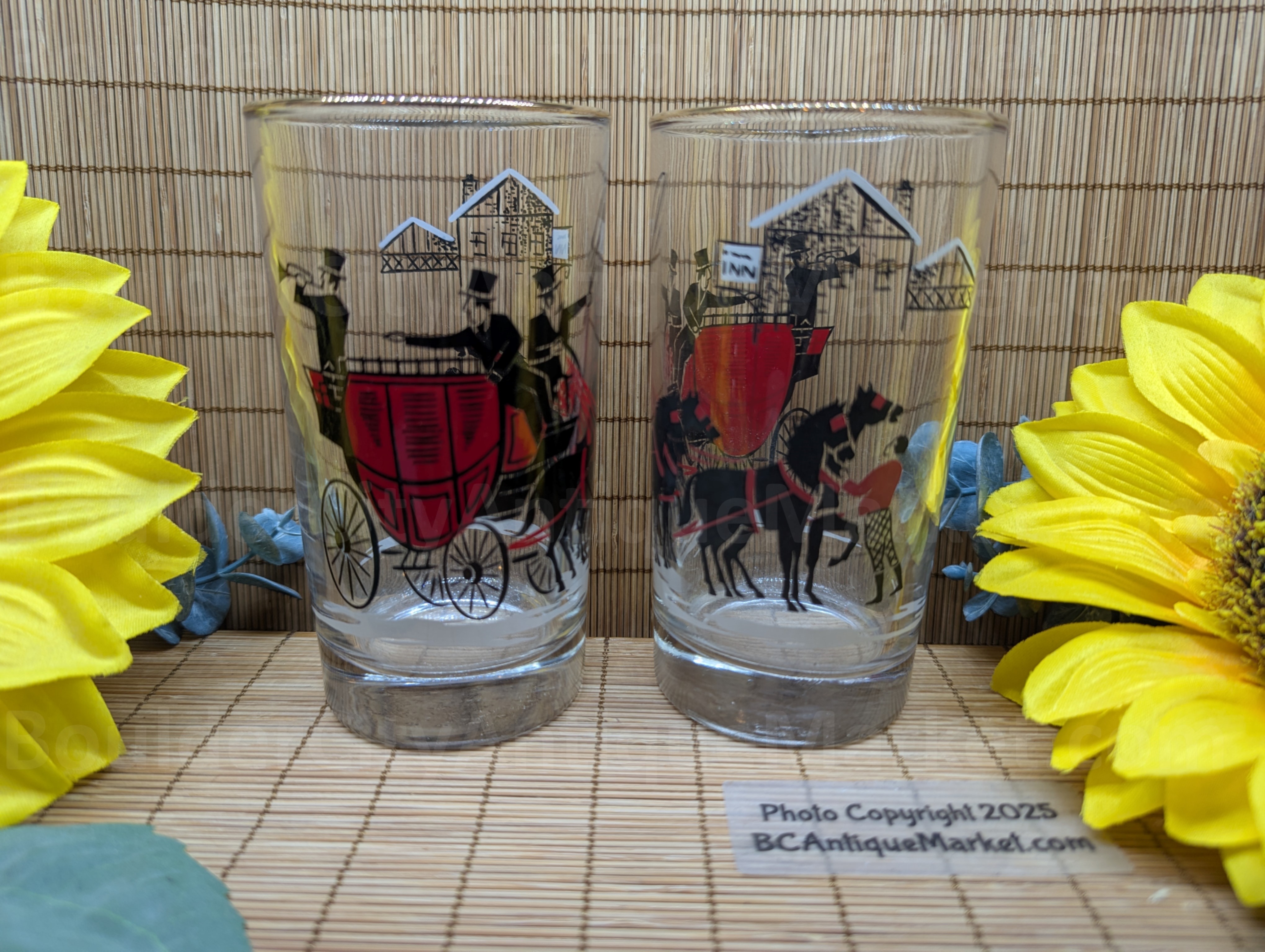 Set of four tumblers in the Libbey Stagecoach pattern from the 1950s. Tumblers are 4.75″ tall and in excellent condition!