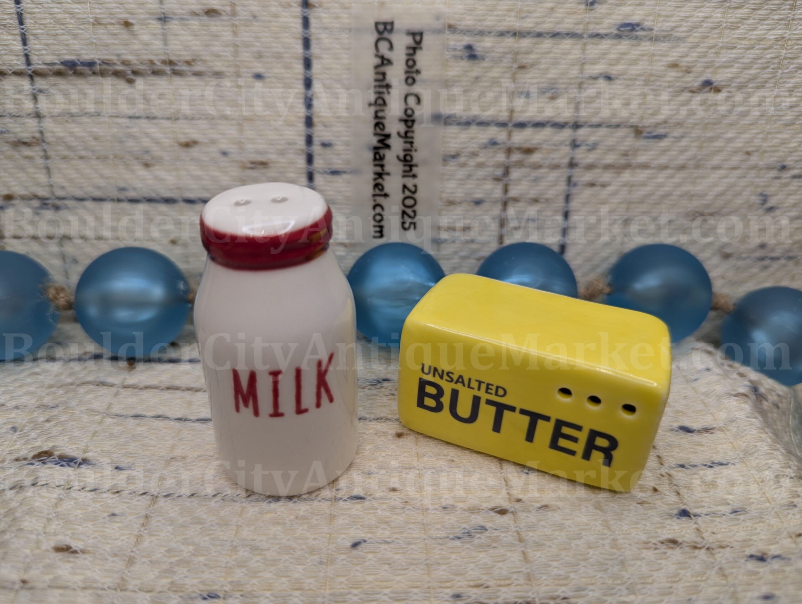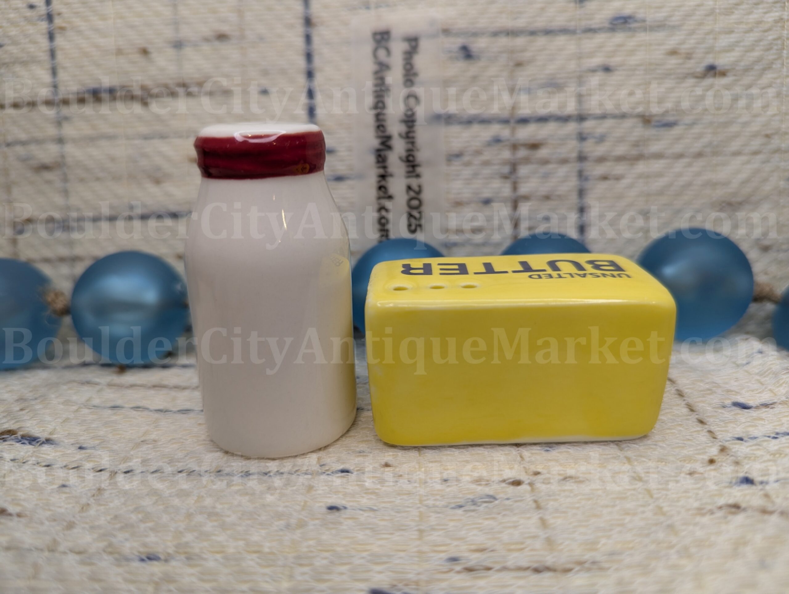 New design for 2025, get your dairy! Stick of butter and a jug of milk, small salt and pepper set. Milk jug approx. 2.5″ tall. Made of ceramic.