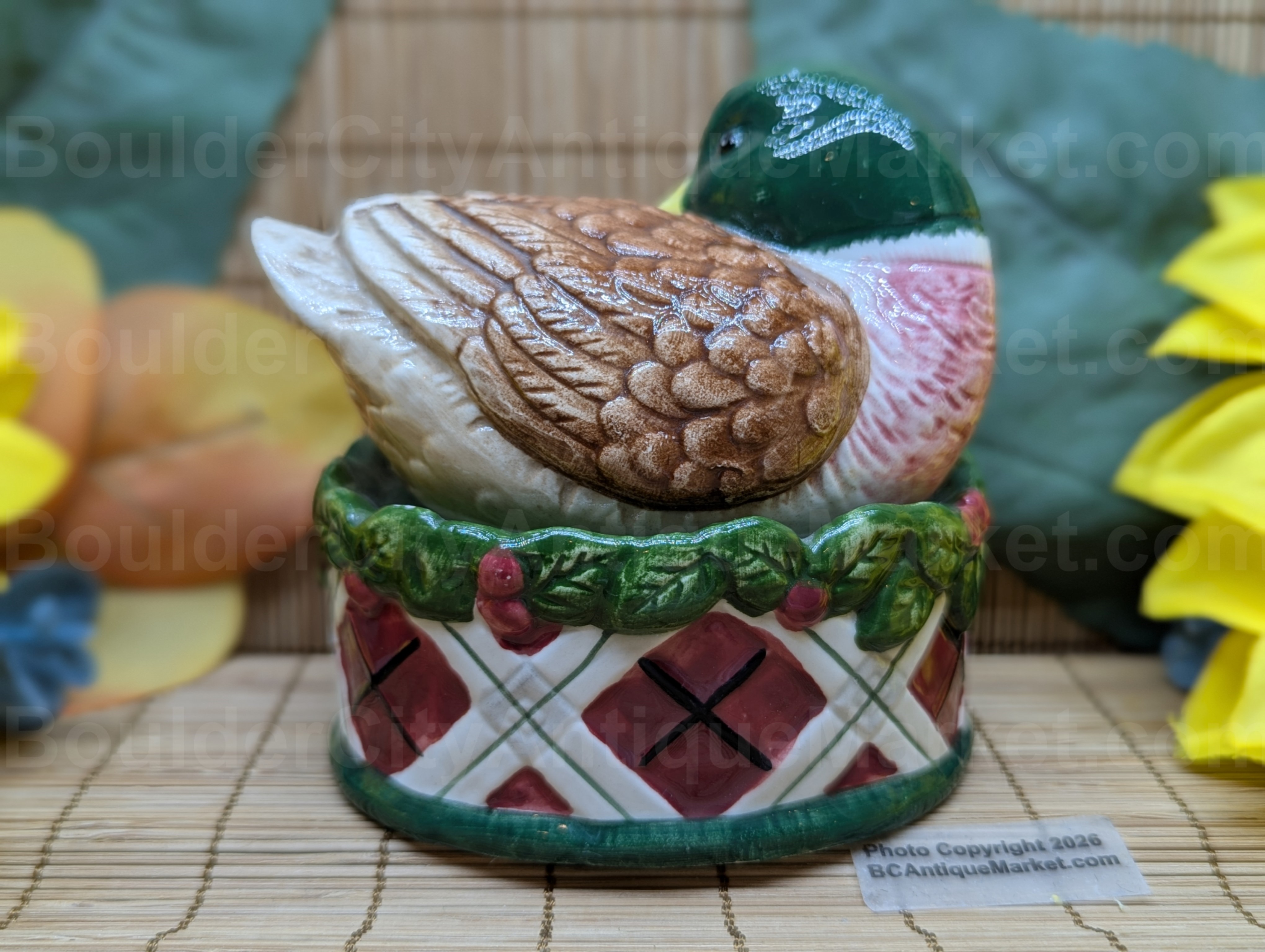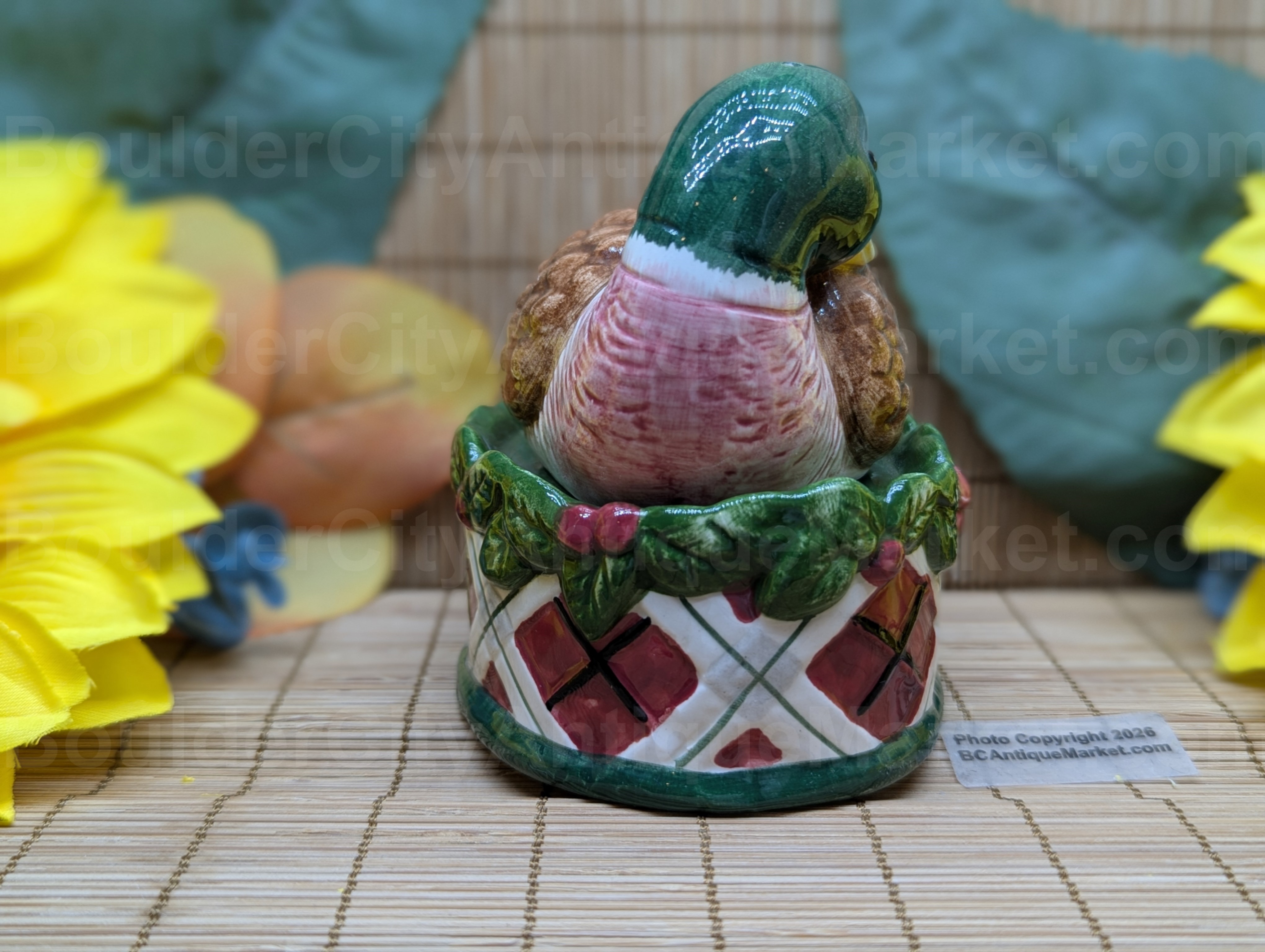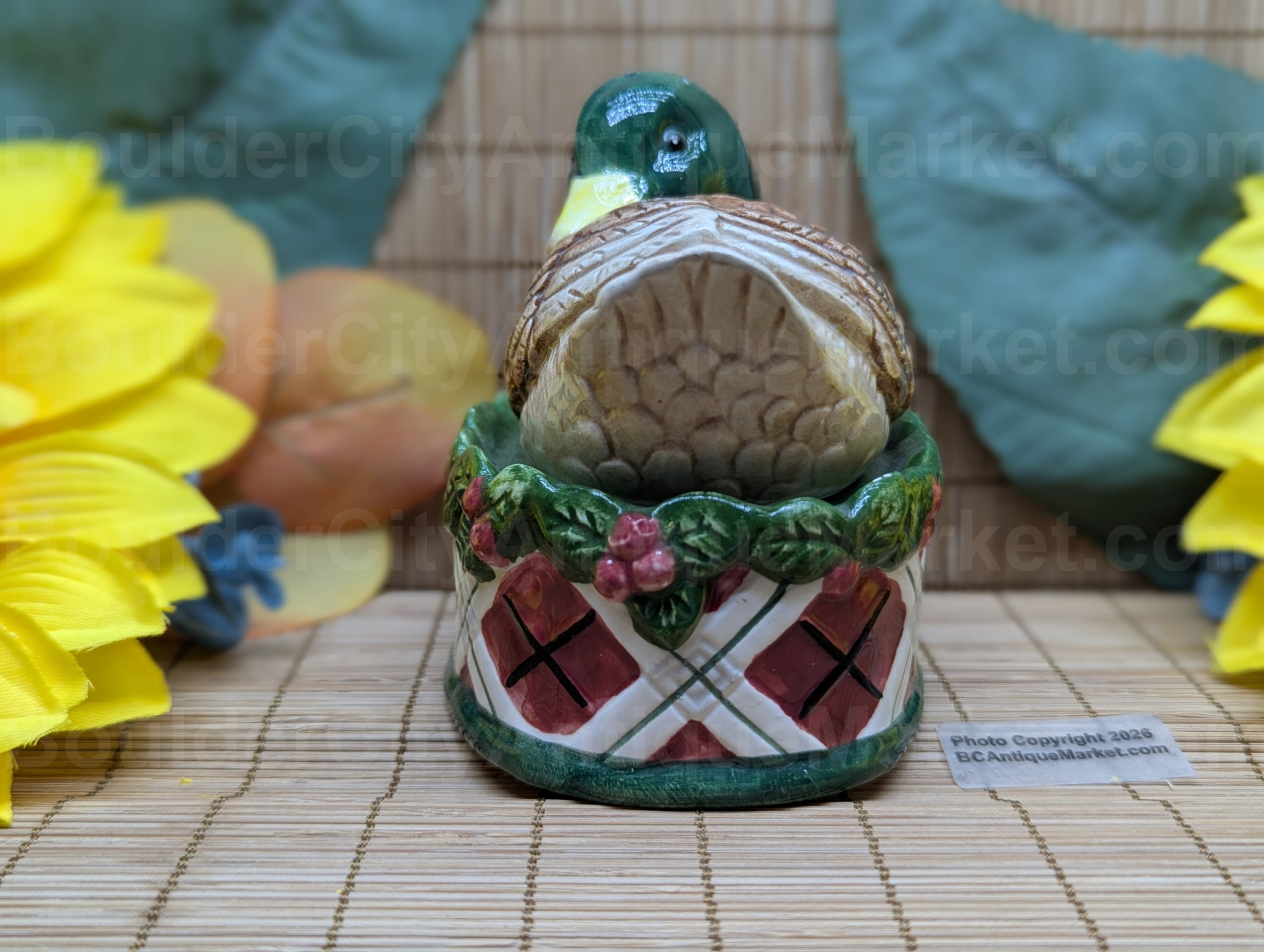 Noritake Royal Hunt, pattern 3930, features a mallard duck on a basket as a salt and pepper set produced between 1990 and 2005. Stacked set stands 3.75 inches tall.