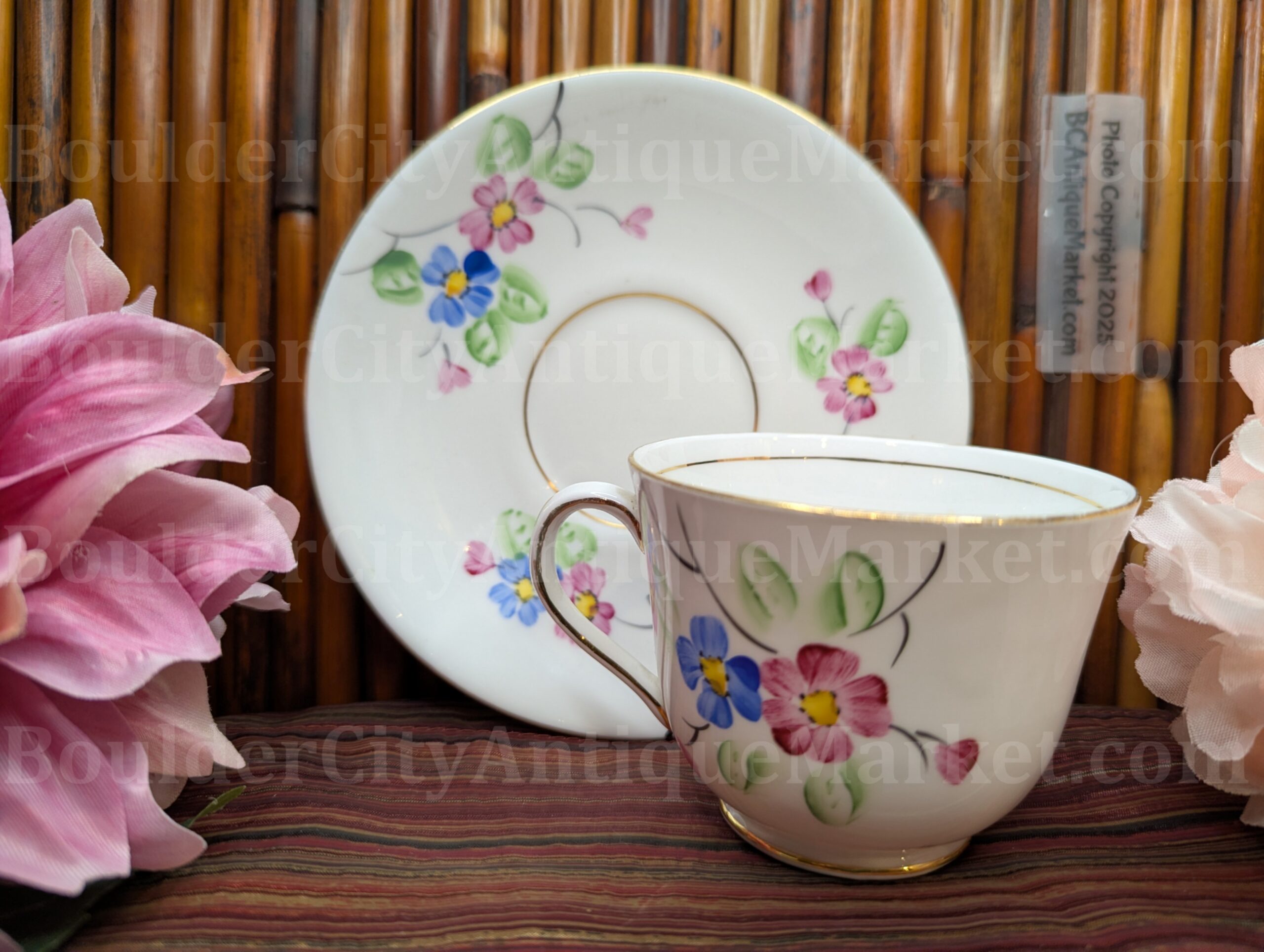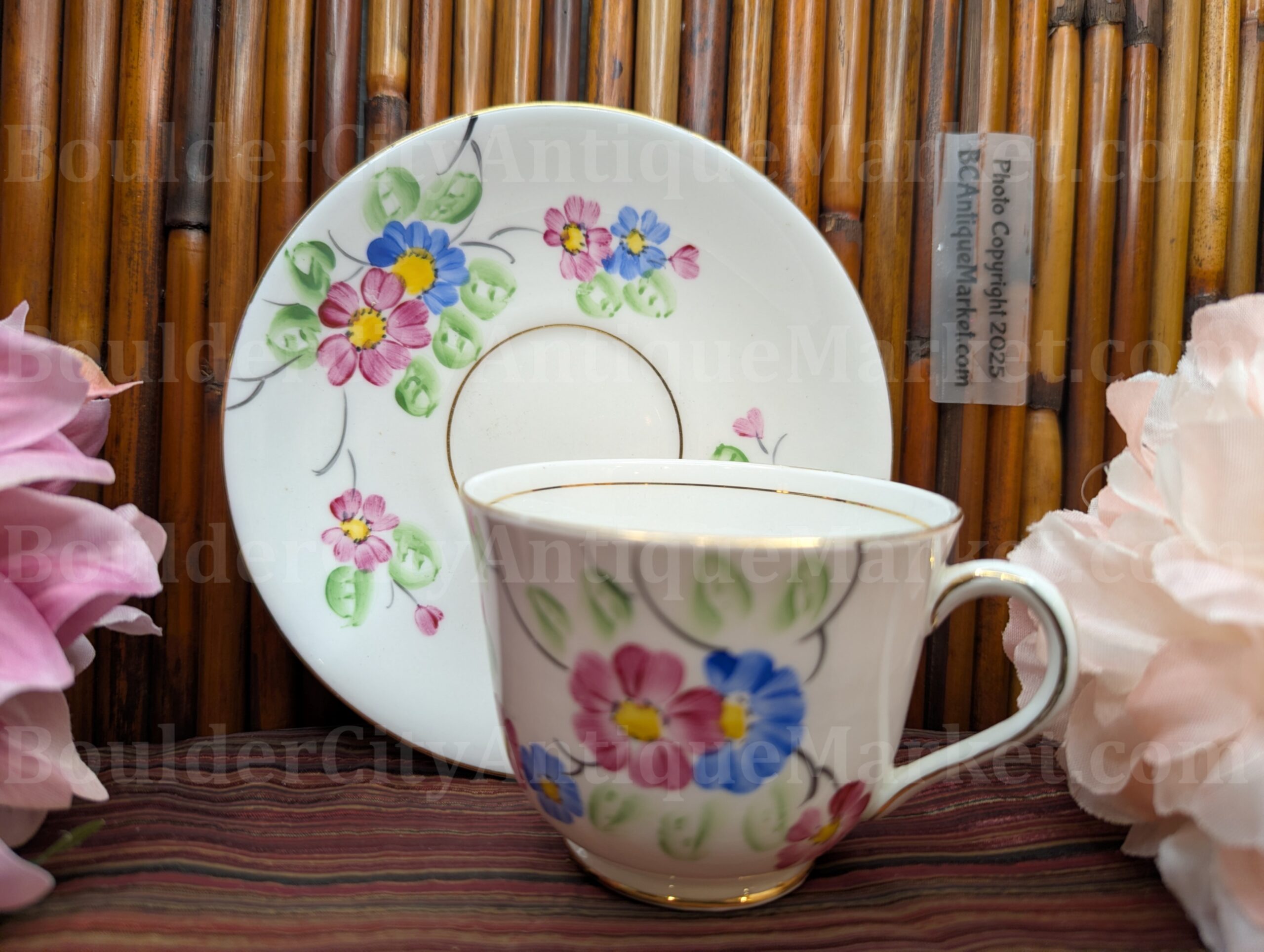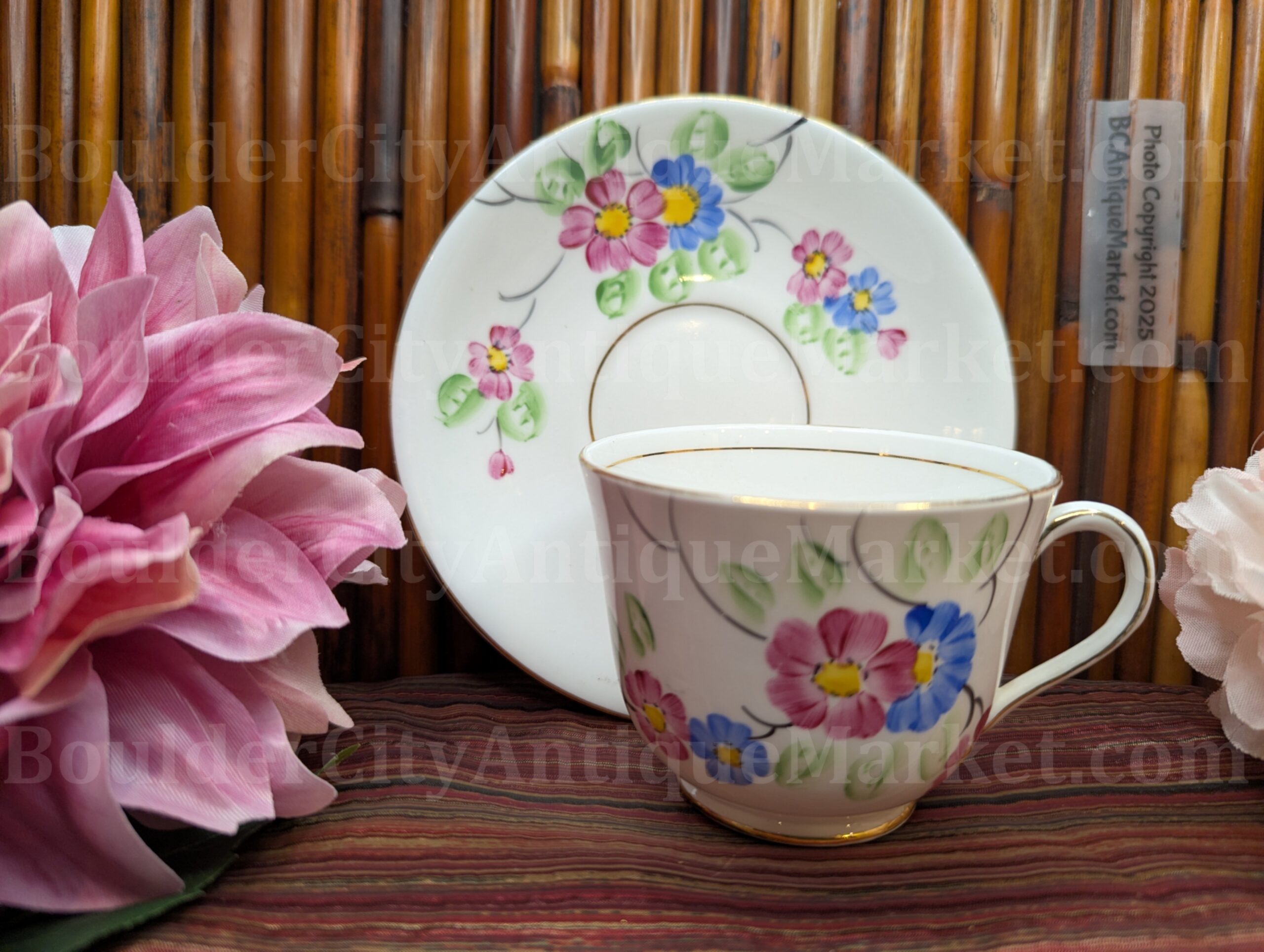 Phoenix bone china, made in England, from TF&S LTD. This set was well protected from the previous collector and may date from before the 1960s, although we can’t yet confirm that. Beautiful gold details on cup and saucer. Standard size, cup is 3.25 inches in diameter and saucer is 5.5 inches. Hand-painted bright pink and blue daisies and green leaves dominated the pattern.