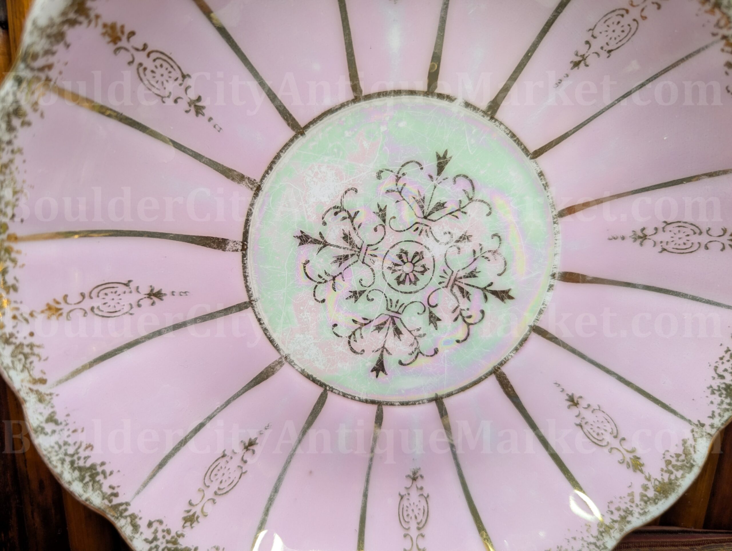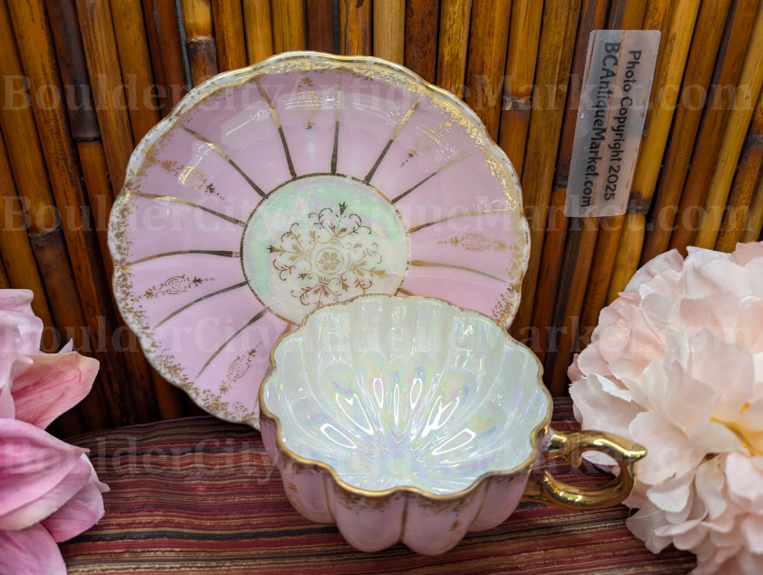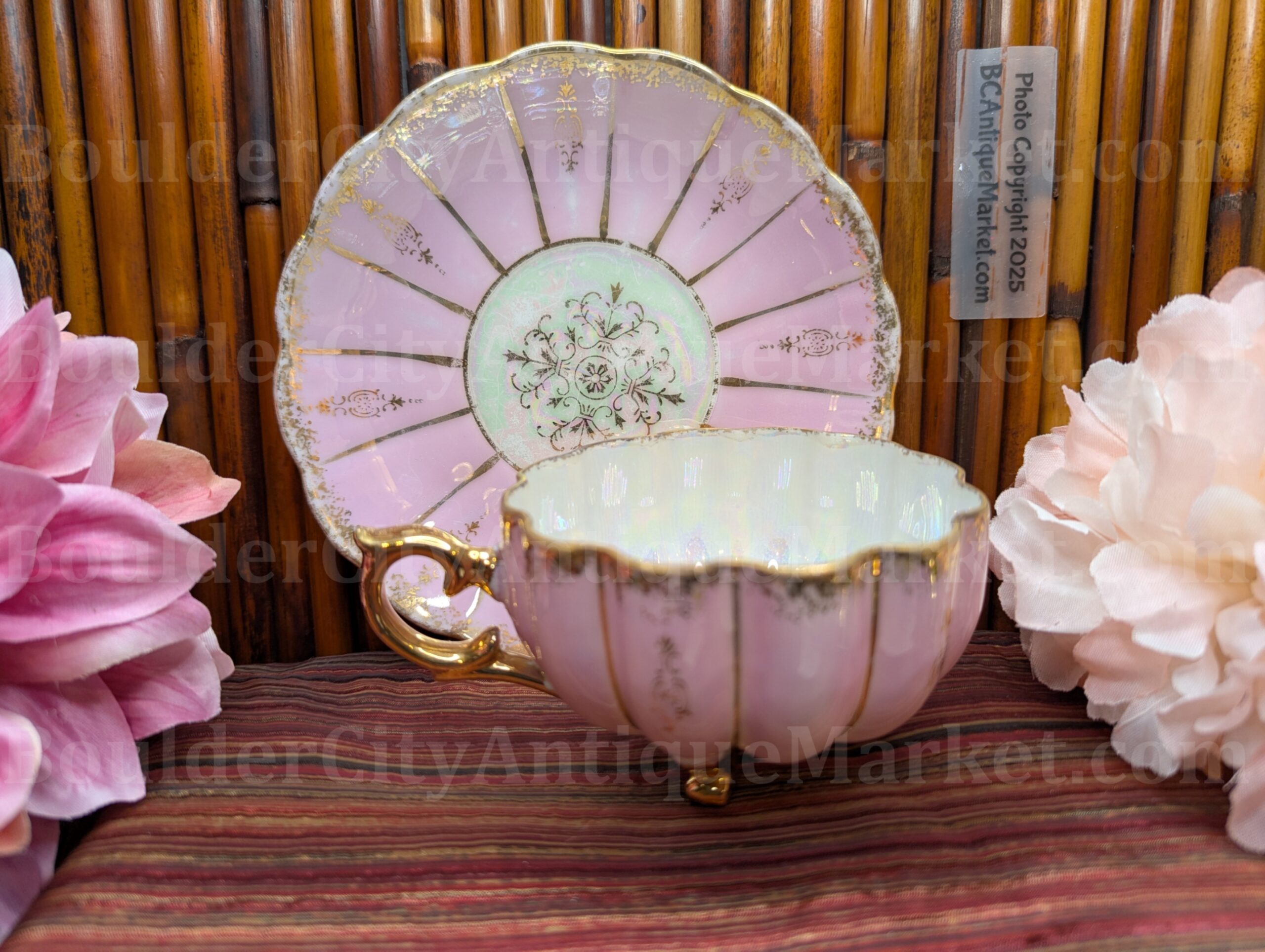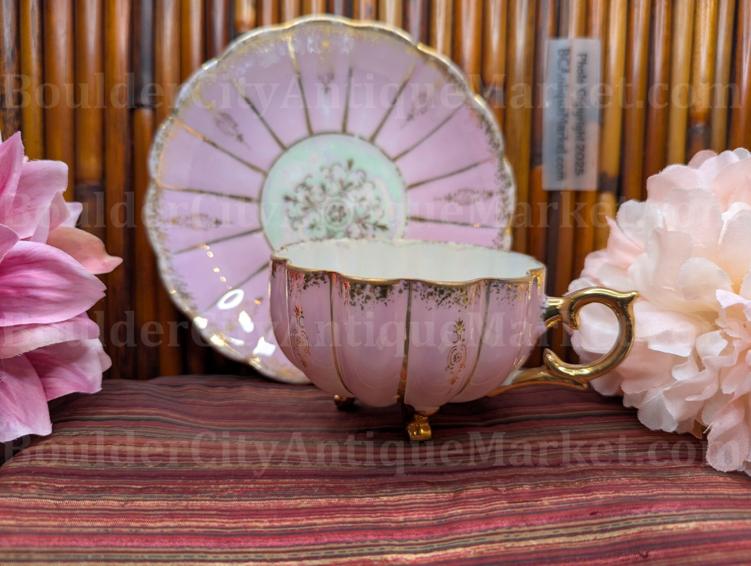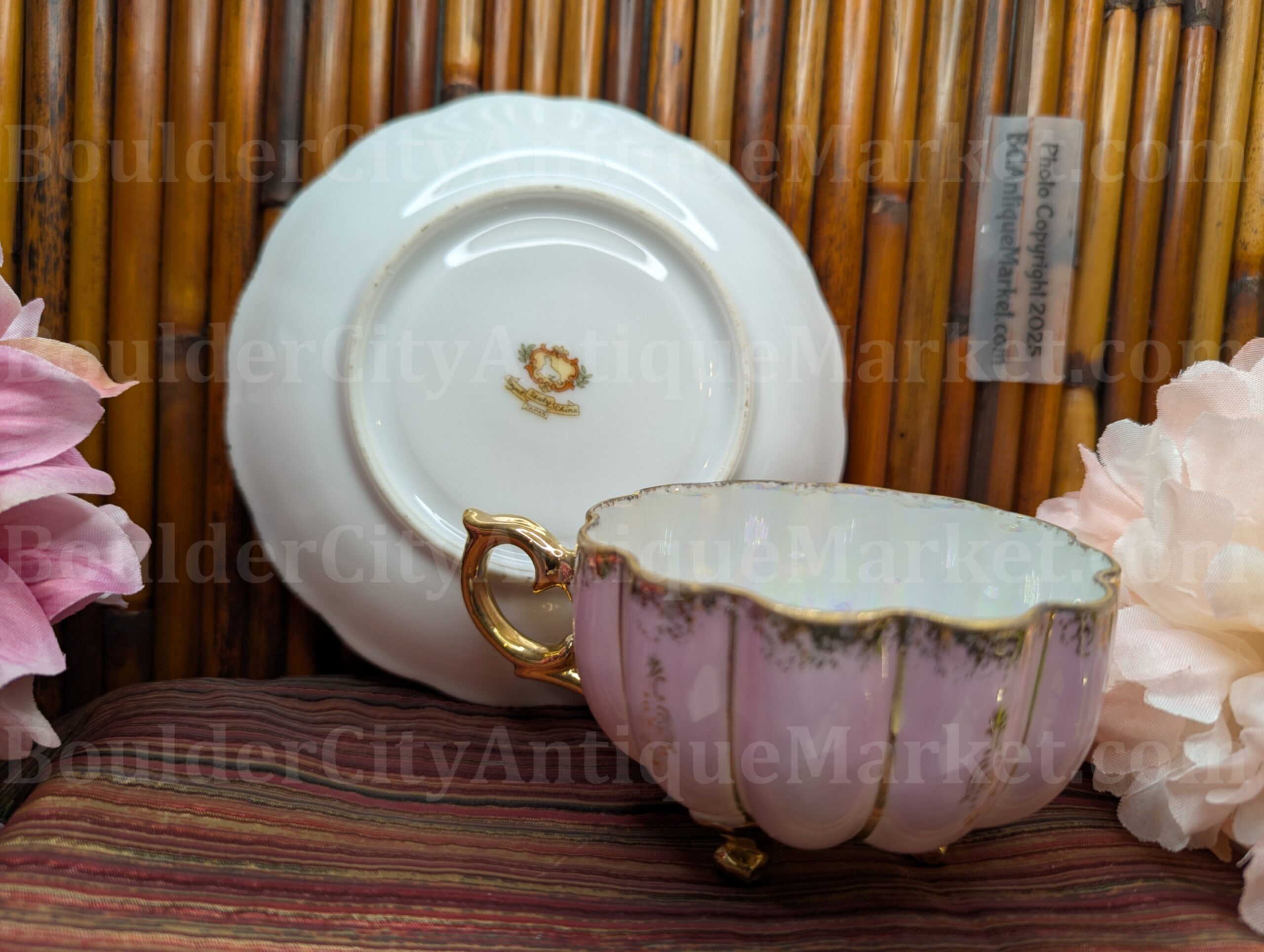 Royal Sealy scalloped pink lusterware with gold accents and trim. Pictures do not do this piece justice; this set was kept protected and has an outstanding mother of pearl luster. There is no wear noticed anywhere on this set. Made in Japan. Teacup is scalloped 3.5′ diameter and three footed. The scalloped coaster is 5.75″ in diameter.