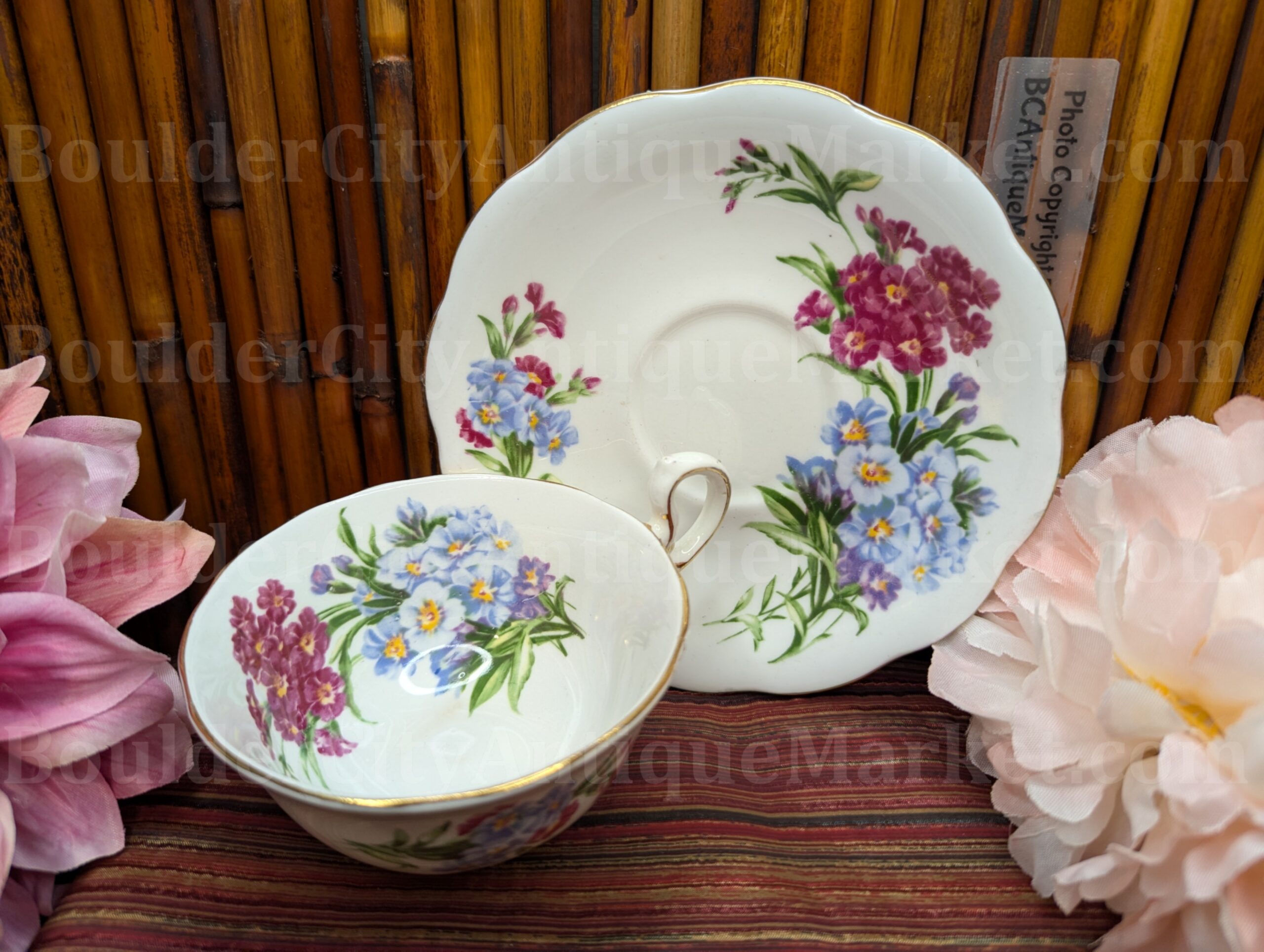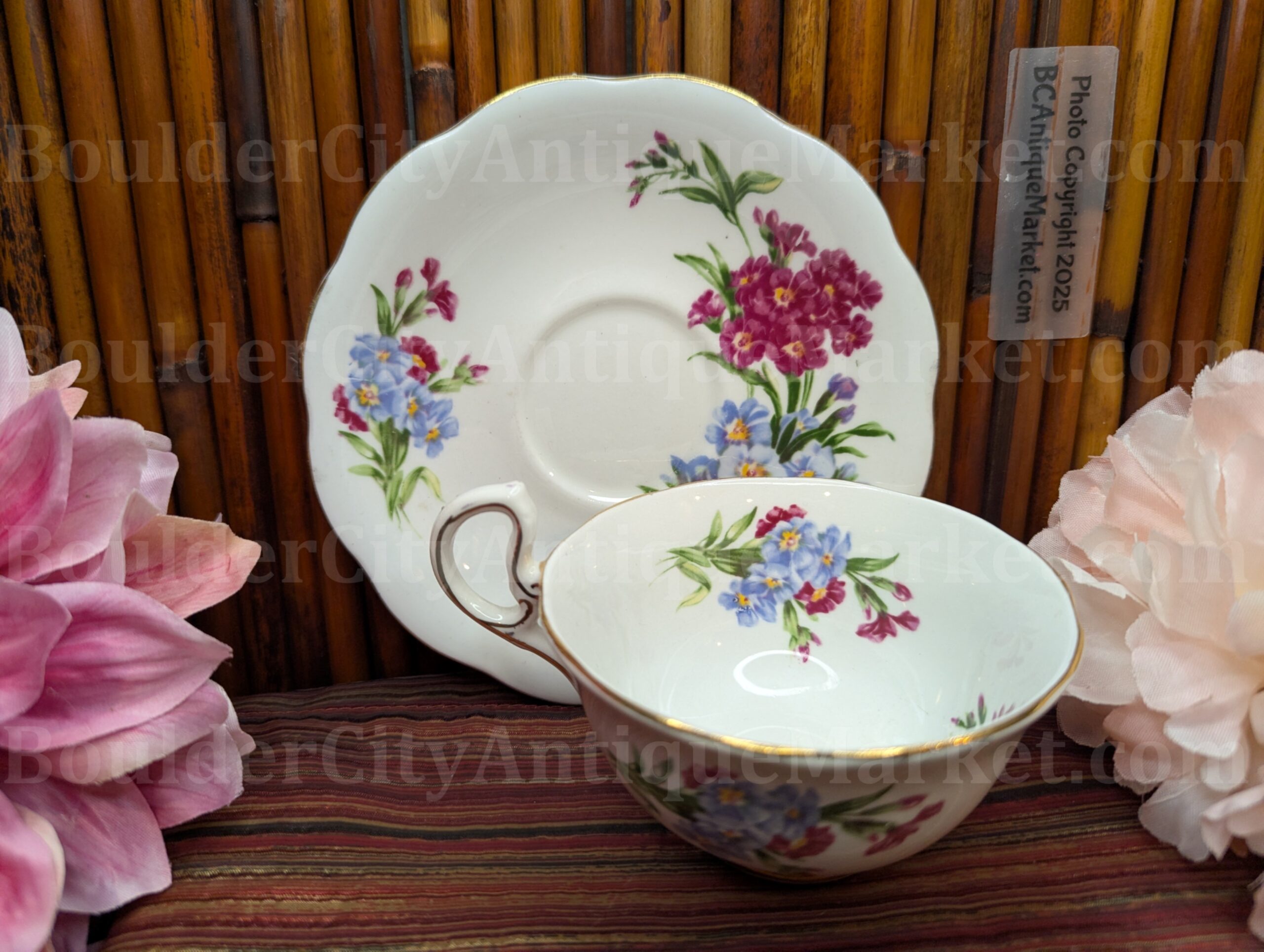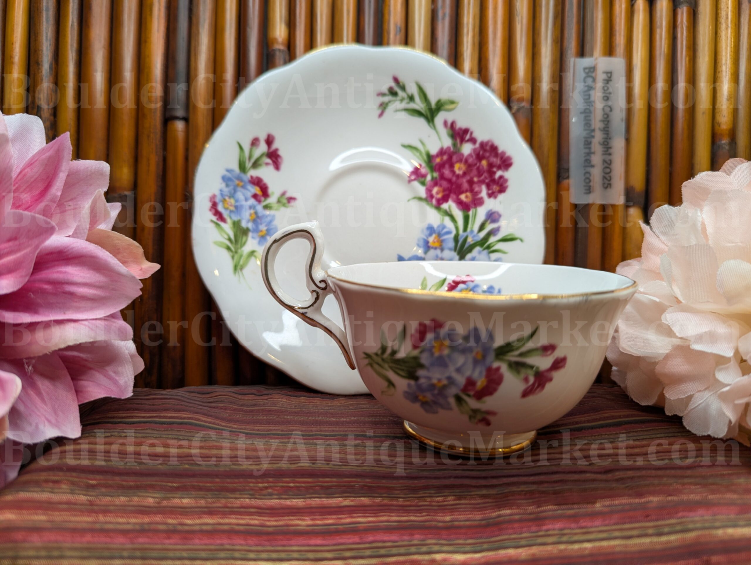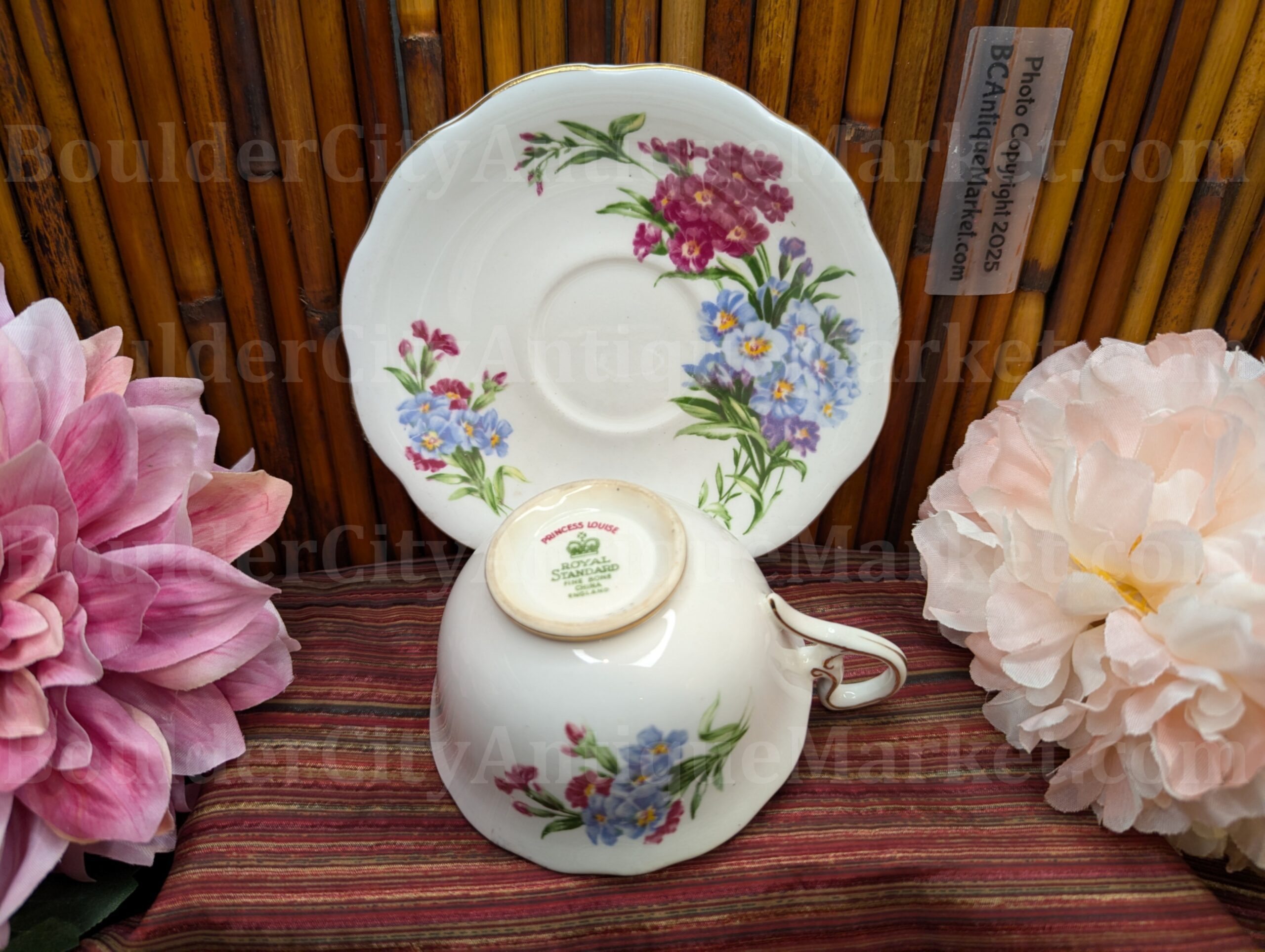 Royal Standard, fine bone china, made in England. Highly detailed teacup has full patterns inside and outside of the cup, with the same patterns on the saucer. Standard size teacup is 3.75″ diameter and saucer diameter is scalloped diameter of 5.5″. Gold edges.