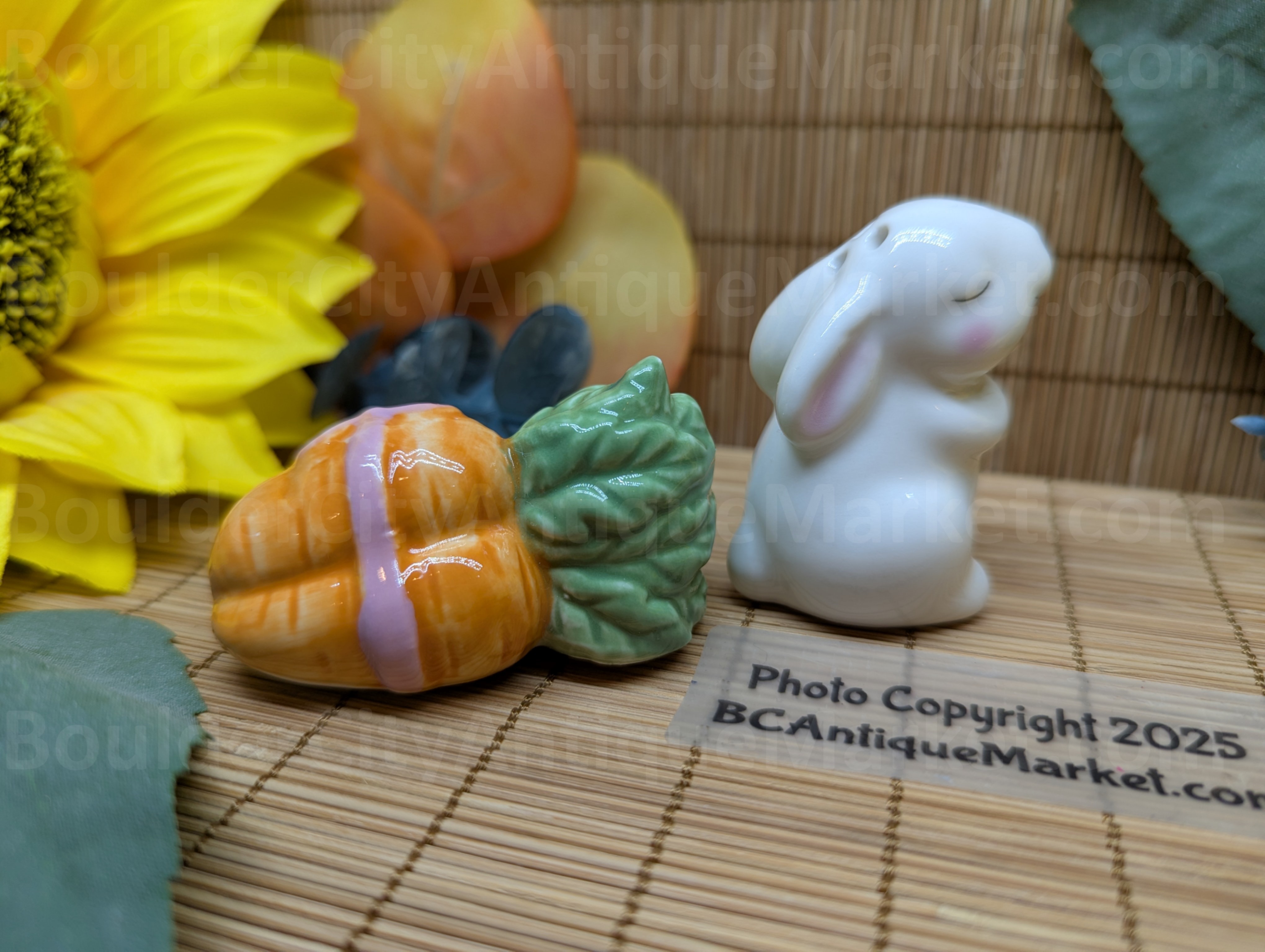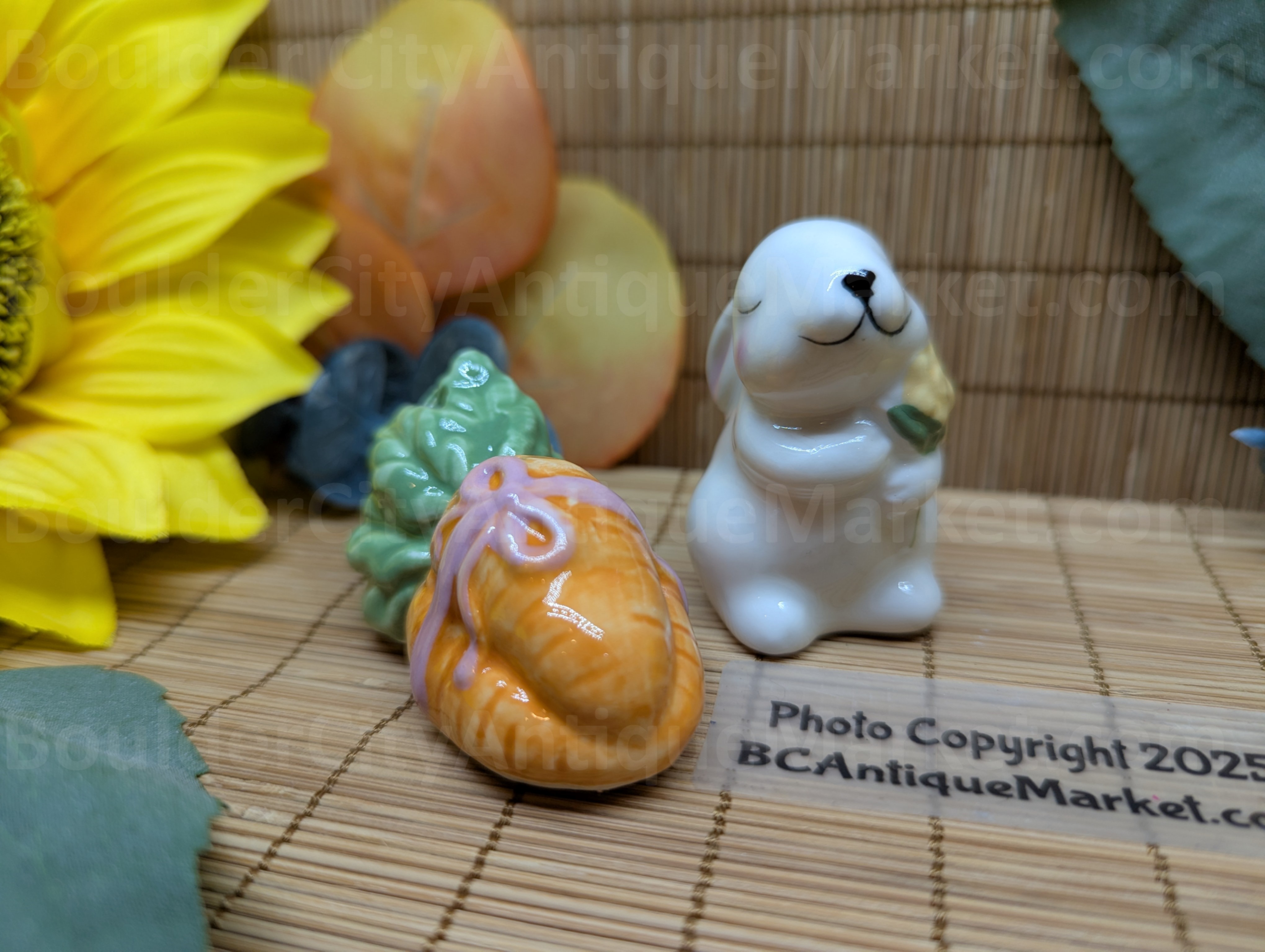 White rabbit holding a yellow bouquet and her pink ribbon wrapped carrots are sure to brighten your collection. Rabbit is 2-inches tall and carrots are 2.5-inches long.