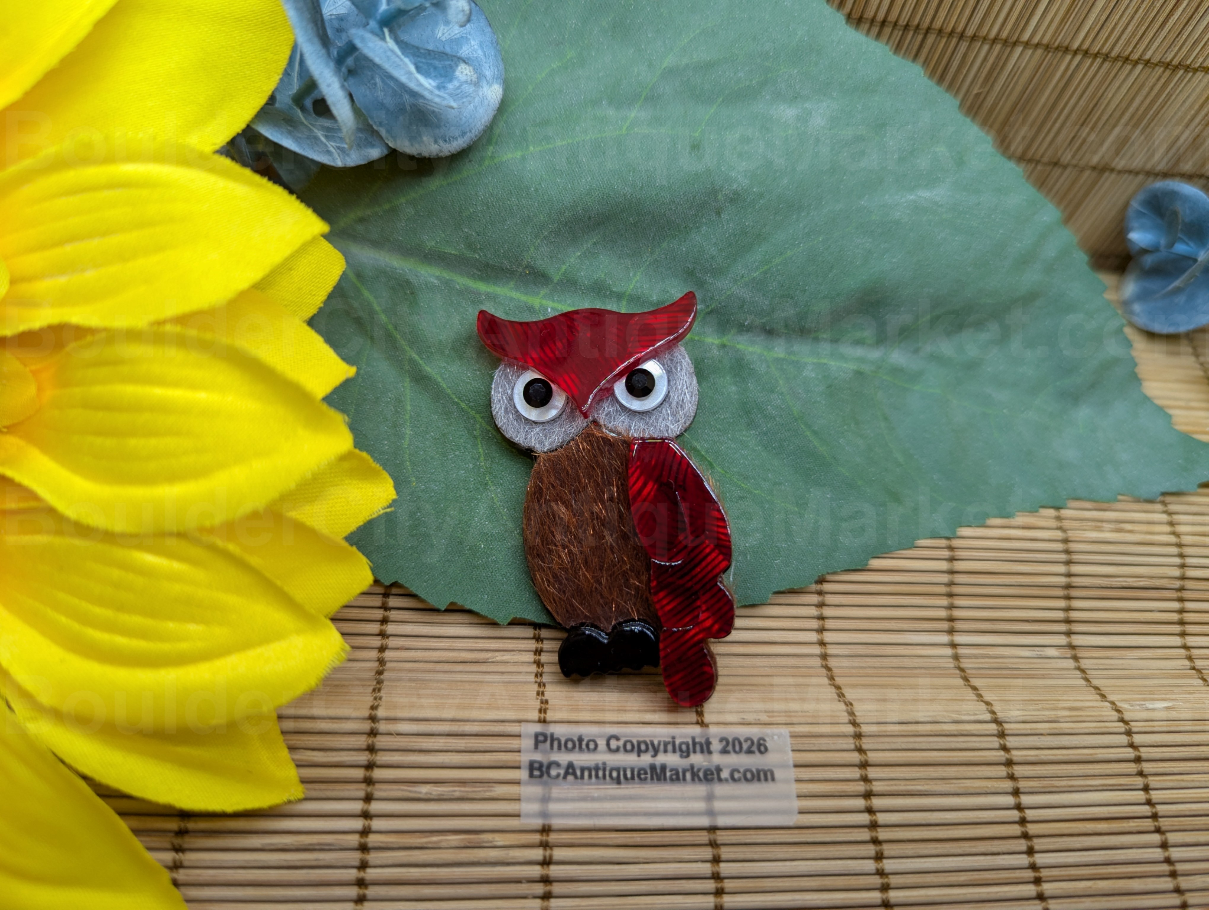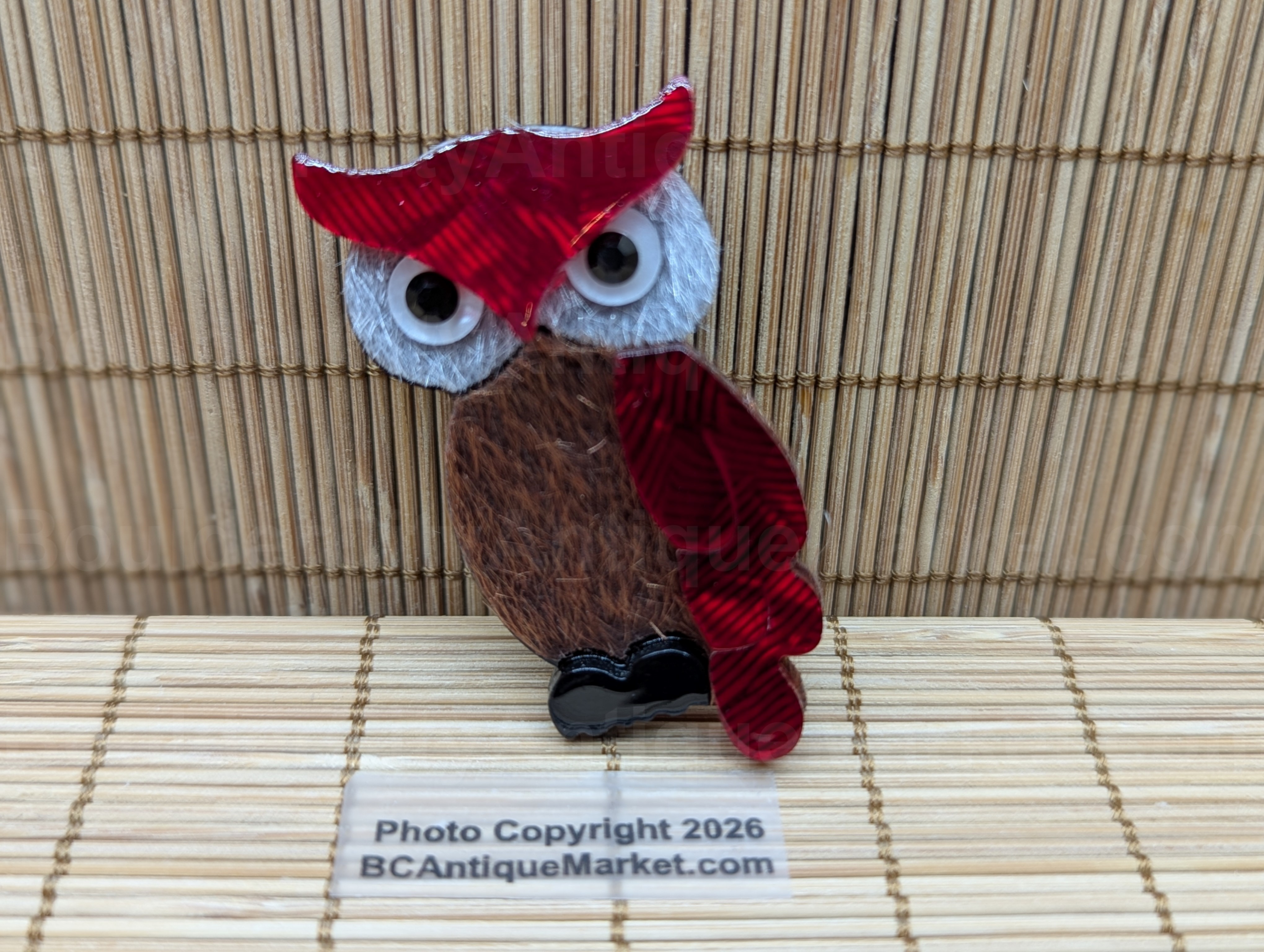 Mixed media owl brooch, red swirled acrylic forehead and wings, black acrylic feet, acrylic eyes, and fuzzy material for the brown body and white face.  2.25-inches long.