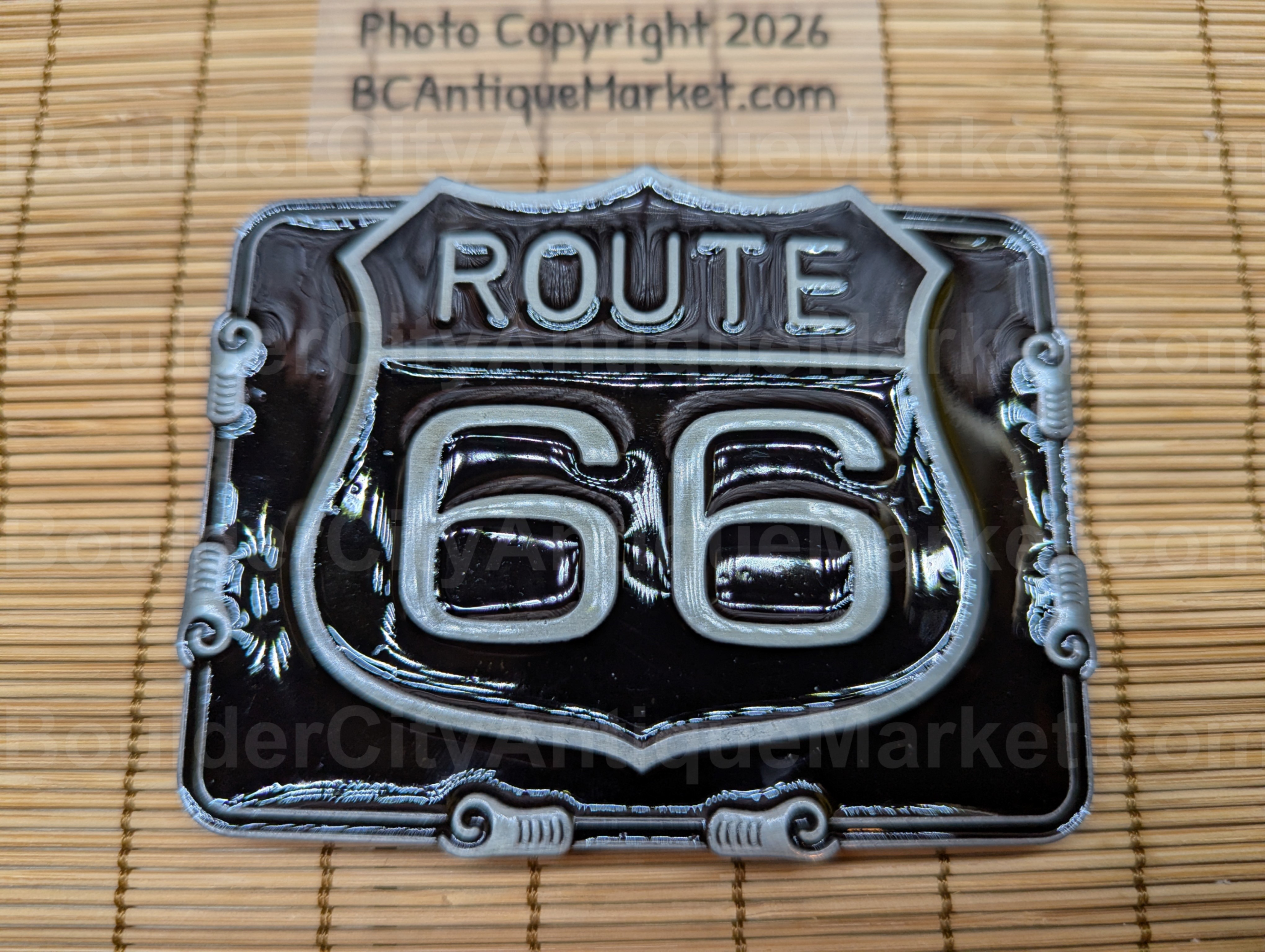 Pewter color details pop on the black enameled background of this Route 66 shield on a square framed belt buckle. The buckle is 2.75-inches tall and 3.5-inches wide.