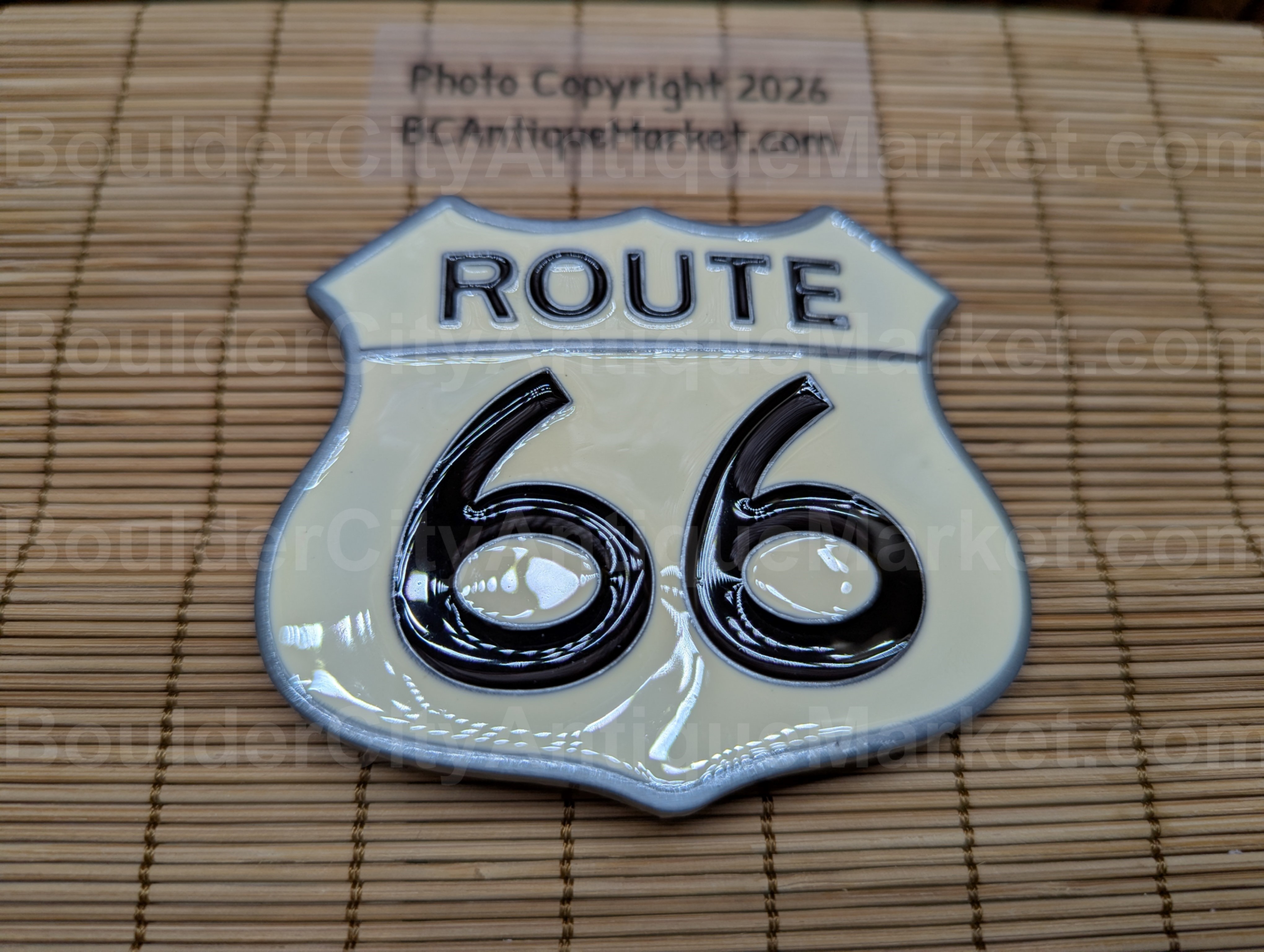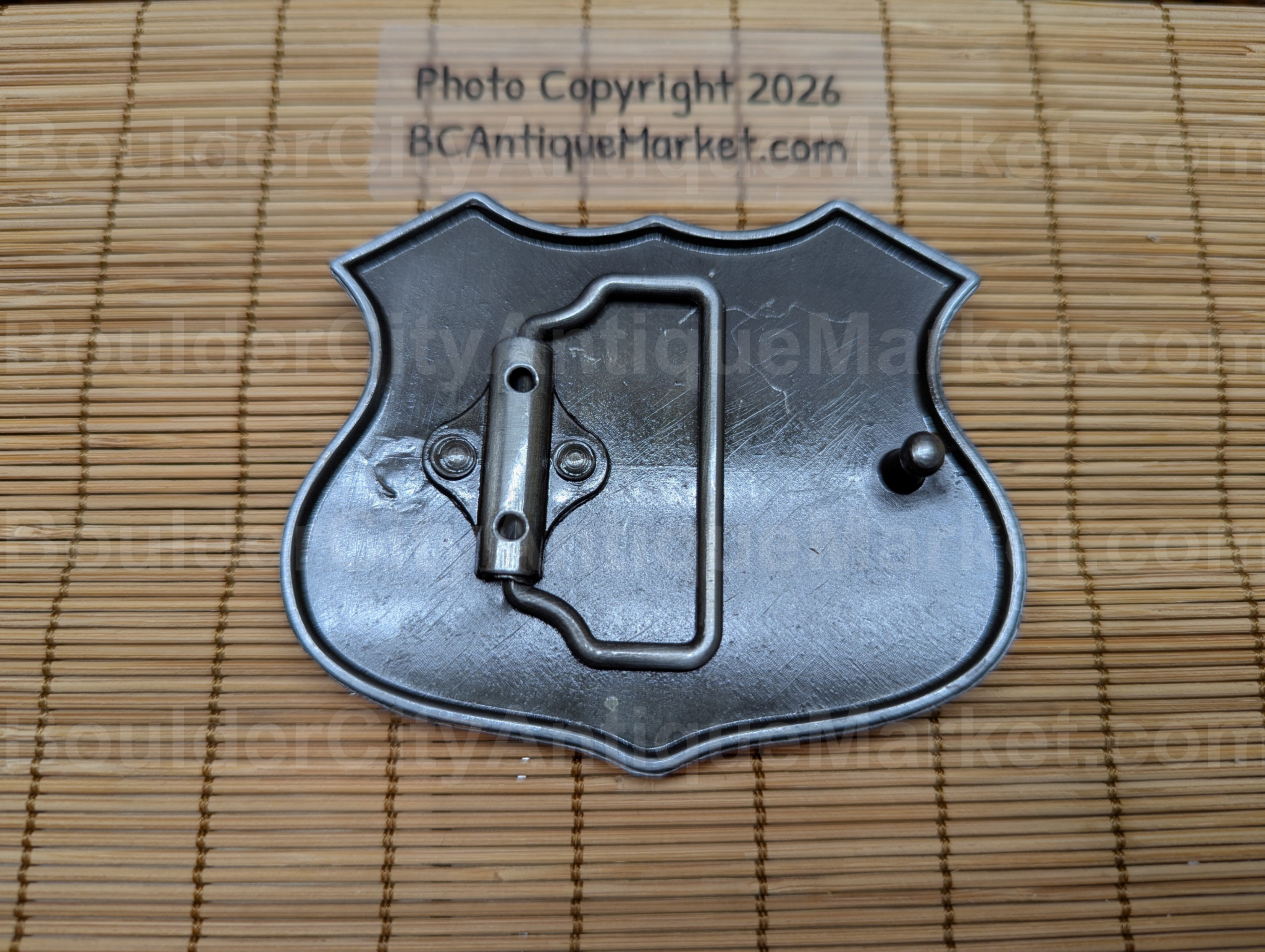 Route 66 White shield is metal based with white and black enamel details. The buckle is 2.5-inches tall and 3-inches wide.