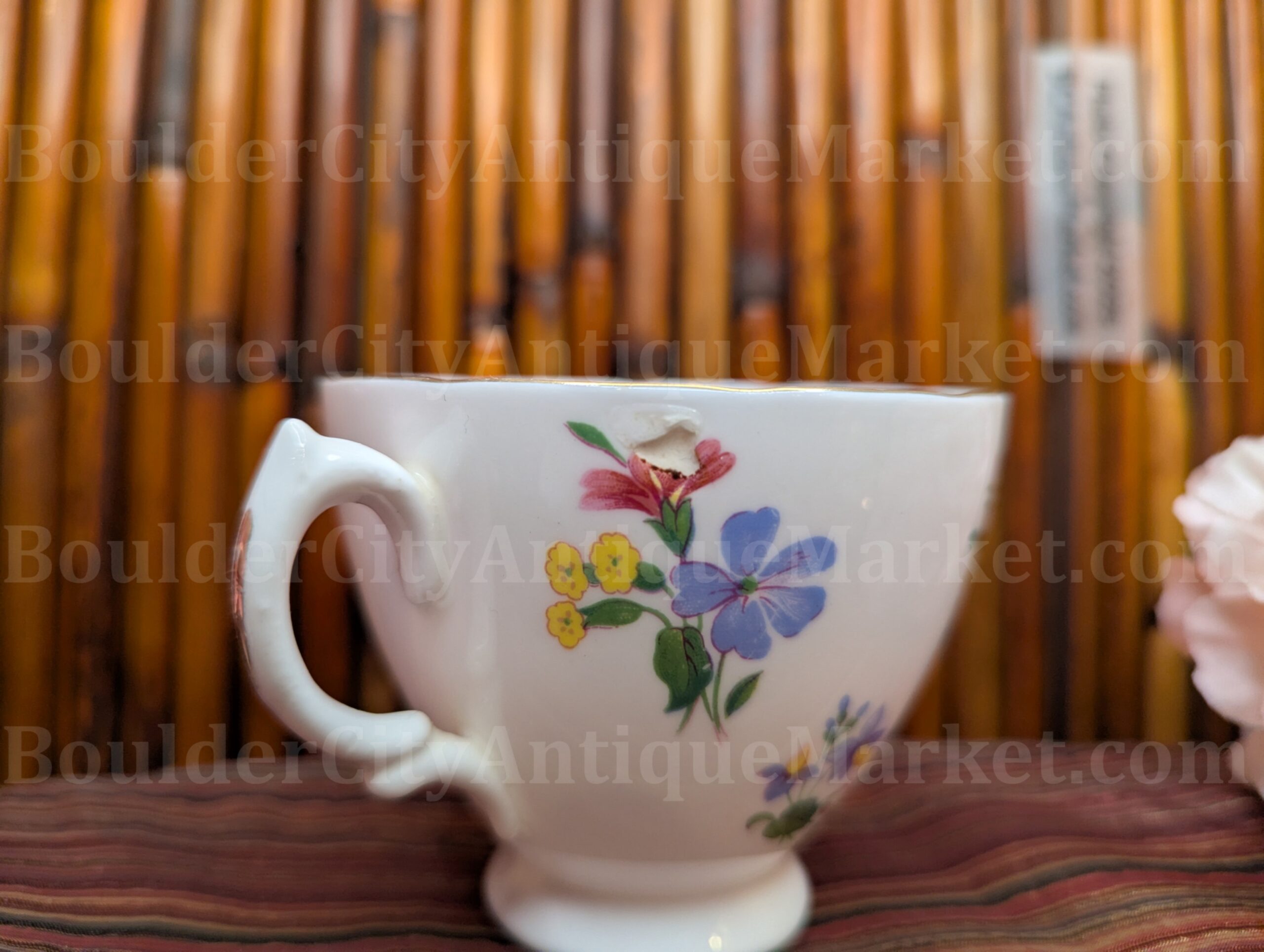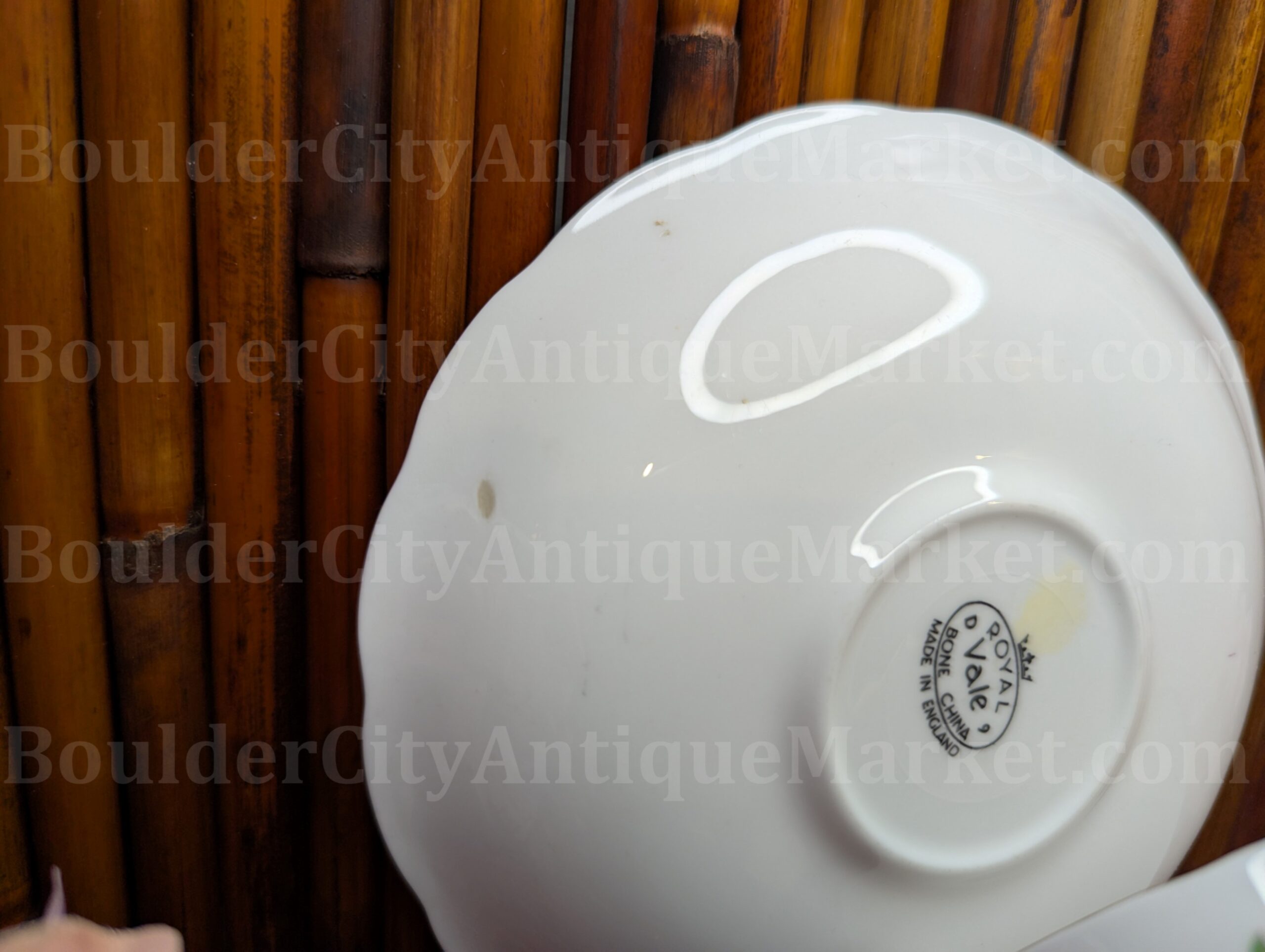 Royal Vale floral print teacup and saucer, slightly scalloped gold trimmed edges and detail on handle. made in England. Saucer is 5.5 inches diameter and has some small defects in the glaze on the bottom (see pics). Teacup is 3.25 inches in diameter and has a glaze defect near the rim of the cup (see pics). Gold is slightly worn under the handle (thumb space).