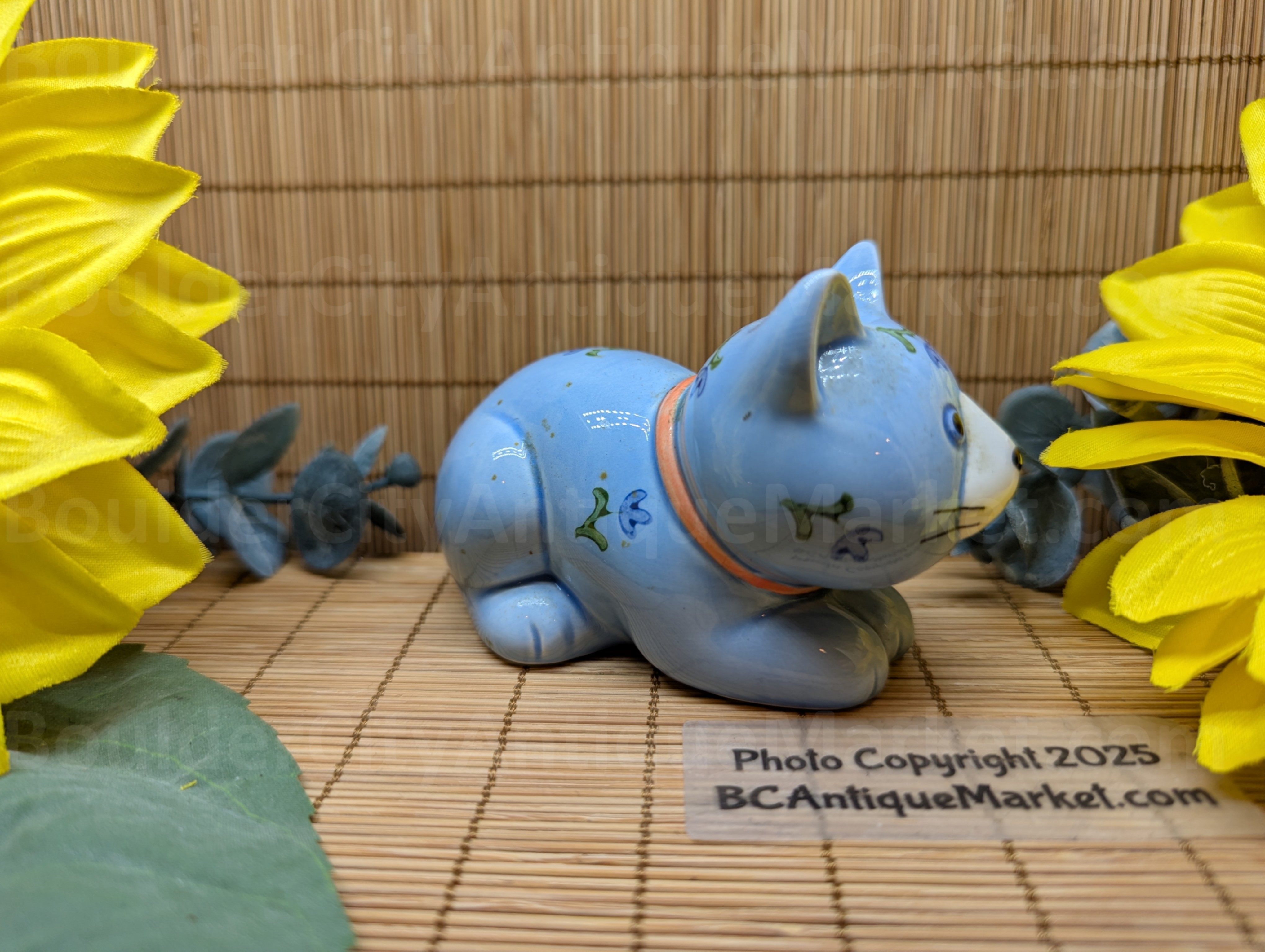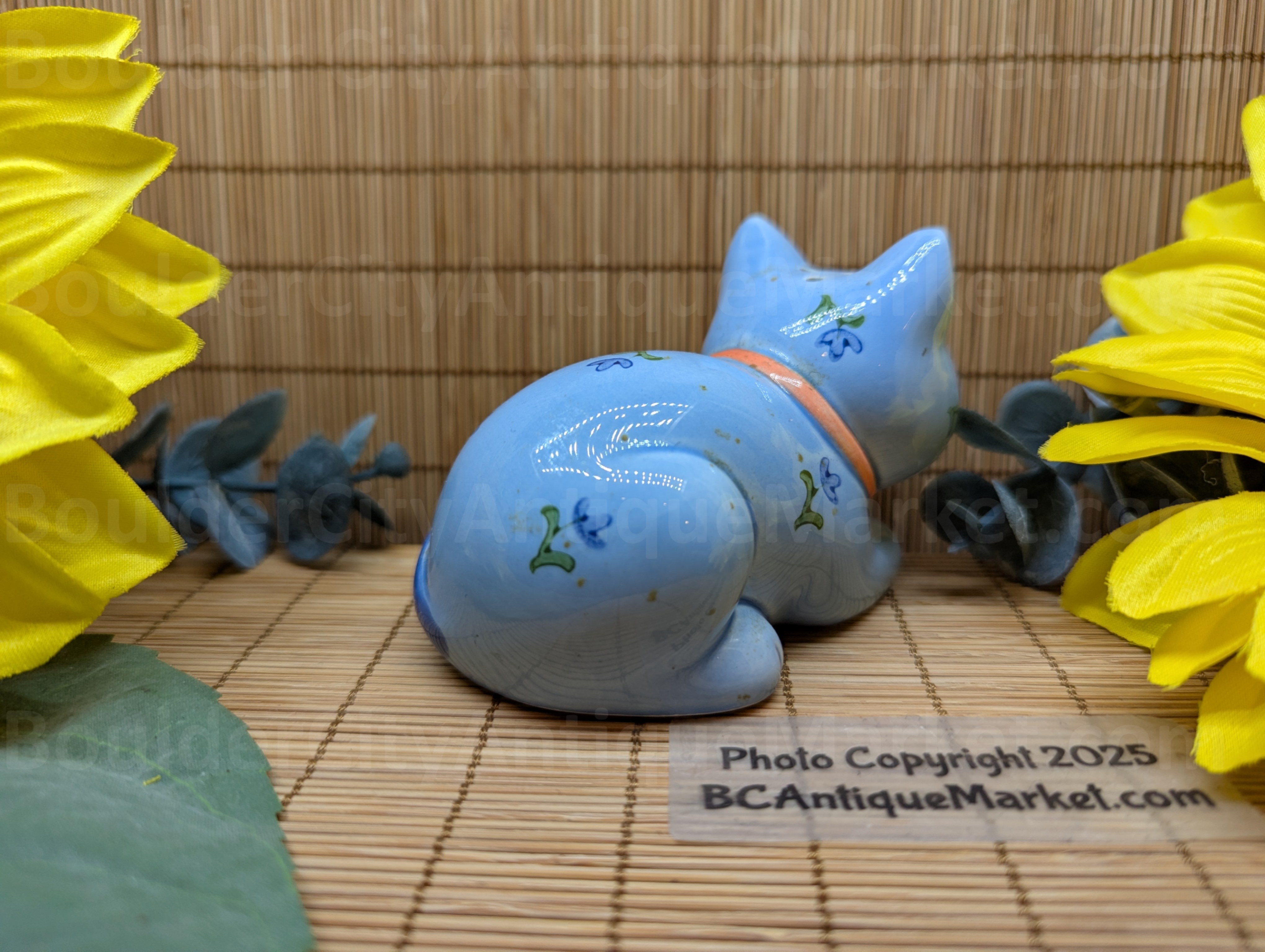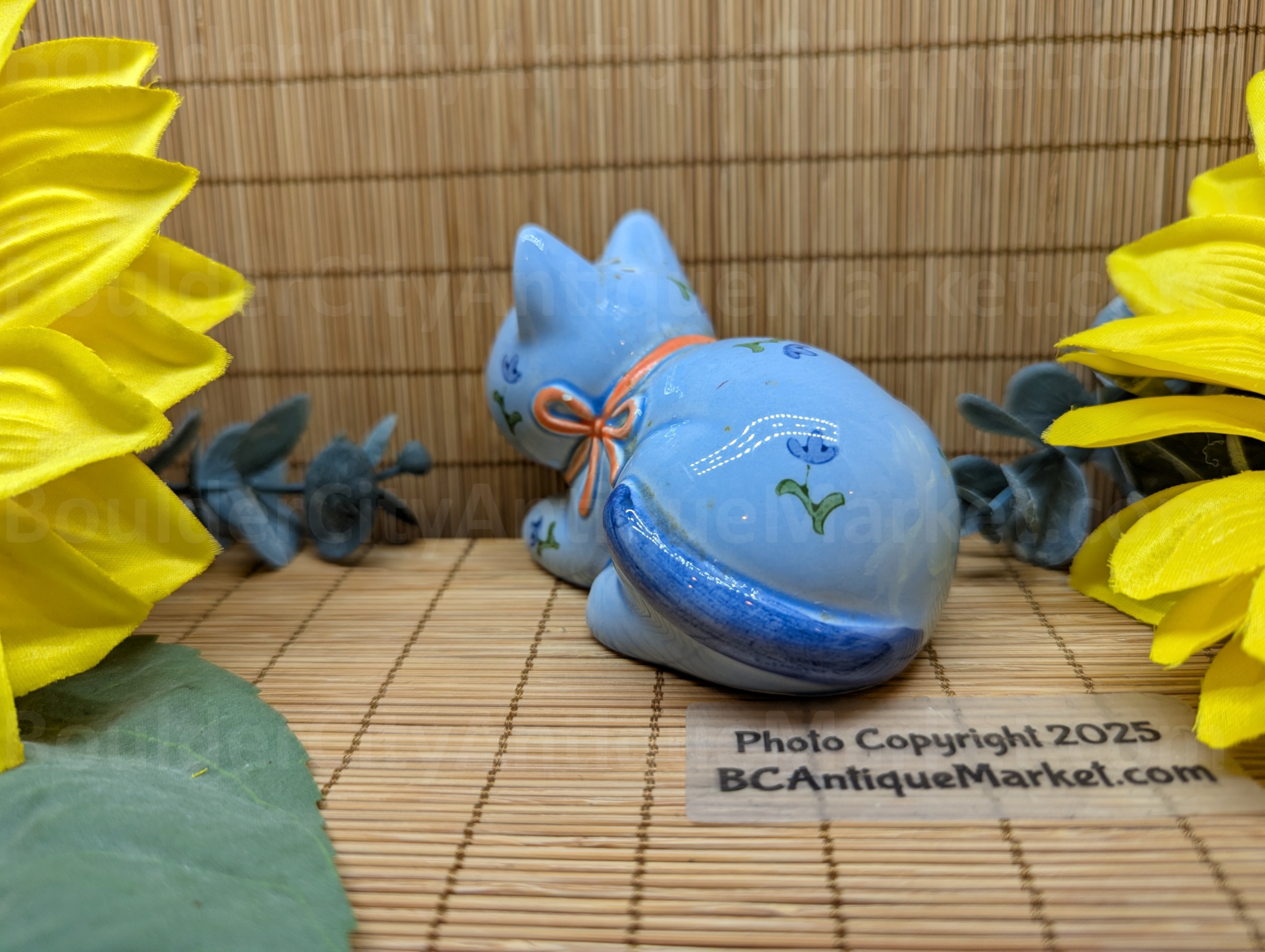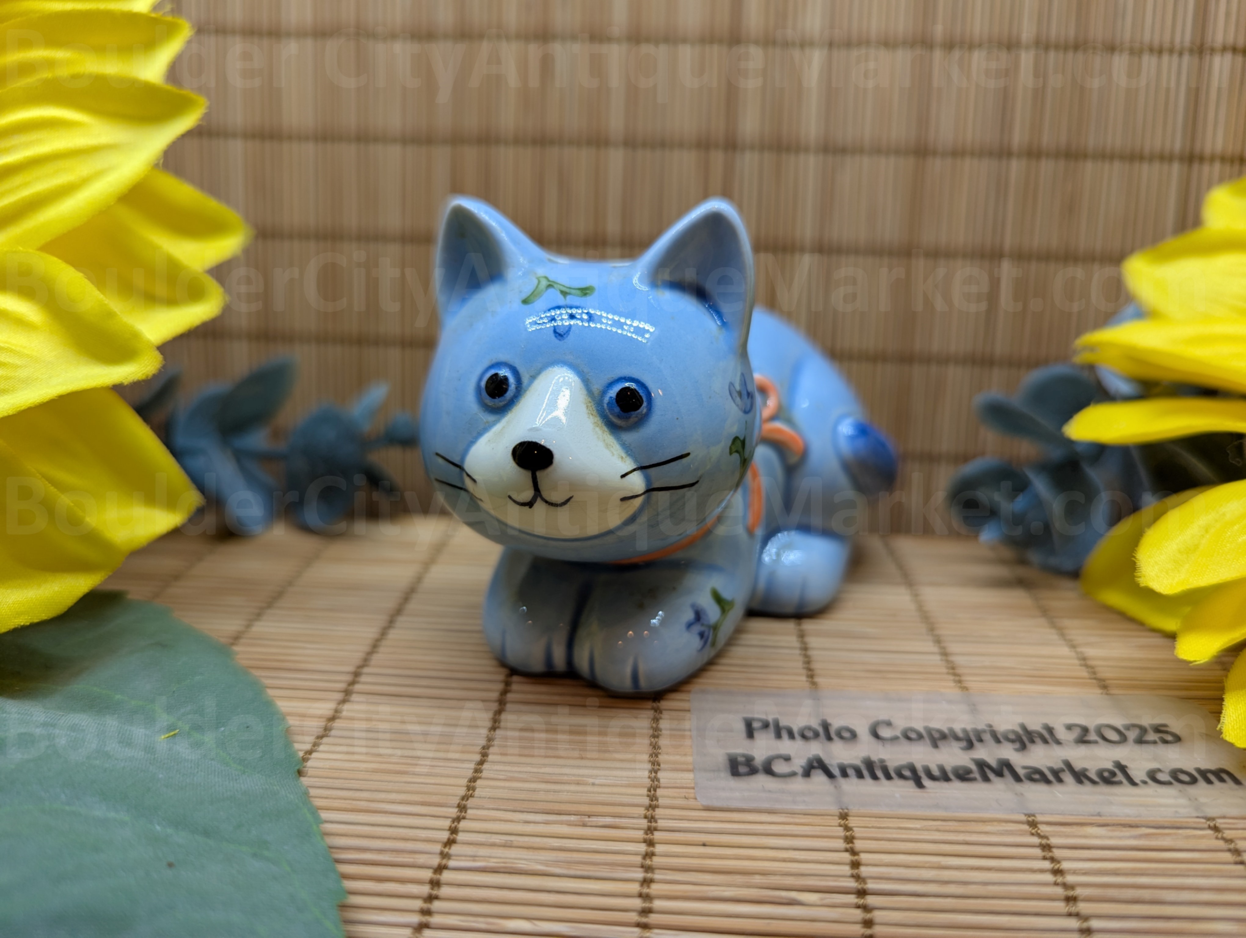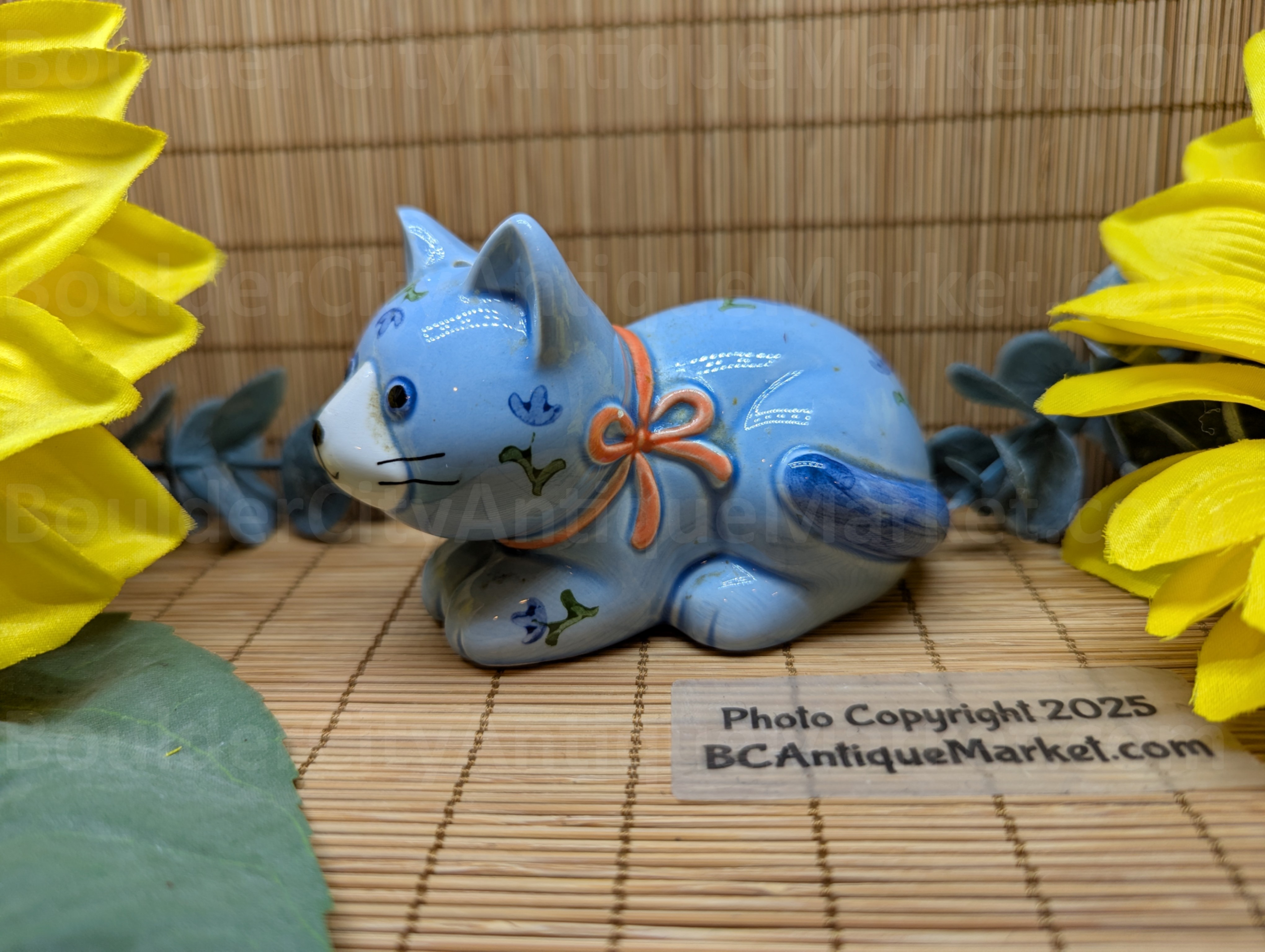 Super cute blue cat pepper shaker (three holes), marked Otagiri. Very slight chip on the orange ribbon, measures 3.25 inches long and two inches high.