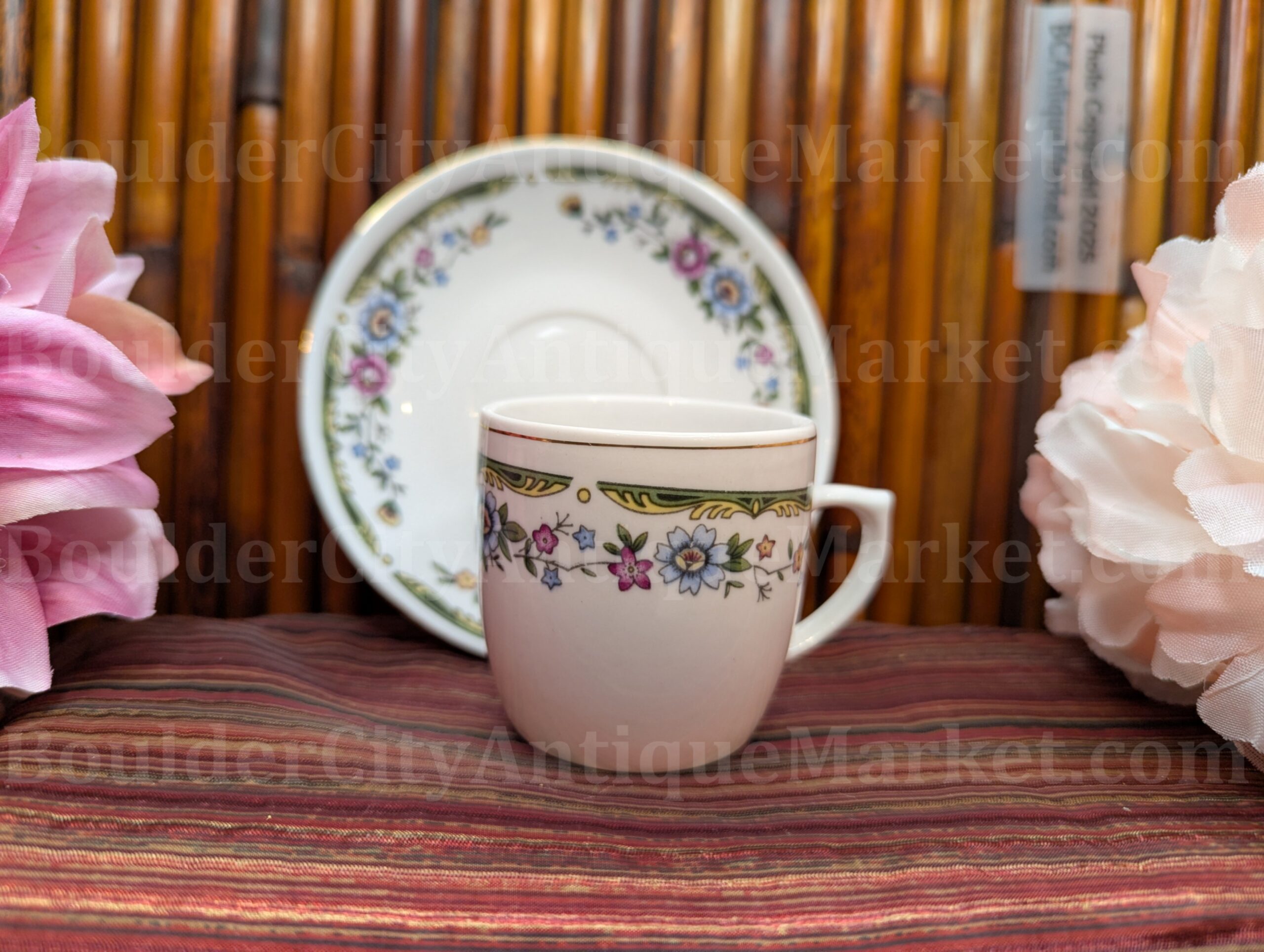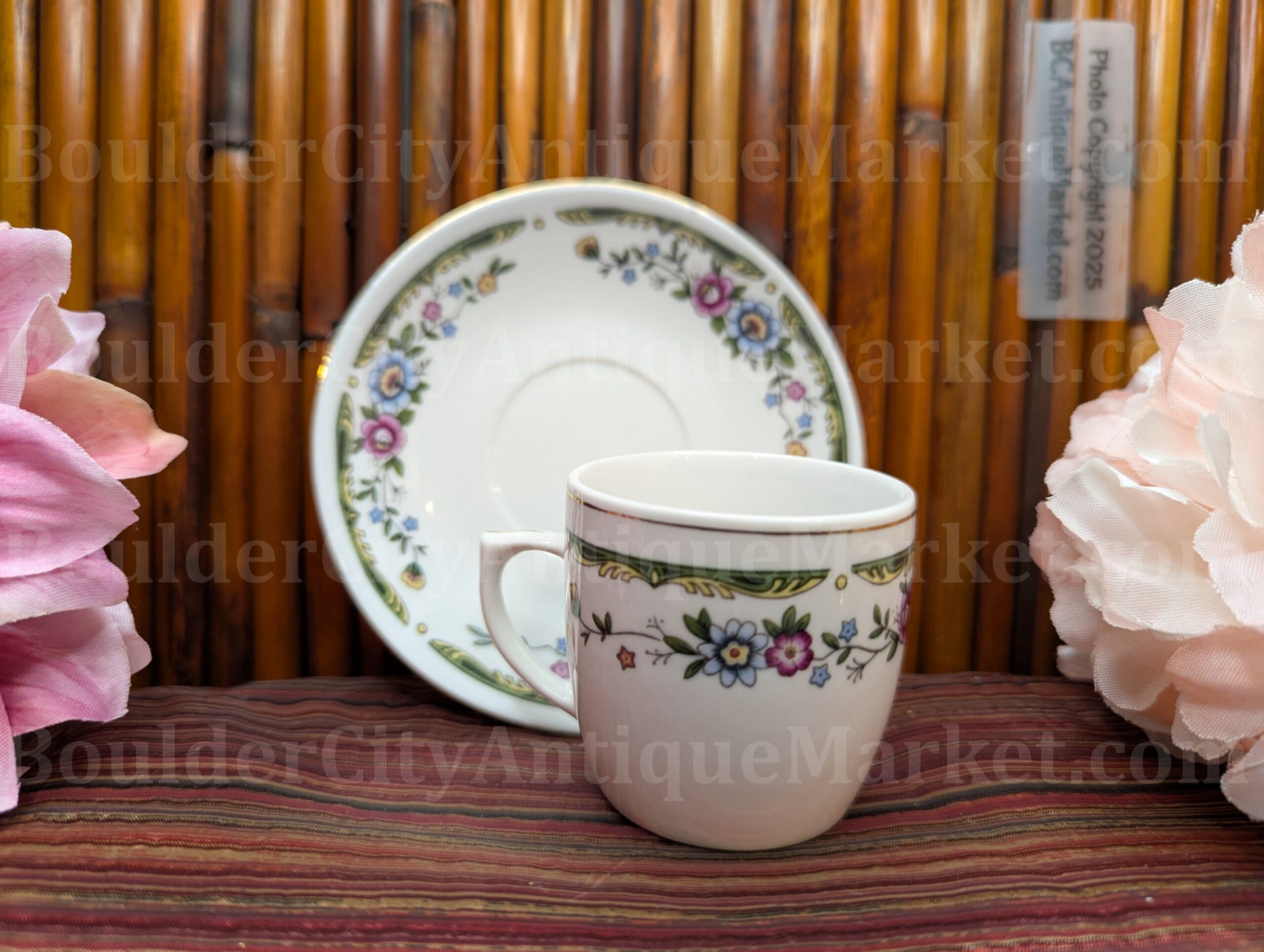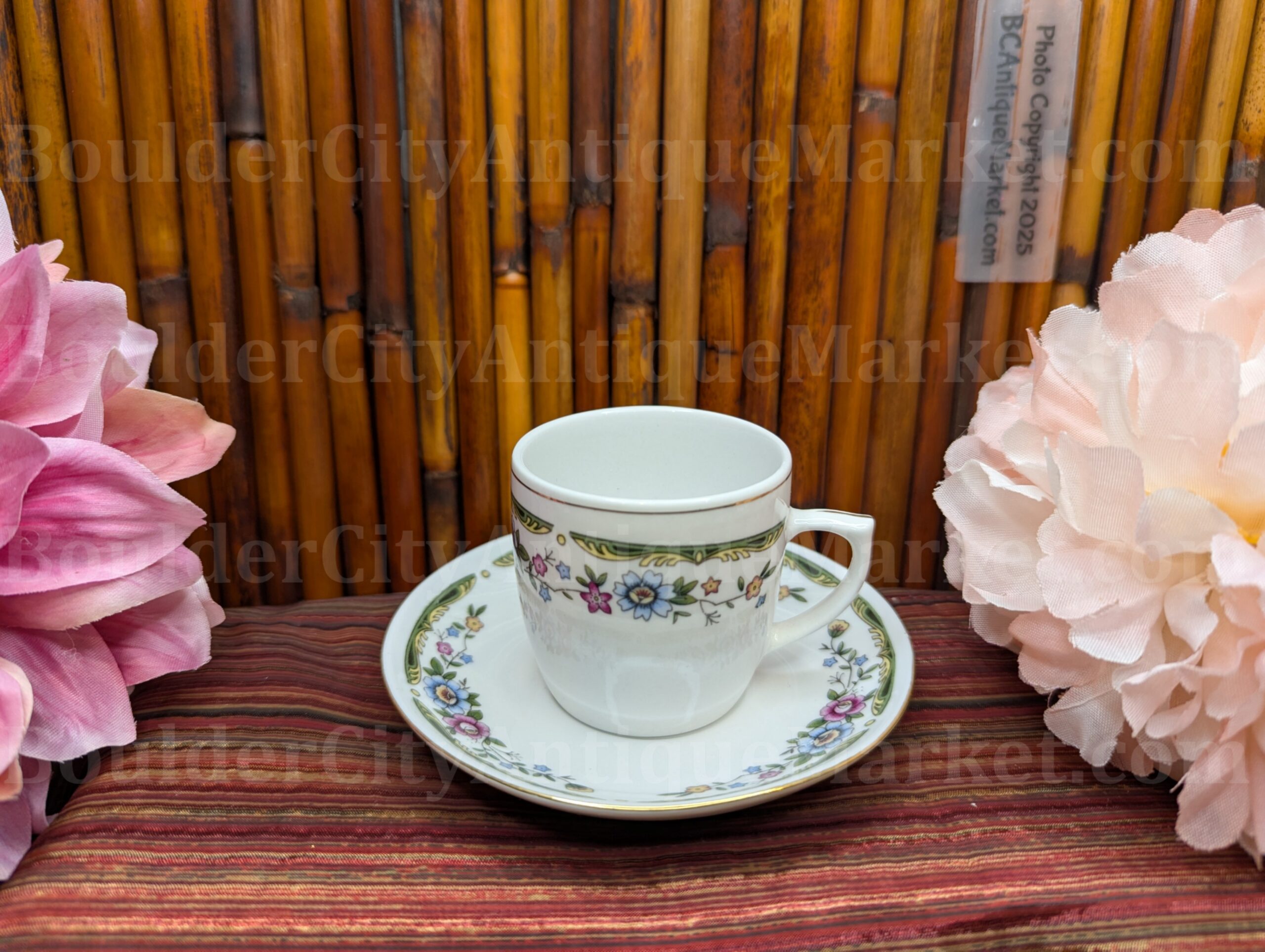 This is a more modern, small two-inch diameter teacup and 4.25-inch saucer set featuring a floral design. We don’t know the age, it has characters and Made in China, so we’re calling it modern. It’s small and cute!