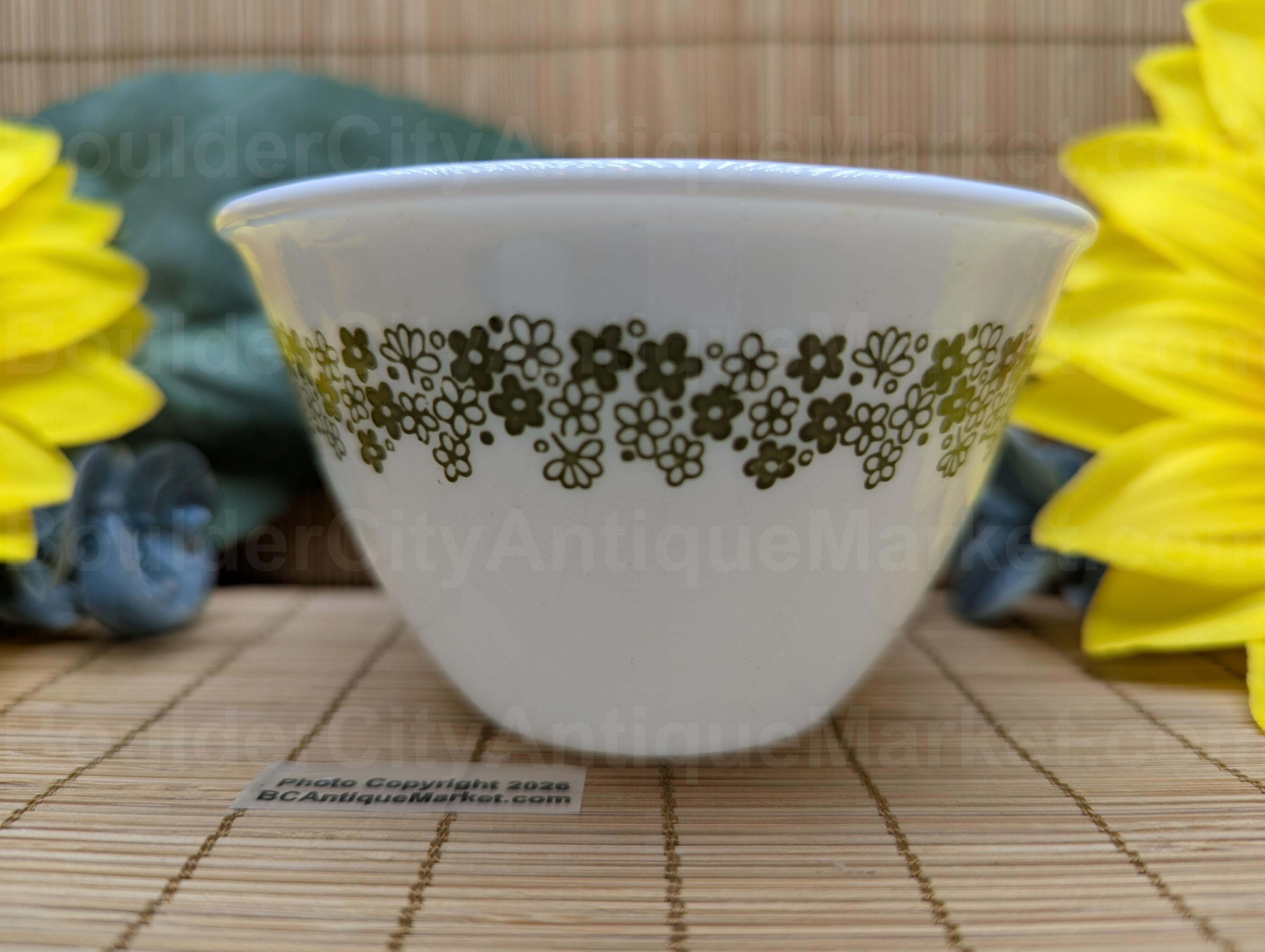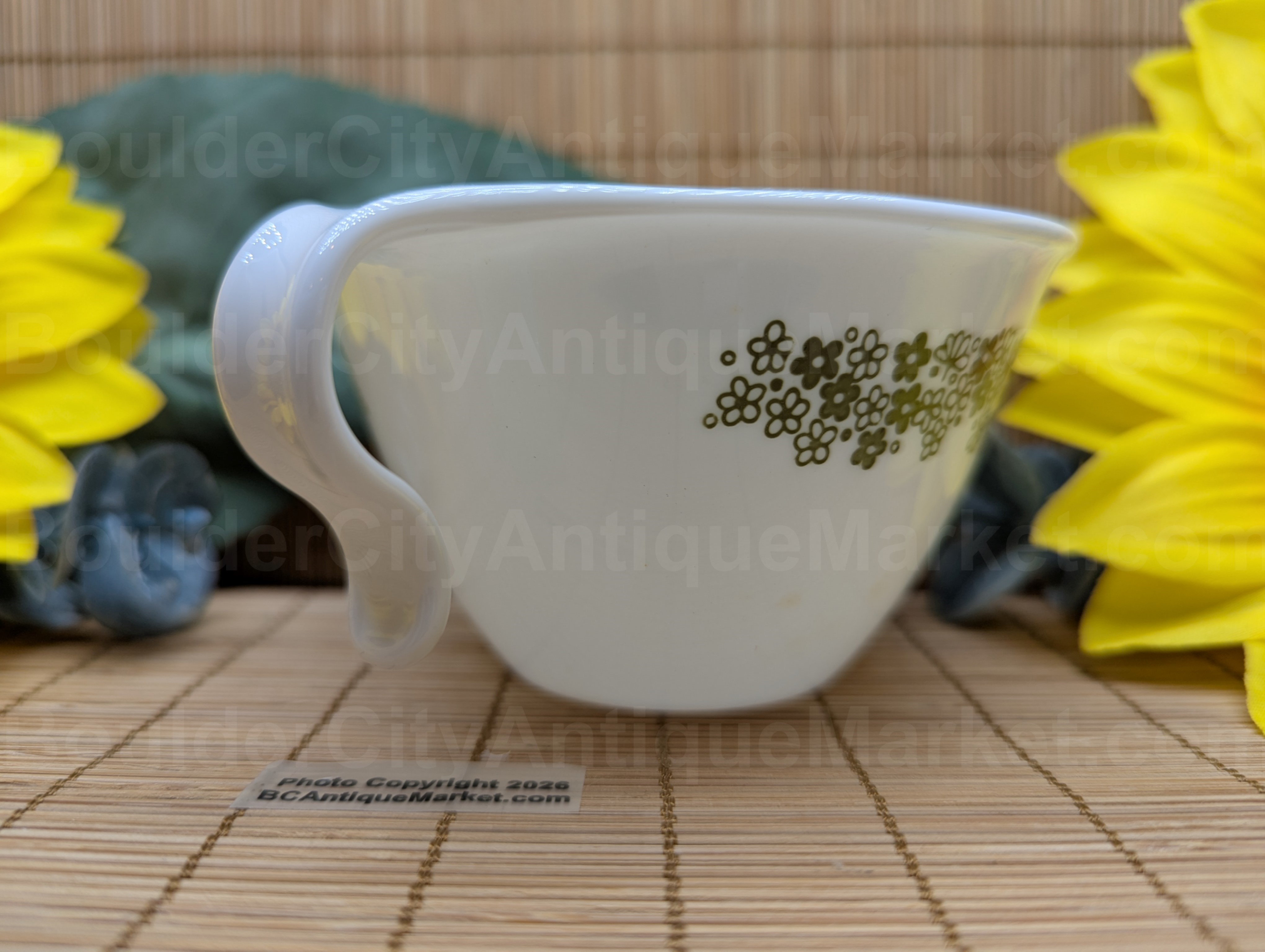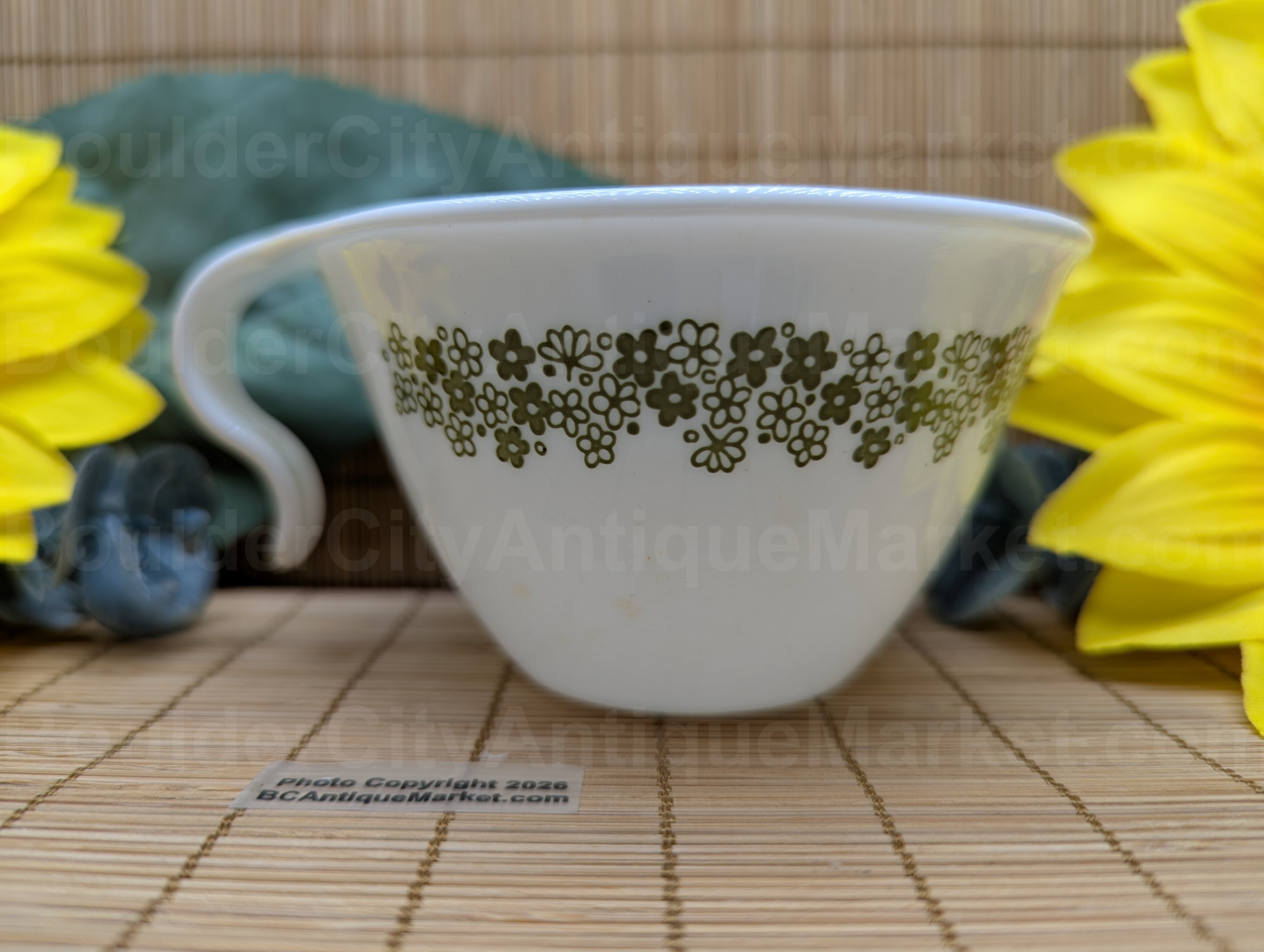 Marked Corelle by Corning, these hooked cups are in the Spring Blossom Green (Crazy Daisy) pattern manufactured between 1972 to 1986 with a redesign in 1979 as one of the original Corelle Livingware pattern.