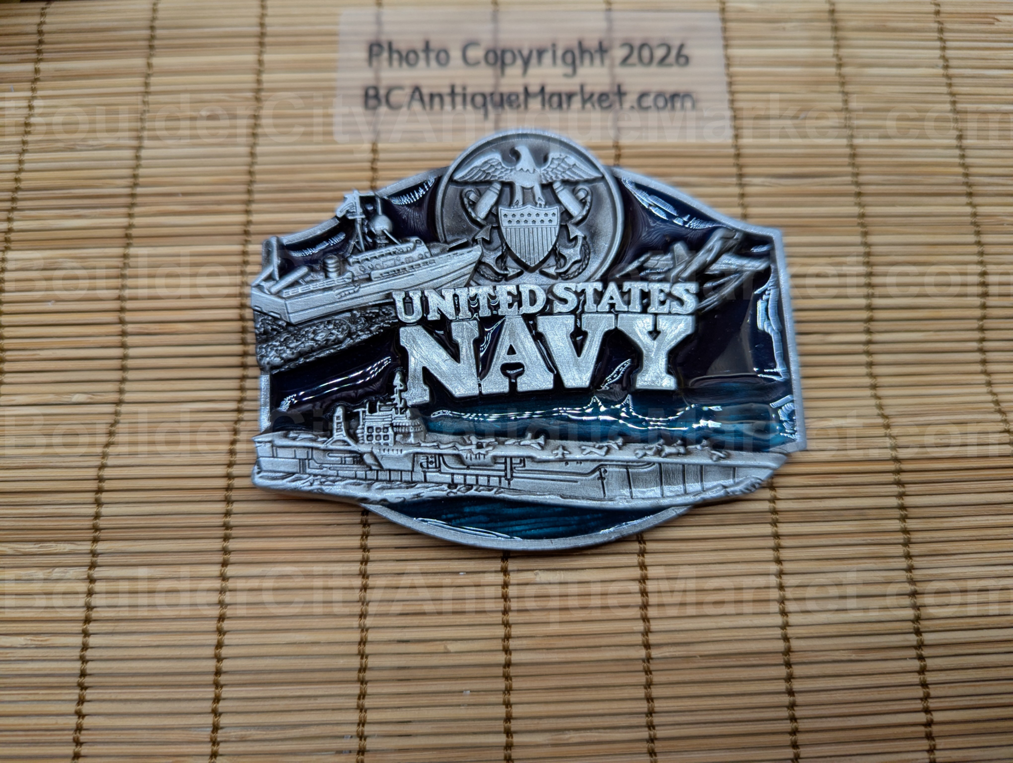 Blue and black enamel background set off the shield and ships on the face of this approved United States Navy belt buckle. This buckle is 2.5-inches tall and 3-inches wide. This buckle is approved by the USN.