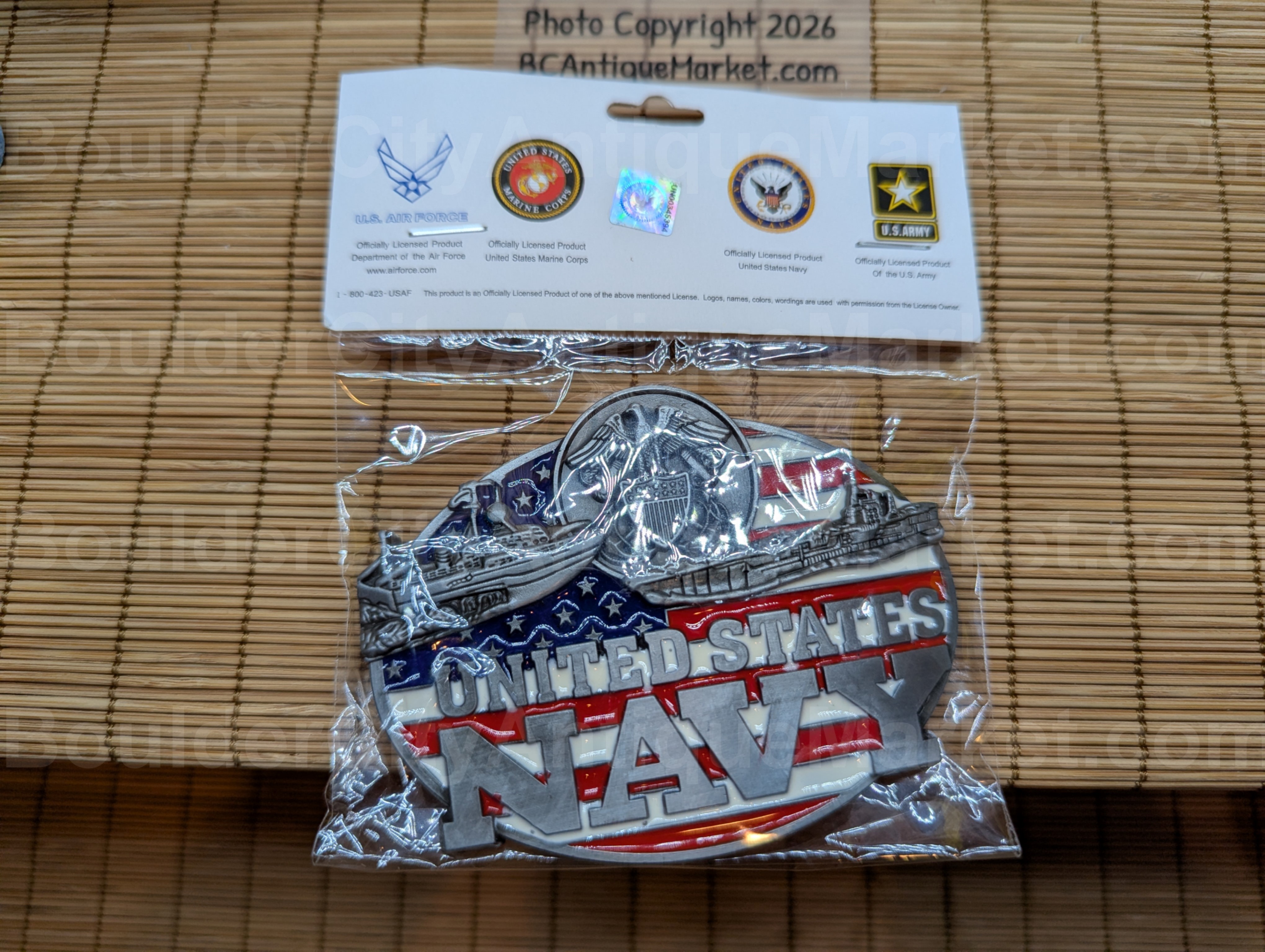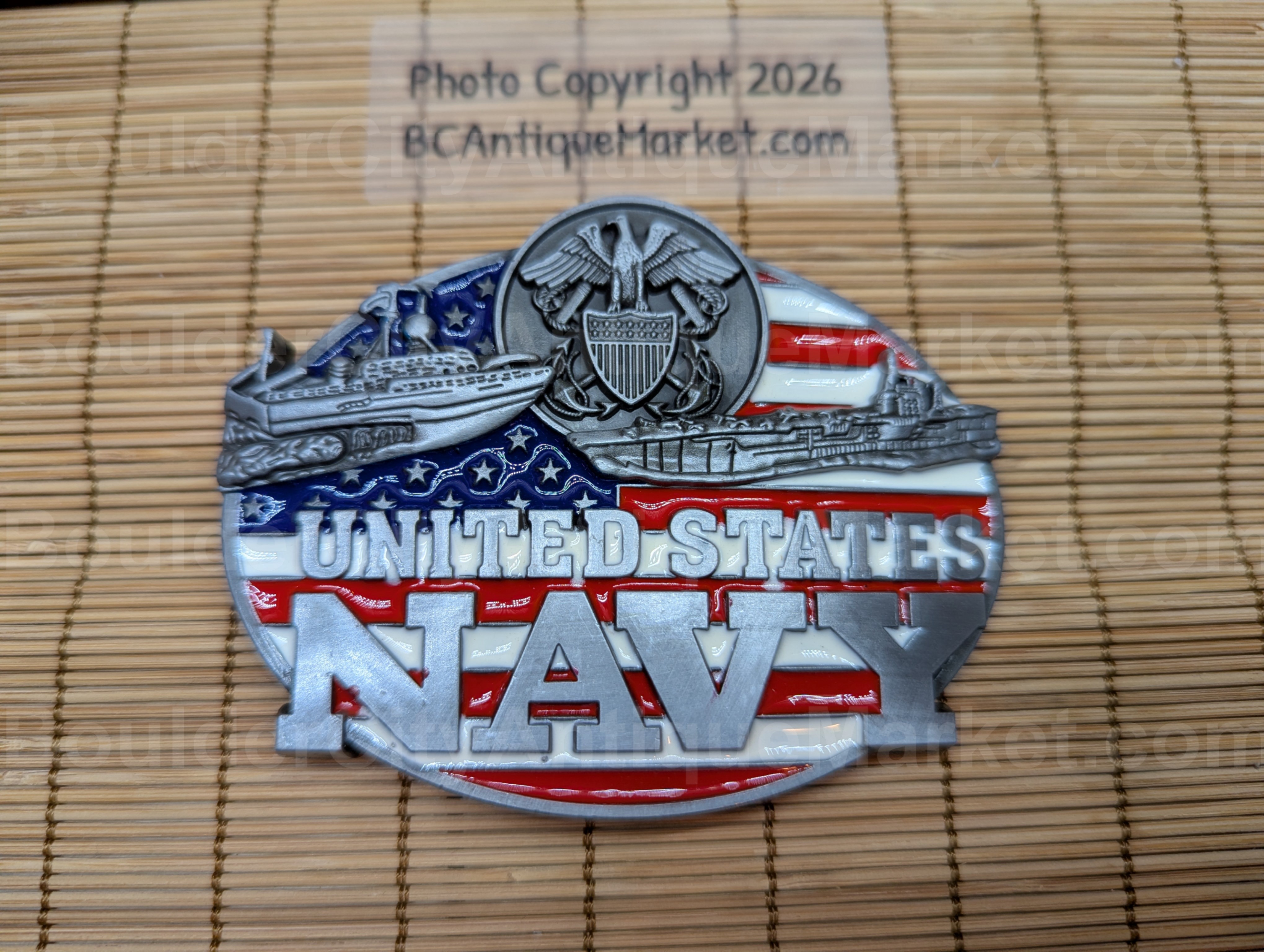 United States Navy ships and shield on an enamel United States flag background. Belt buckle is 2.75-inches tall and 3.5-inches long. This buckle is approved by the USN.