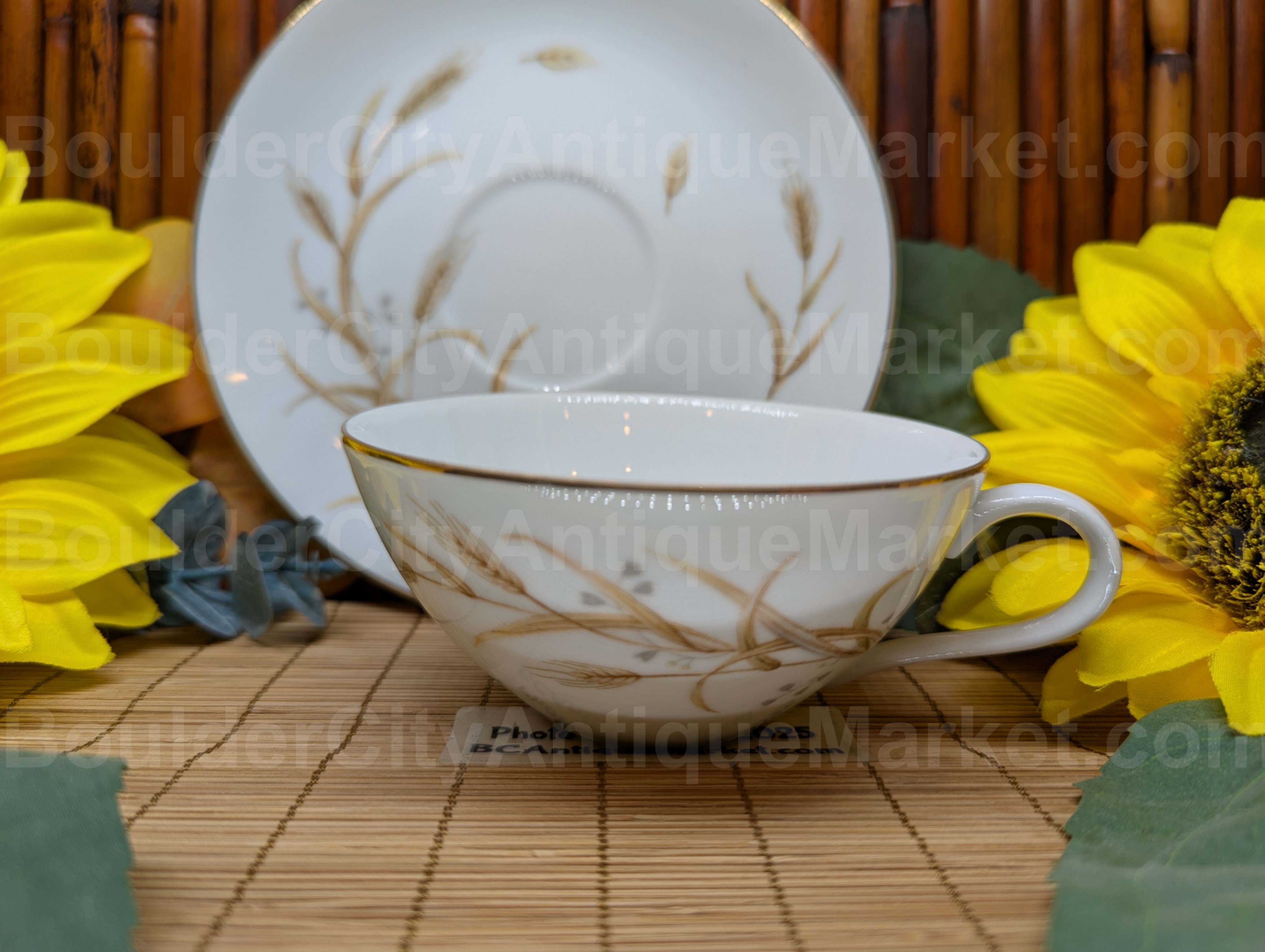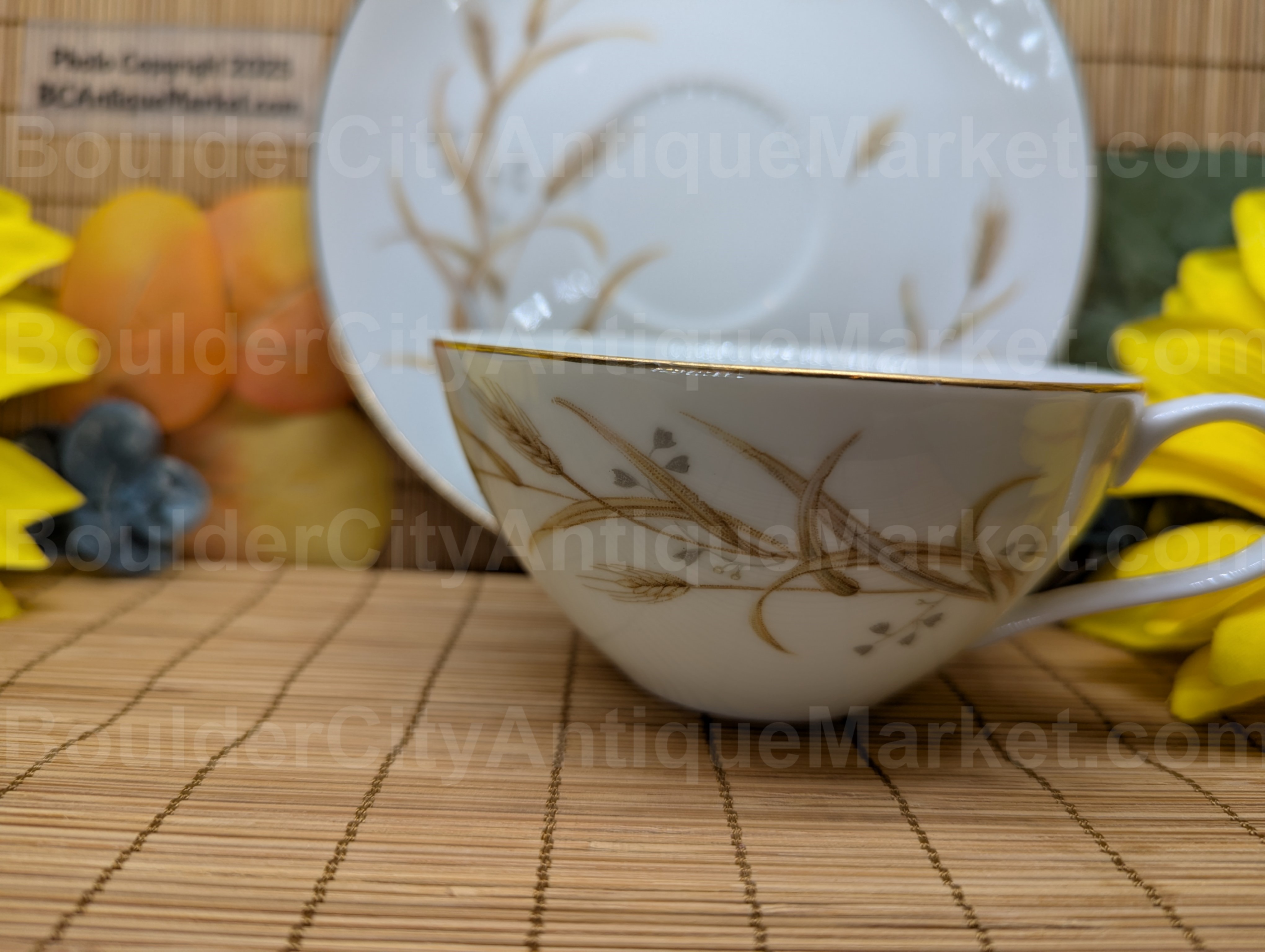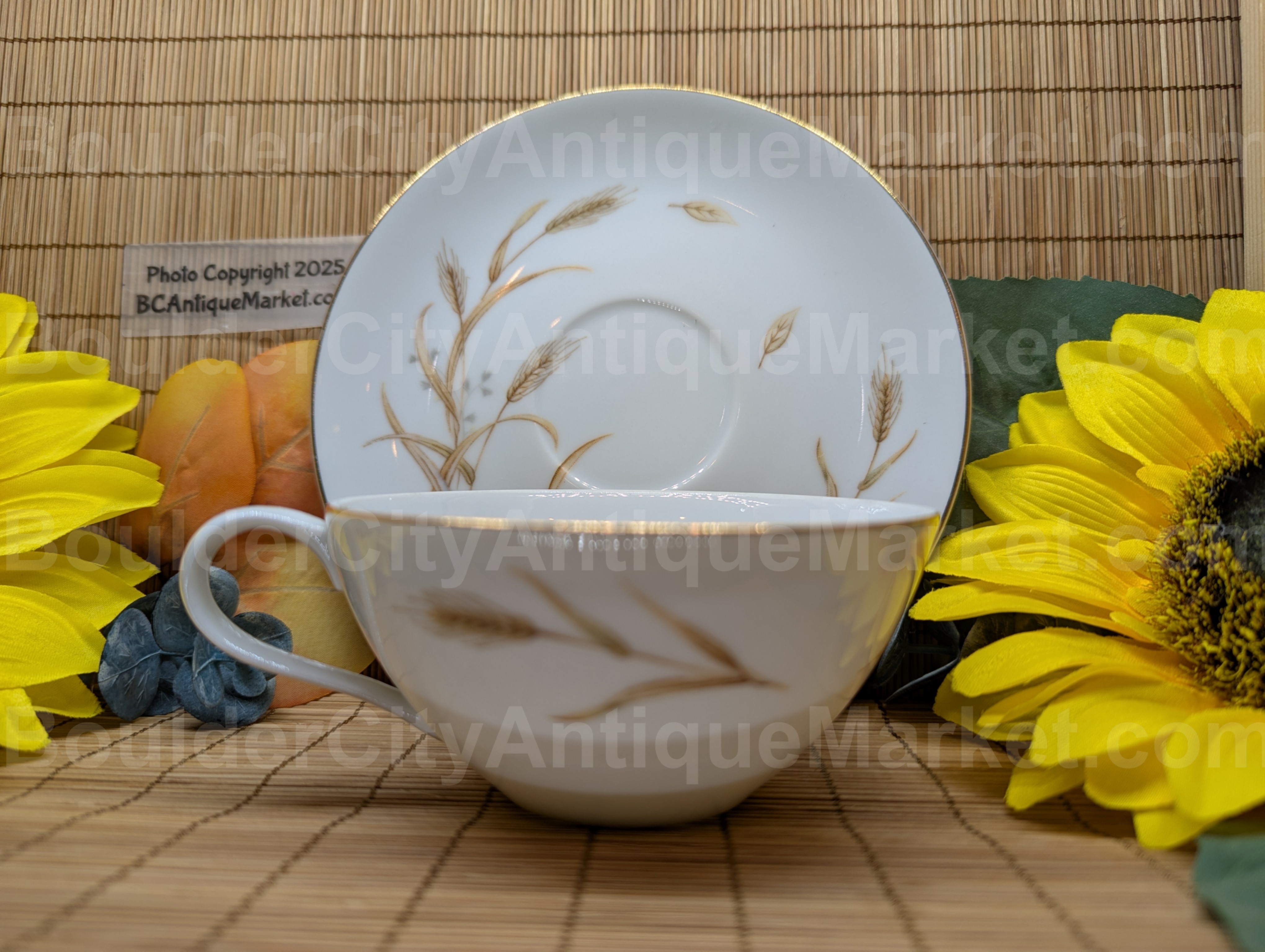 Golden Wheat, Made in Japan by Violet China in 1950 to the early 1960s. This pattern features silver and grey details woven between the golden wheat, along with gold details on the cup and saucer. The cup is 4-inches in diameter, and the saucer is a tad over 6-inches in diameter.