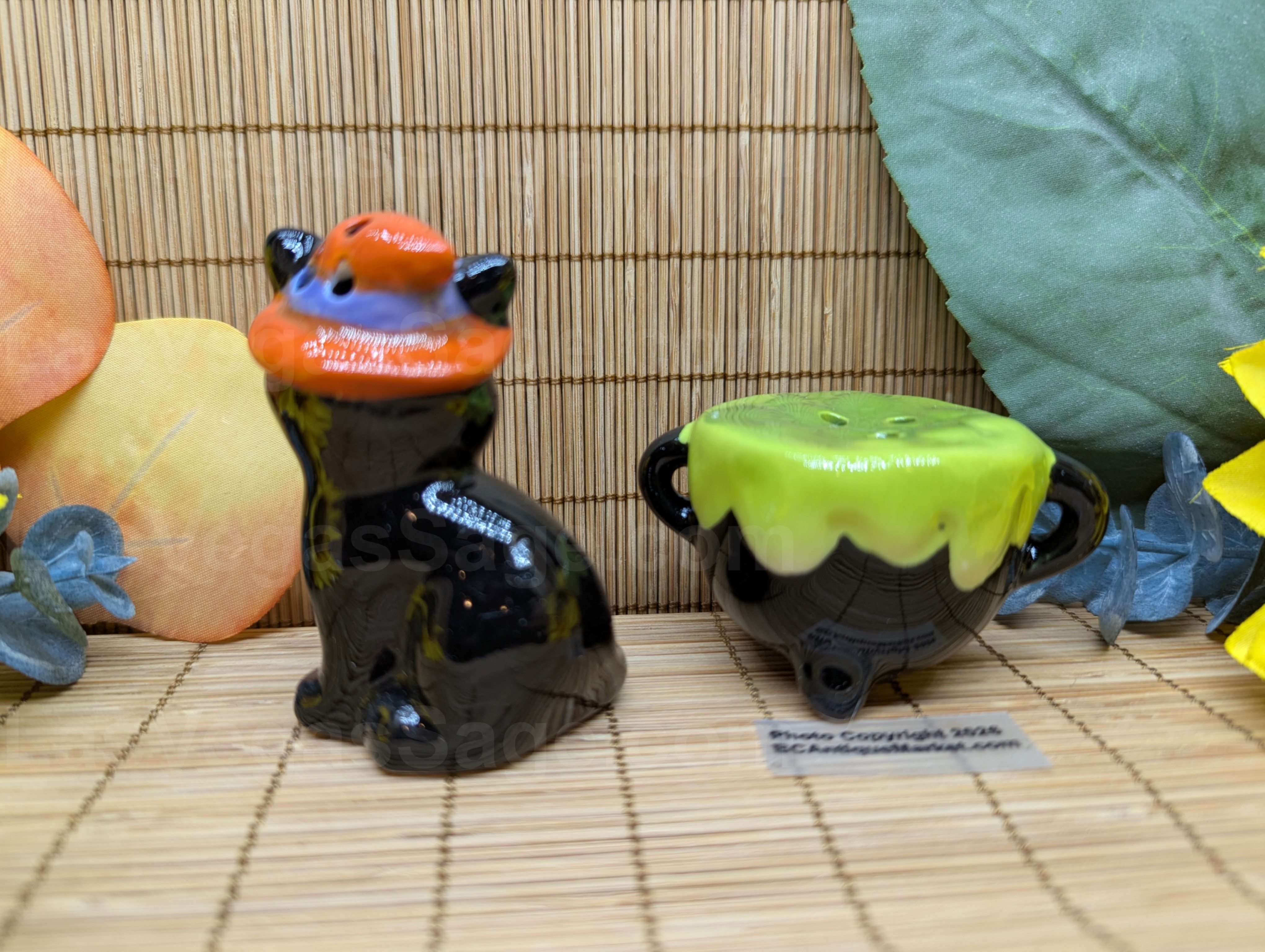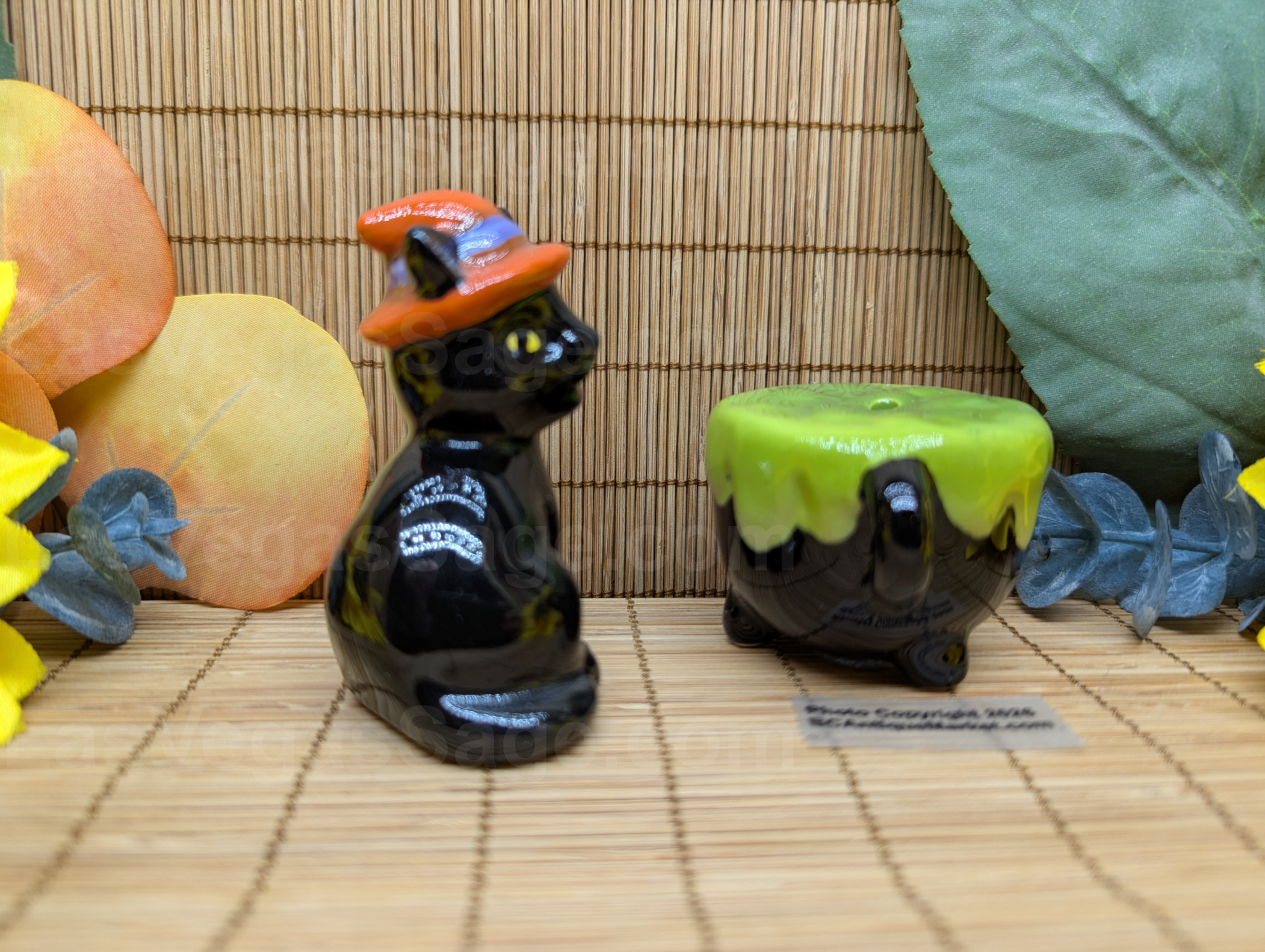 Yellow eyed black cat in an orange witch’s hat watches over her green bubbling cauldron. Cat is aprox 2.75 inches tall.