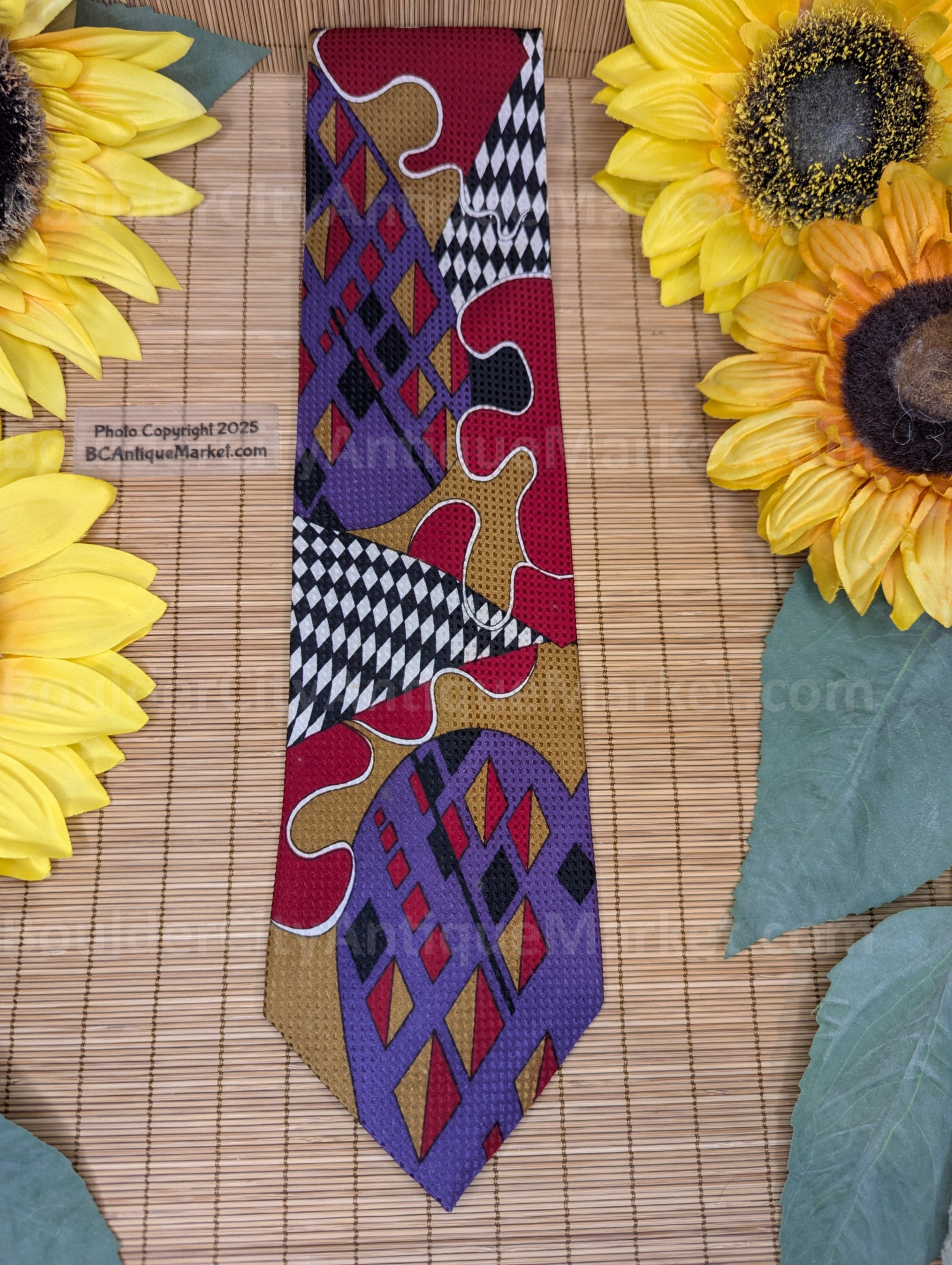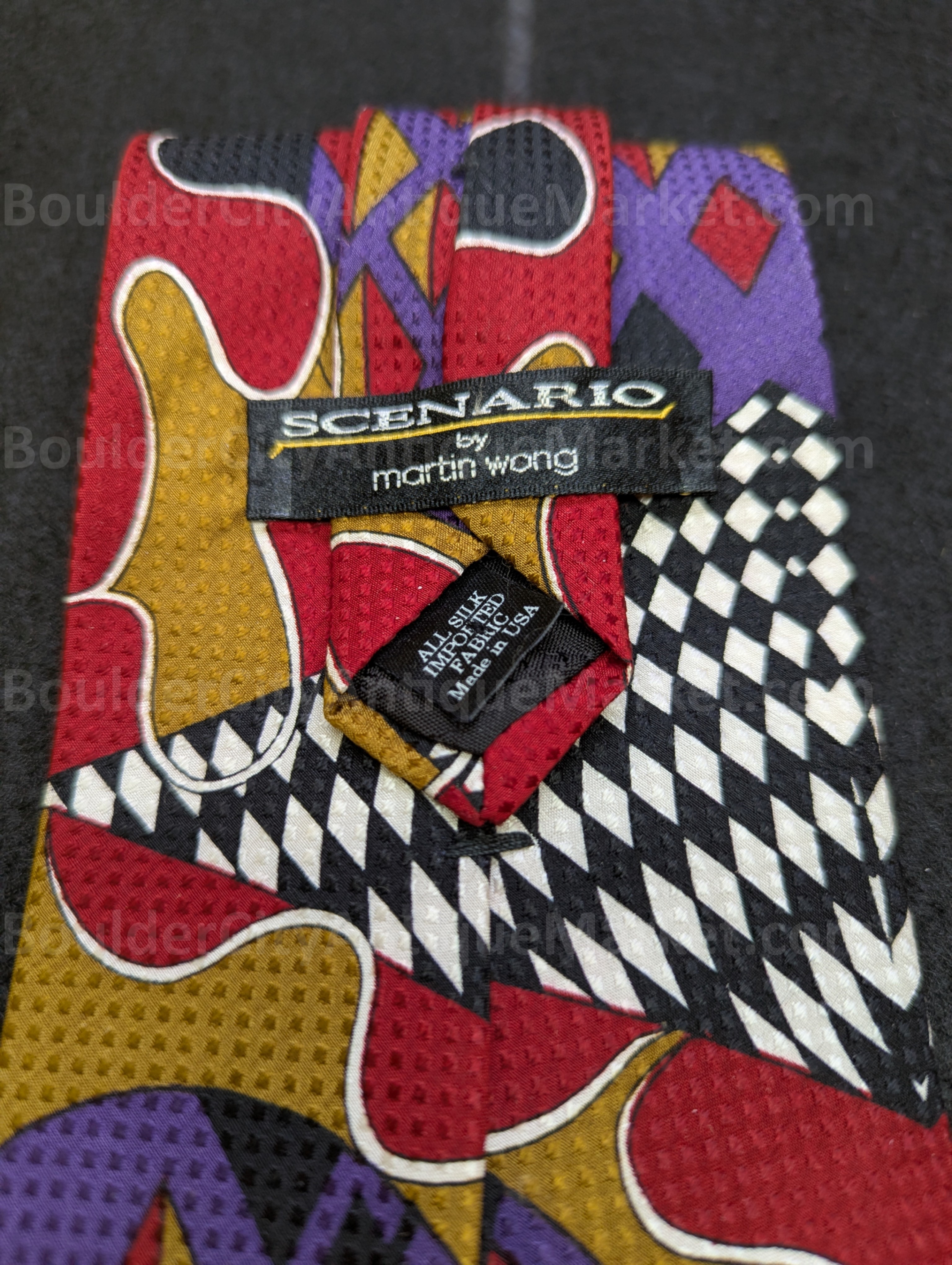 Black, white, red, purple and tan Scenario tie by Martin Wong with and interesting waffle pattern throughout. 100% silk.