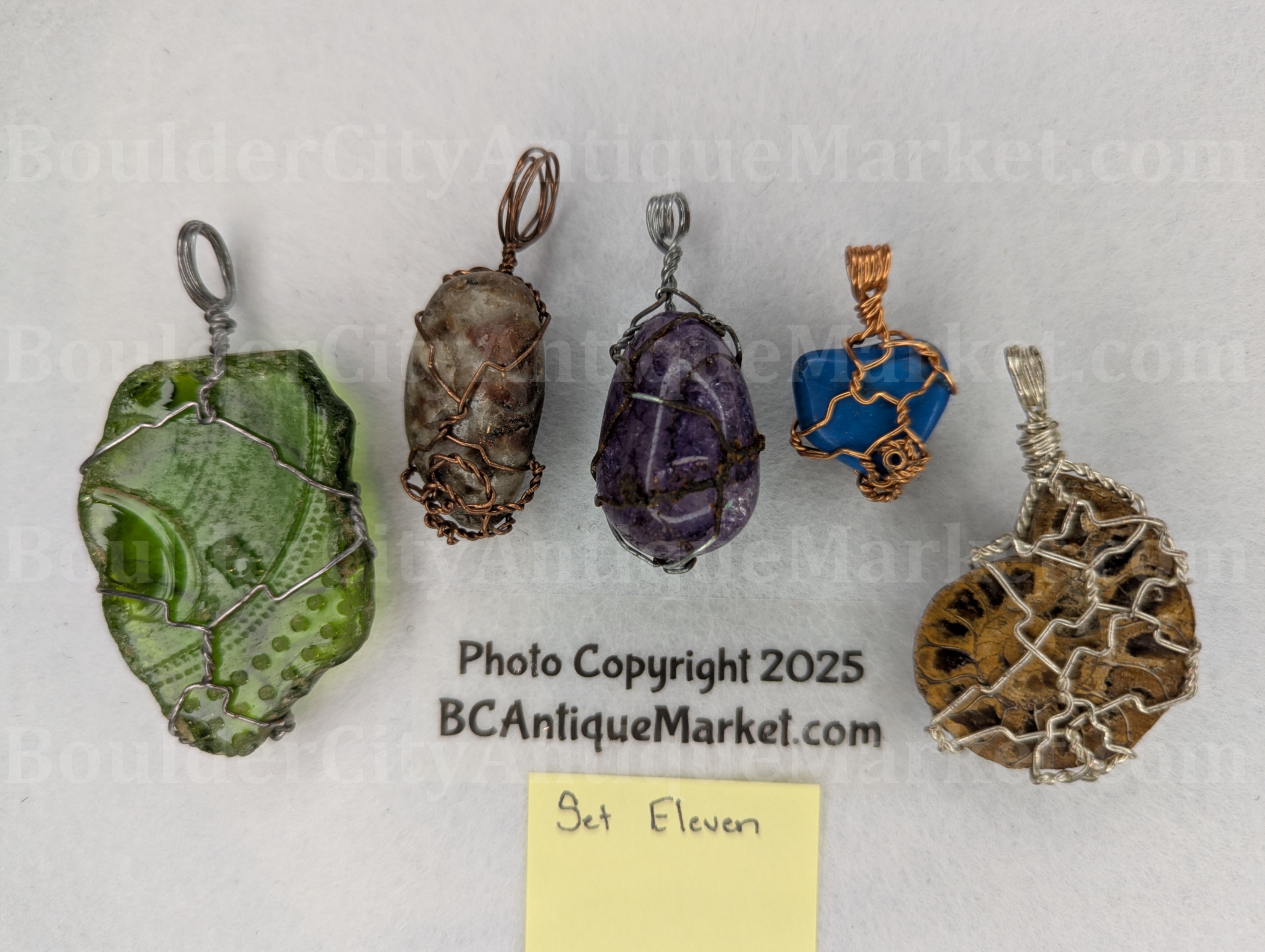 Five wrapped pendants, please see pictures for details. Large green pendant is bottle glass, others are stones.