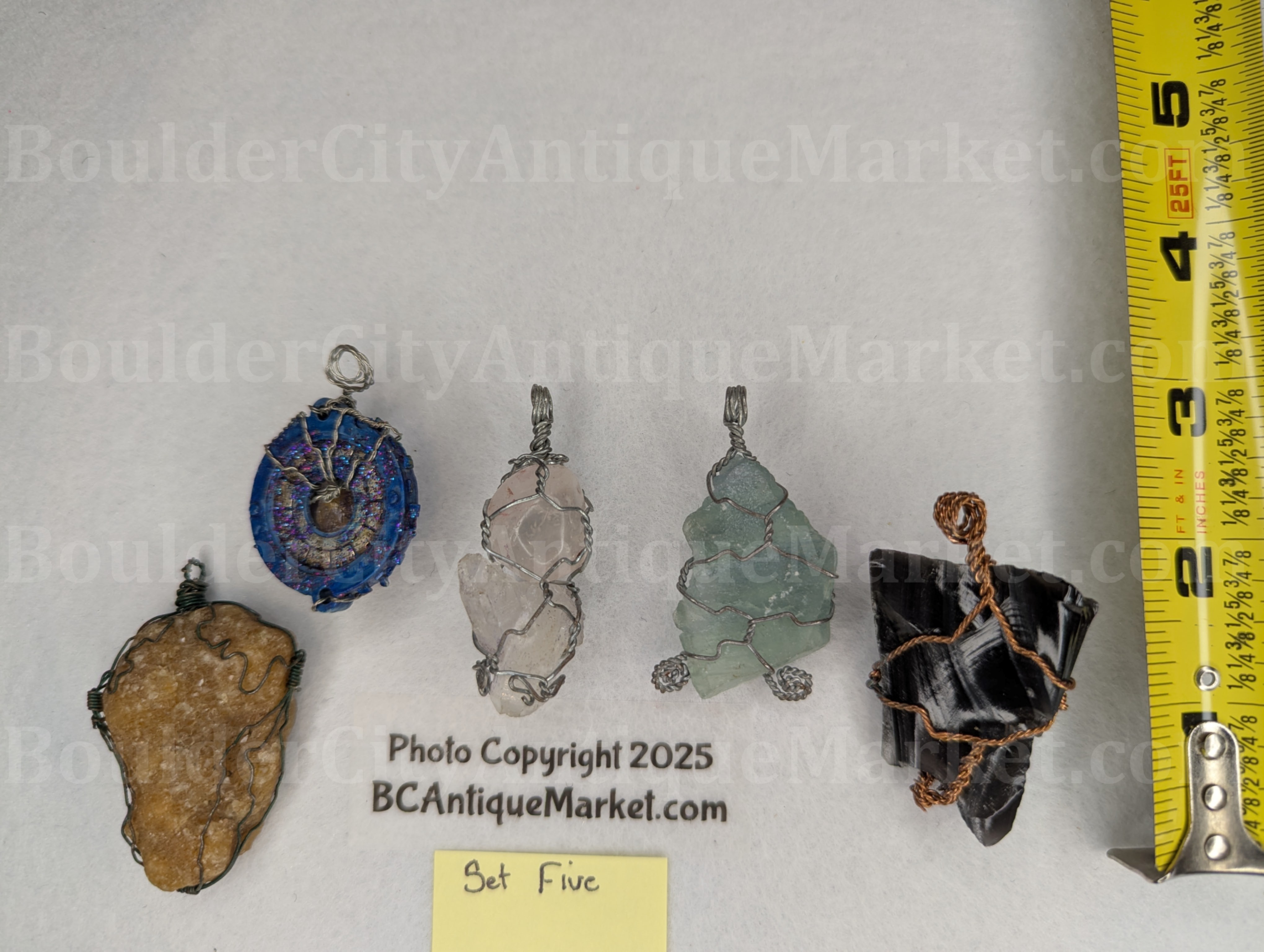 Five wrapped pendants, please see pictures for details. Four pendants are stone, one is mixed media.